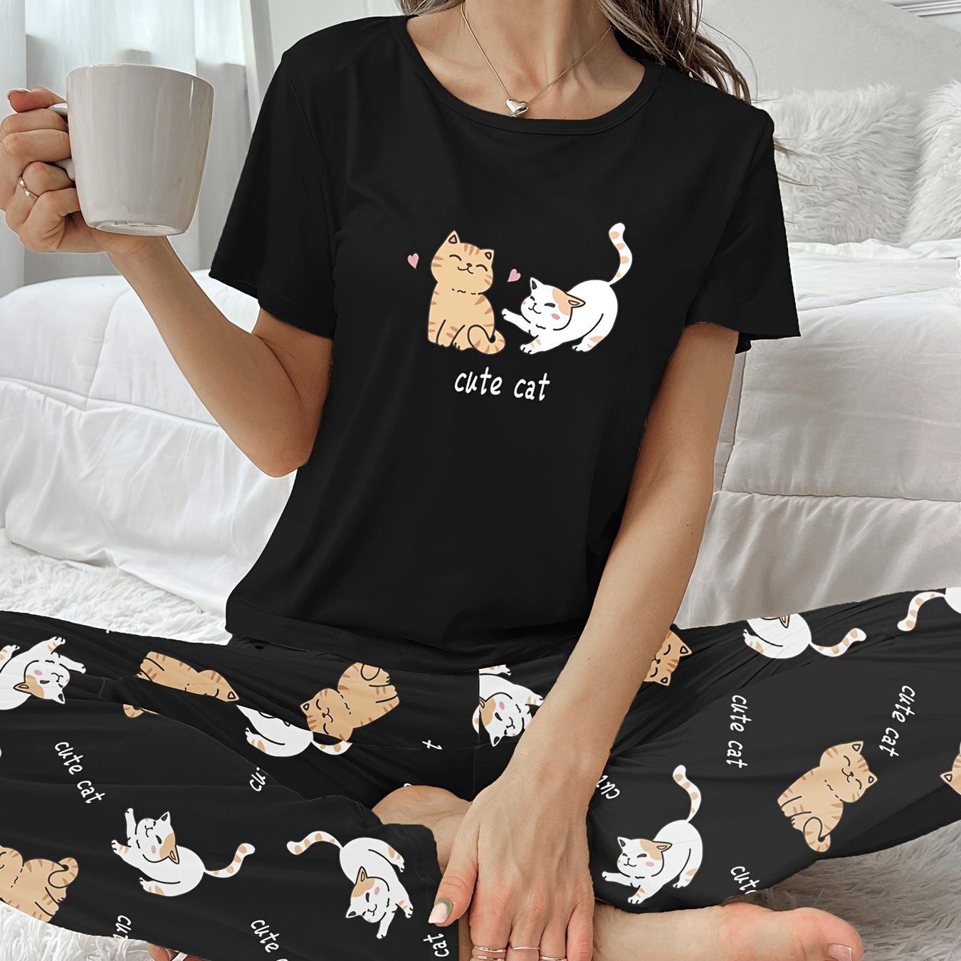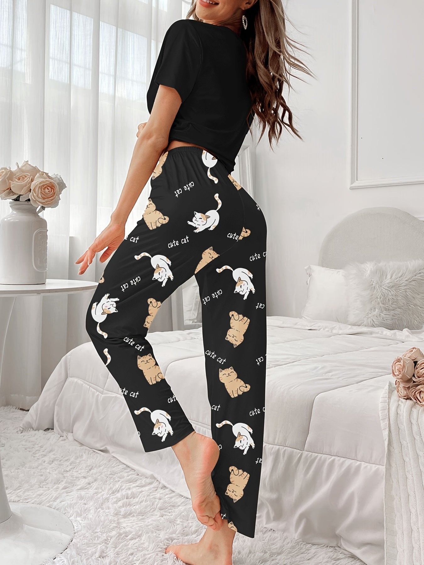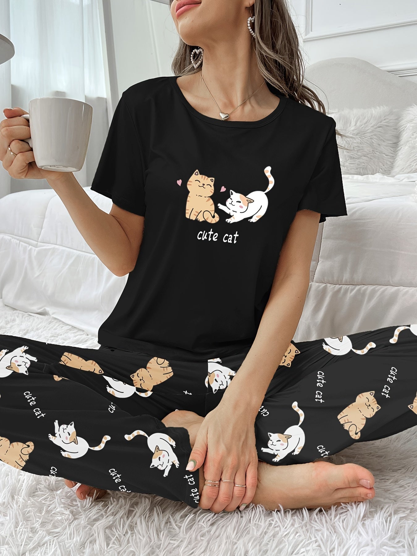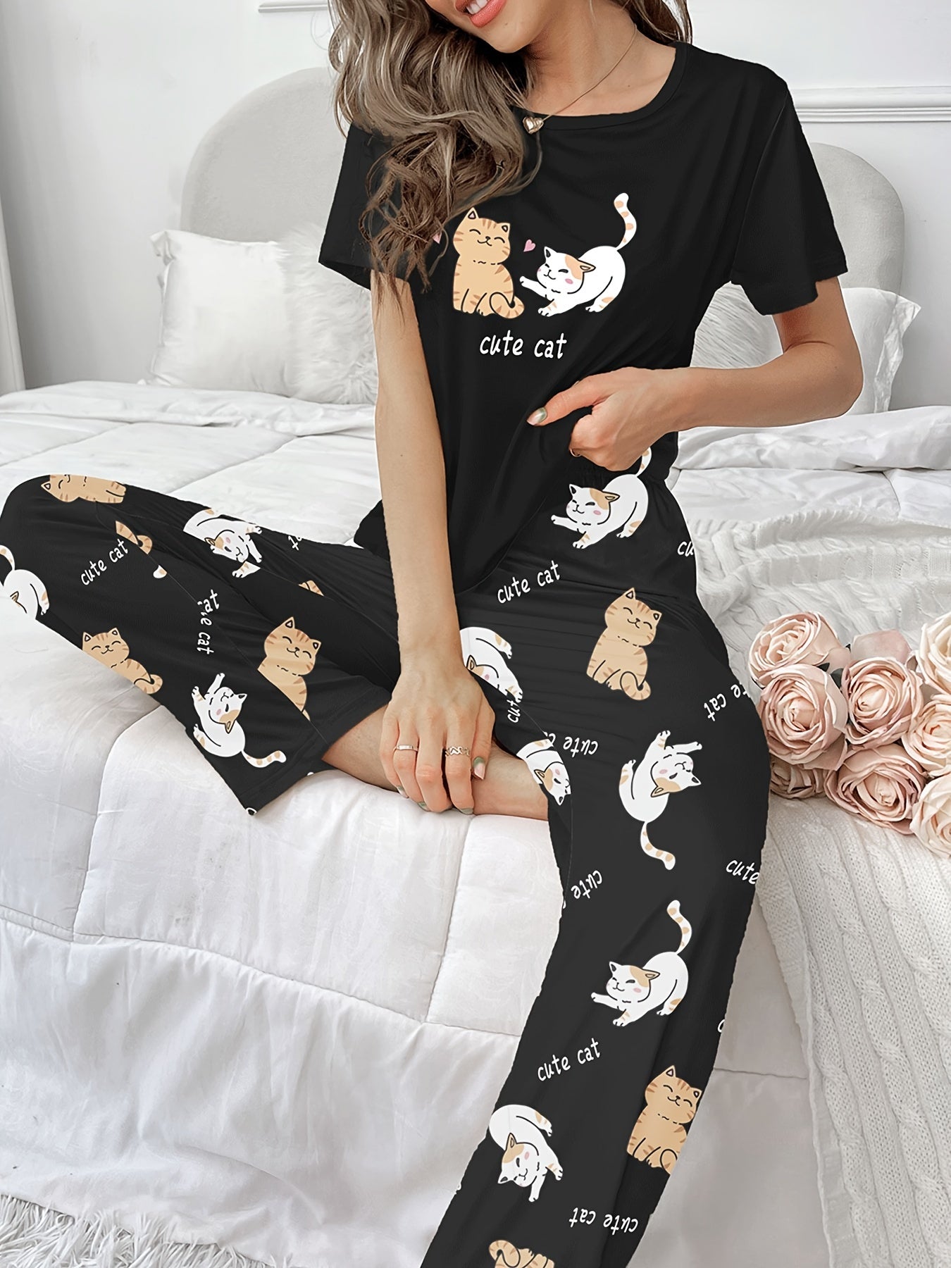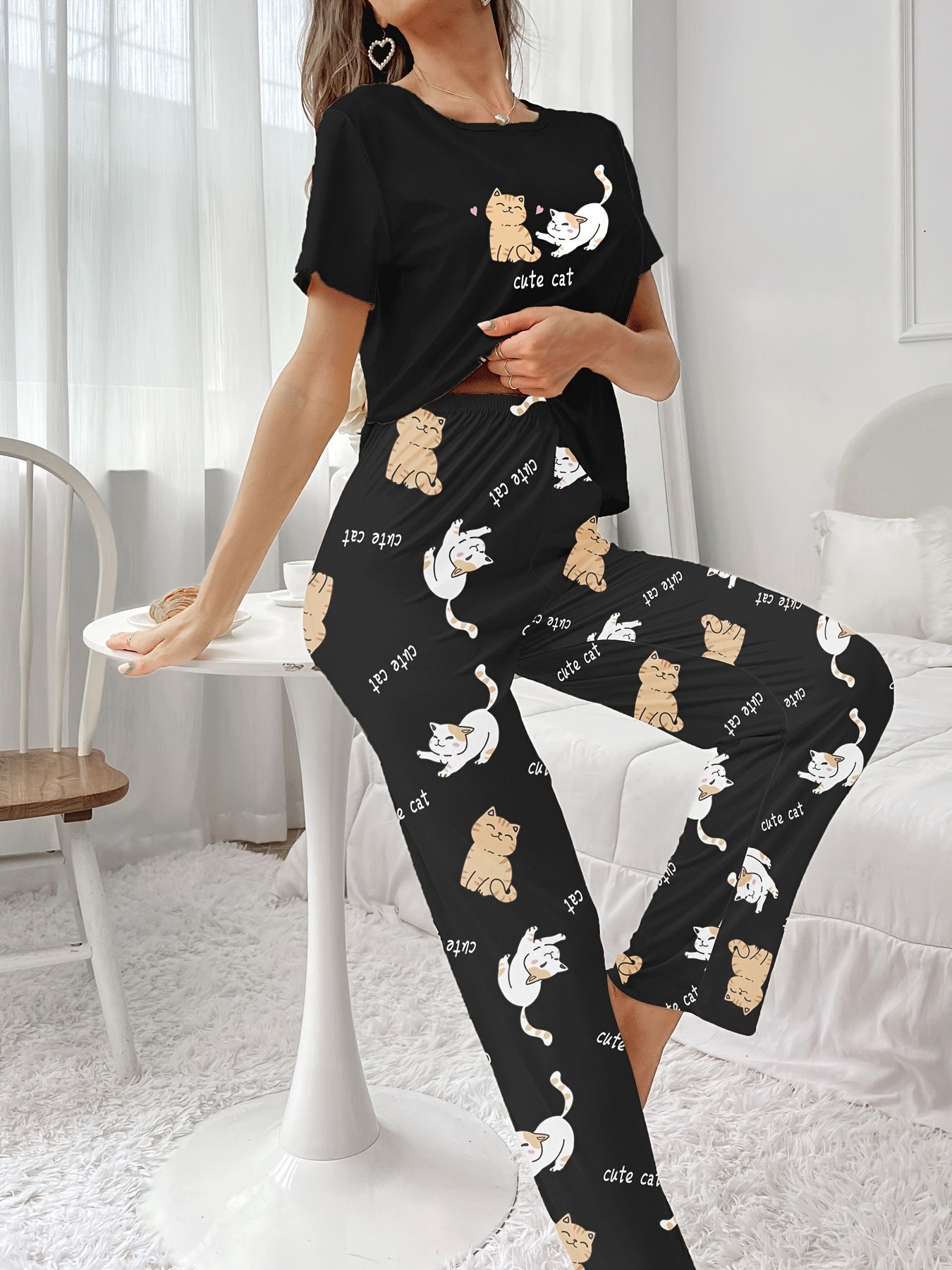 Ayollar uchun mushuk va harf bosma pijama to'plami - Qisqa yengli yuqori va shimlar, erkin kesim
