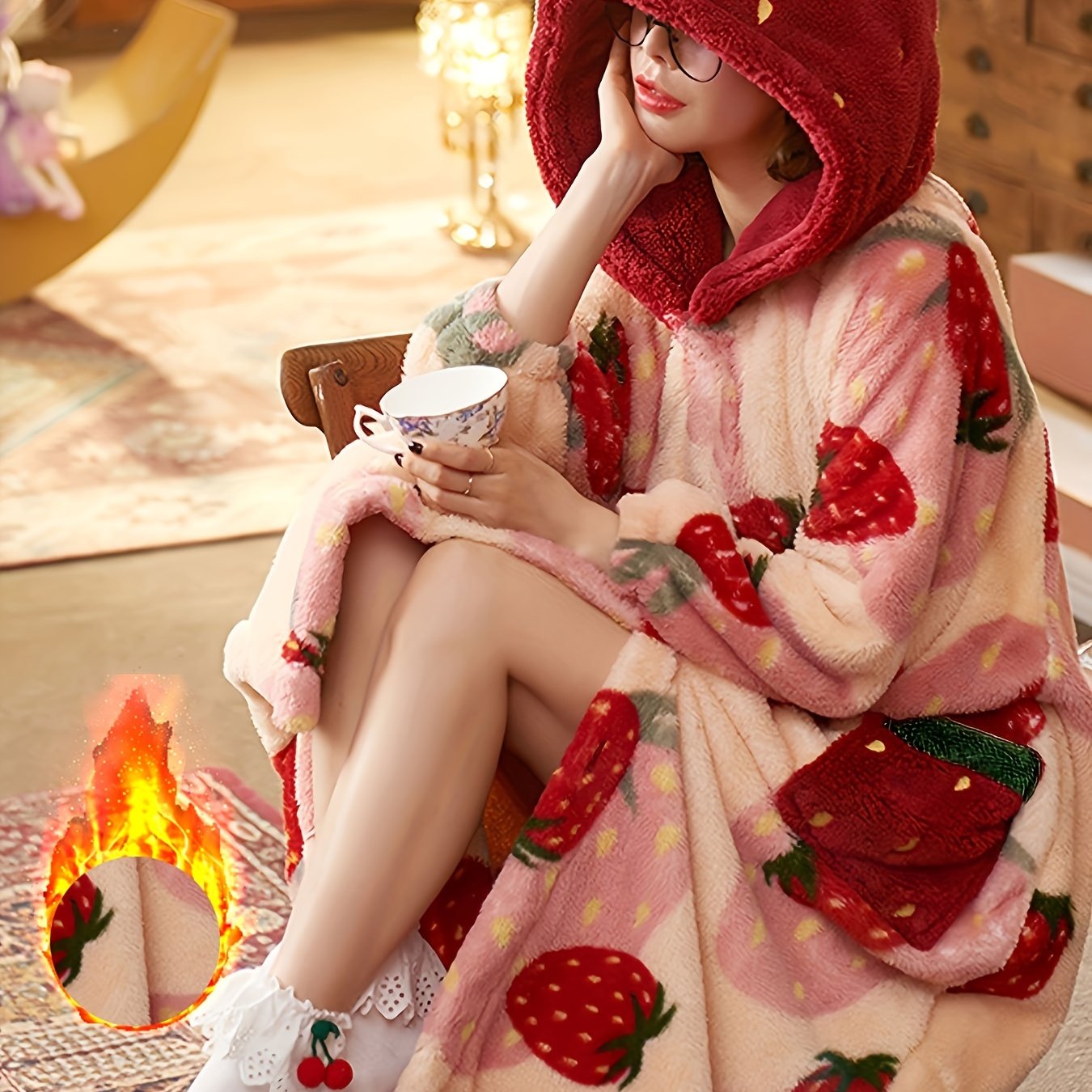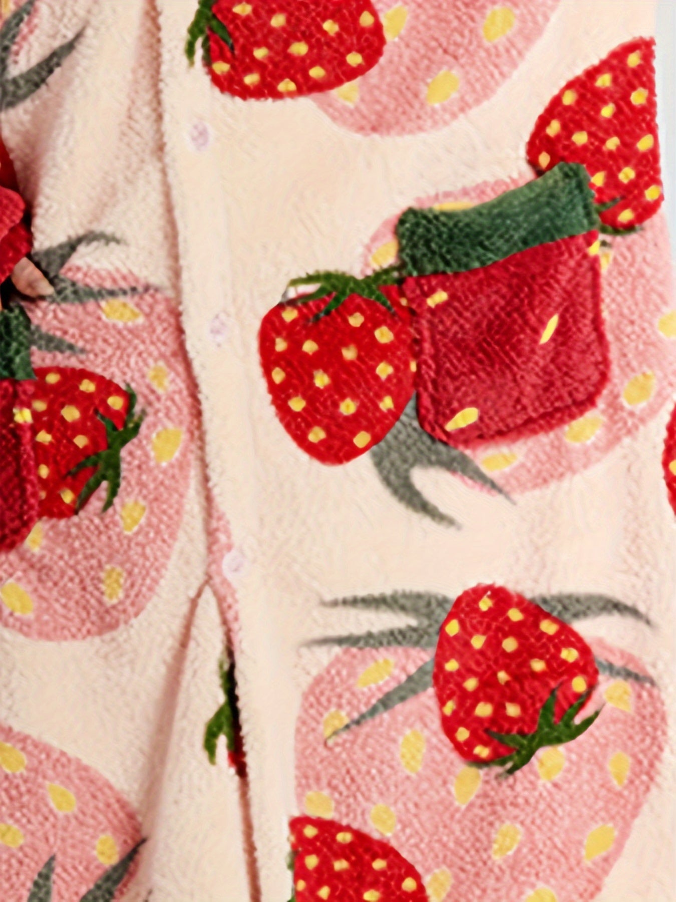 Ayollar uchun qulay qulupnay naqshli bathrobe, 100% polyester koral to'quvdan tayyorlangan, keng kesimda, yoqimli meva va sabzavot naqshi, mashinada yuvish mumkin, kuz/qish uchun mukammal.