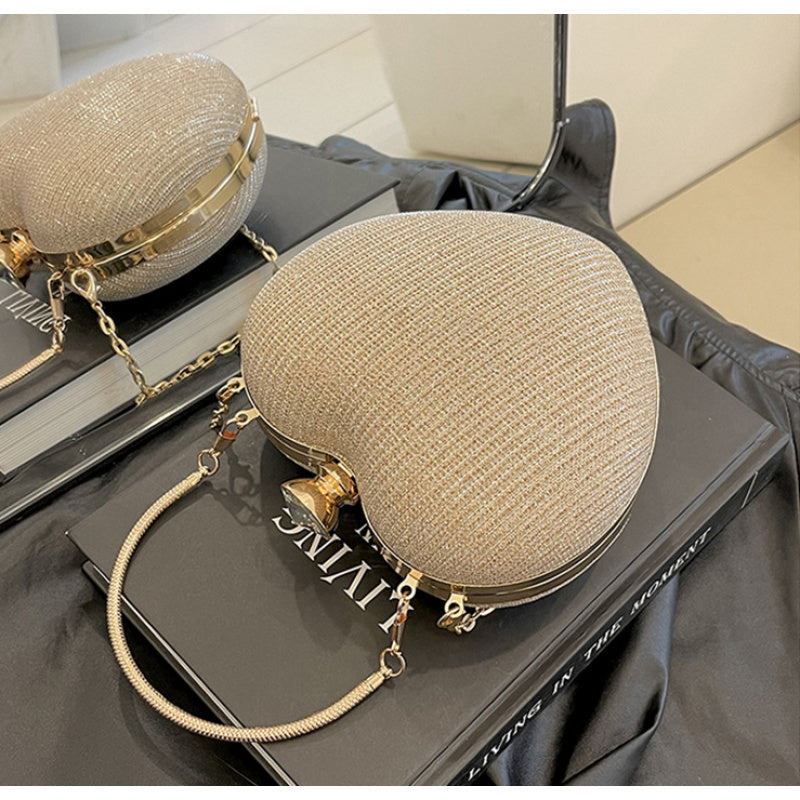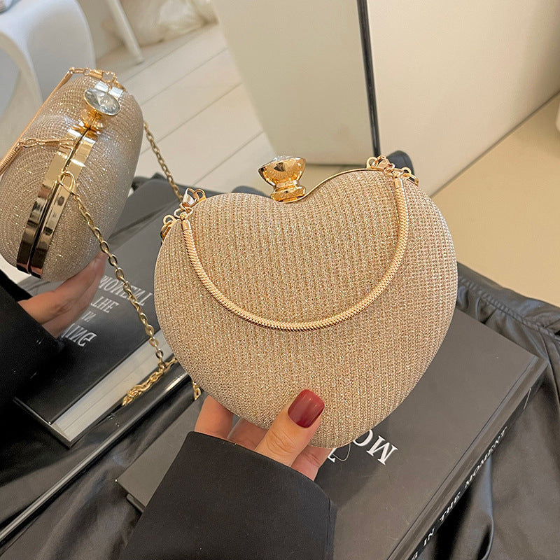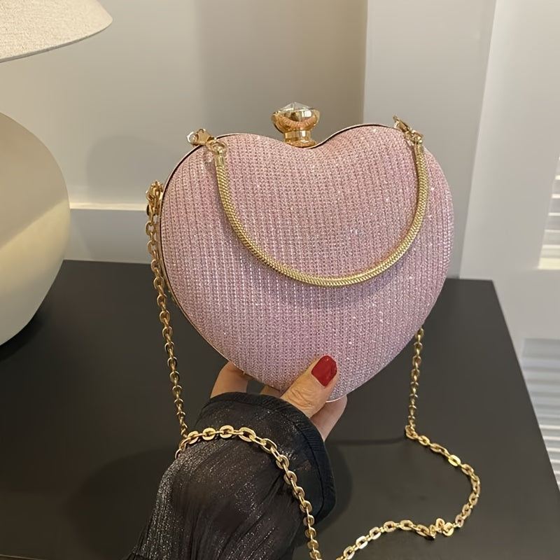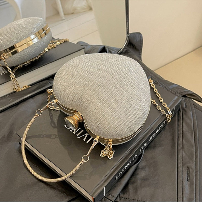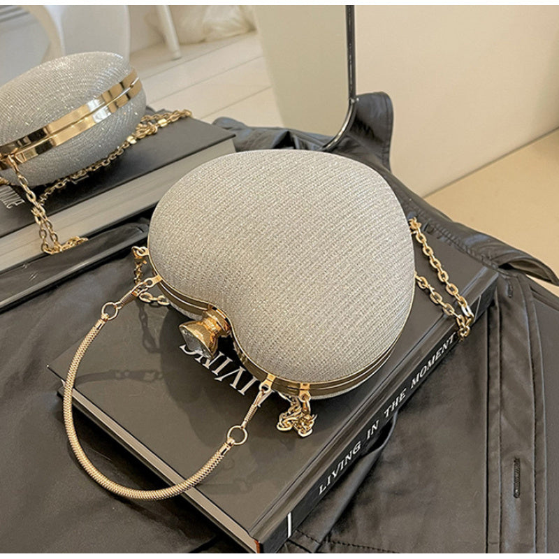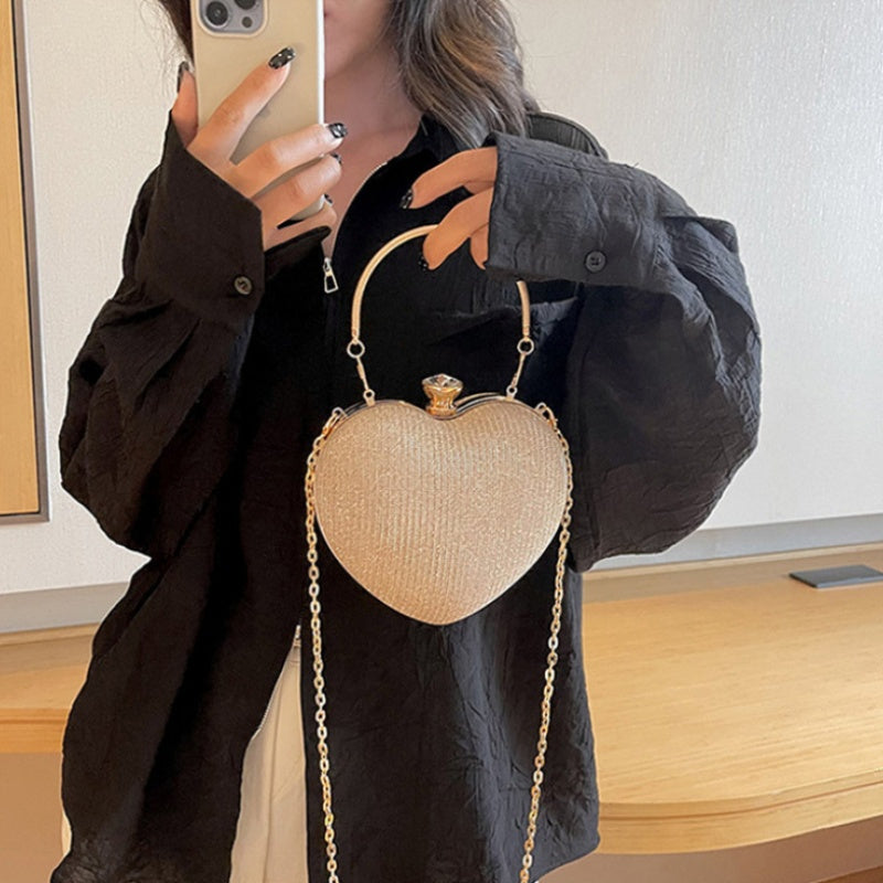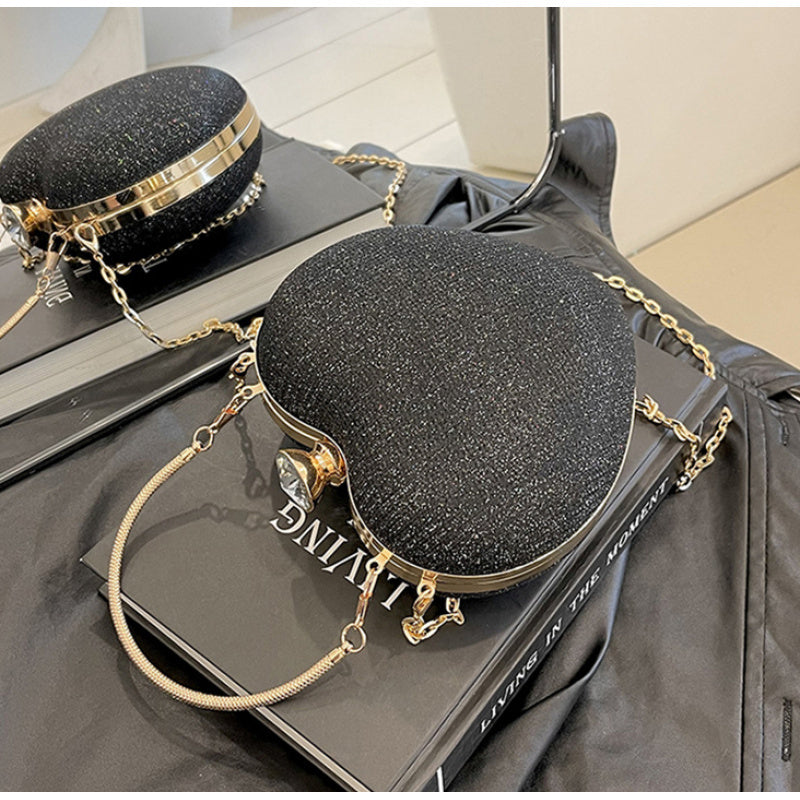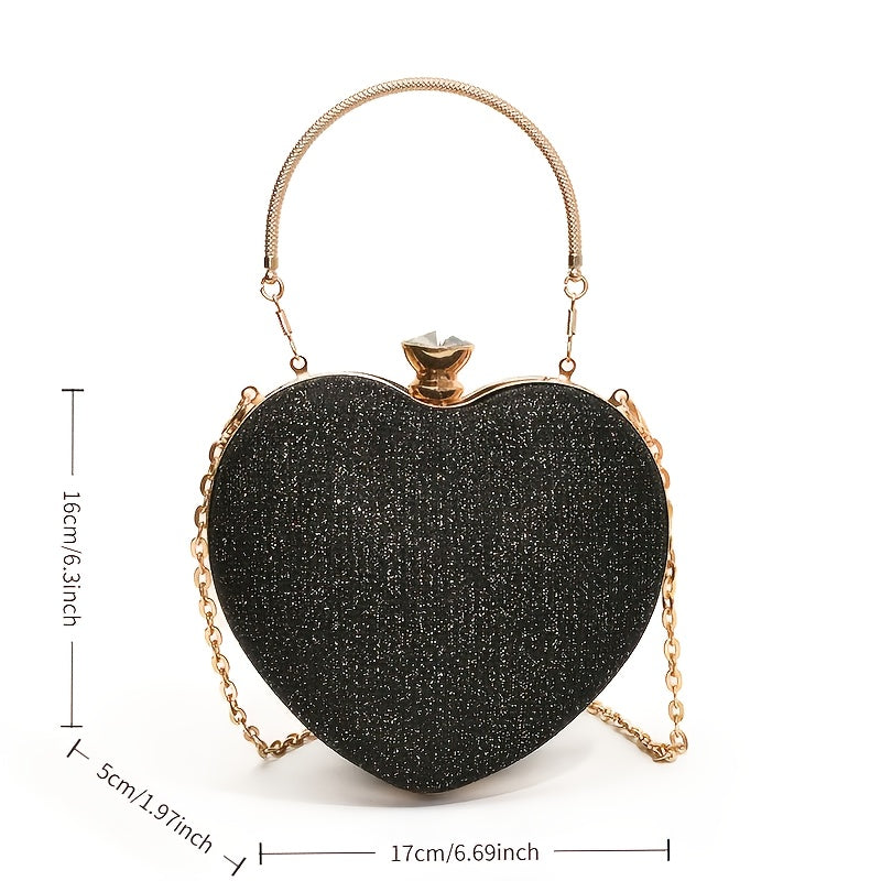 Ayollar uchun zamonaviy qora kesma sumka, porloq zanjir, yurak shakli, metall bezaklar, tugmachali yopiq, partiya, to'y, uchrashuv uchun.