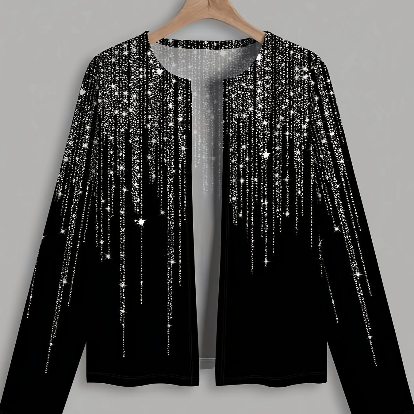 Ayollar uchun zamonaviy galaktika naqshli, yengsiz ochiq old qismli kardigan, polyester to'qima matodan tayyorlangan. Ushbu ingichka jakket biroz cho'ziluvchan va 2024 yil bahor/kuz modasi uchun mukammal.