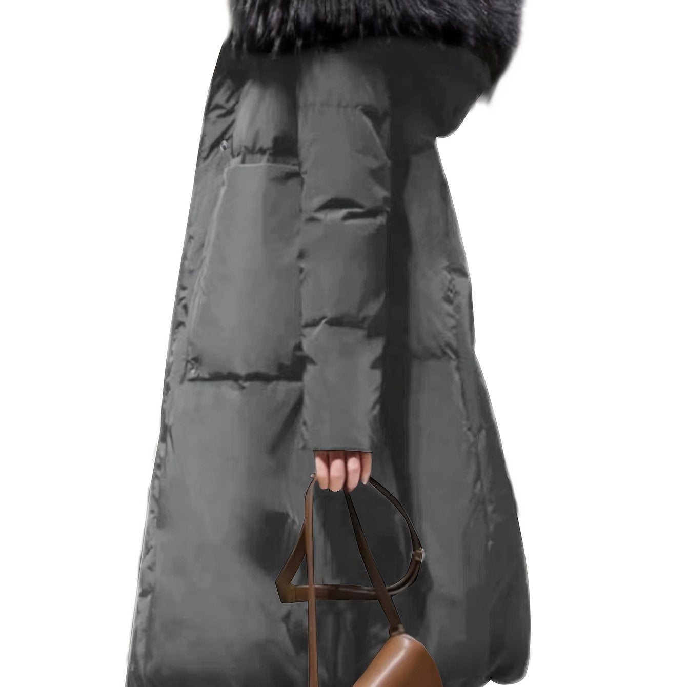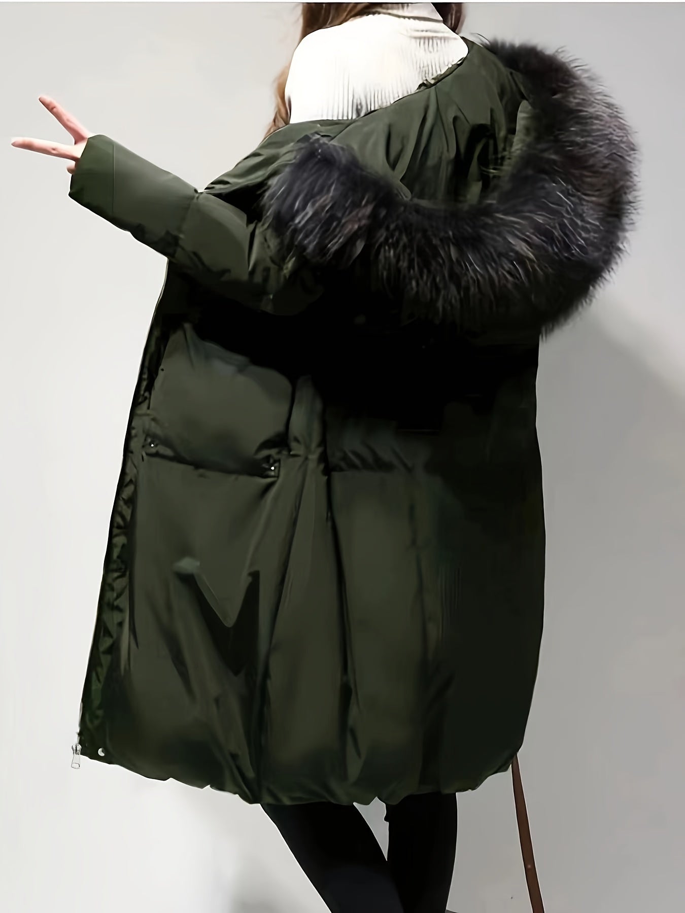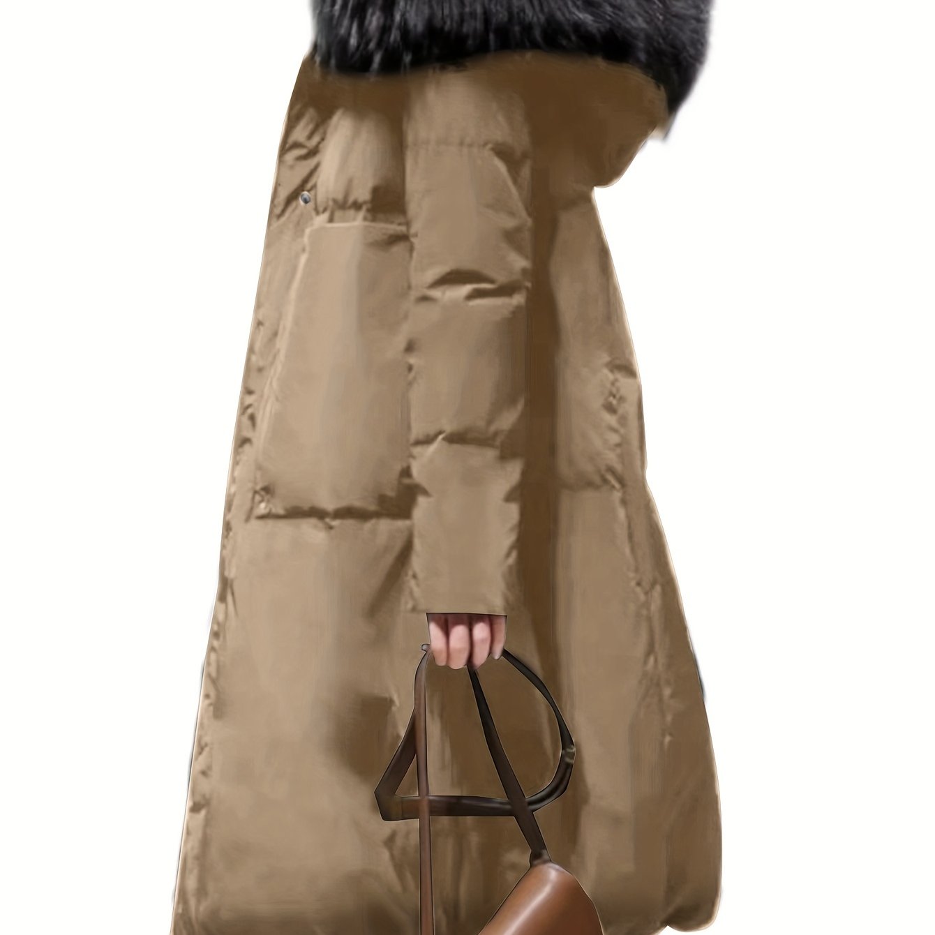Ayollar uchun nafis uzun qishki kaput, soxta mo'yna trim bilan, oldidan zip-up, va sovuq ob-havo uslubi uchun yon cho'ntaklar.