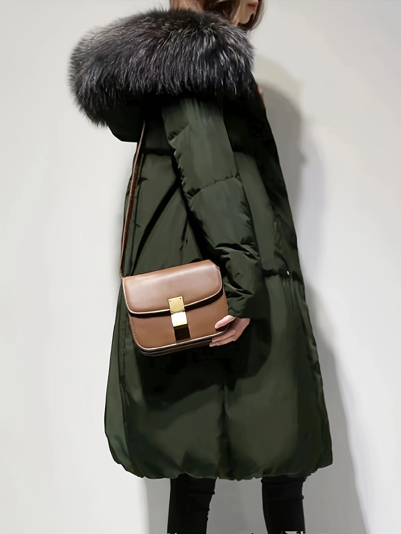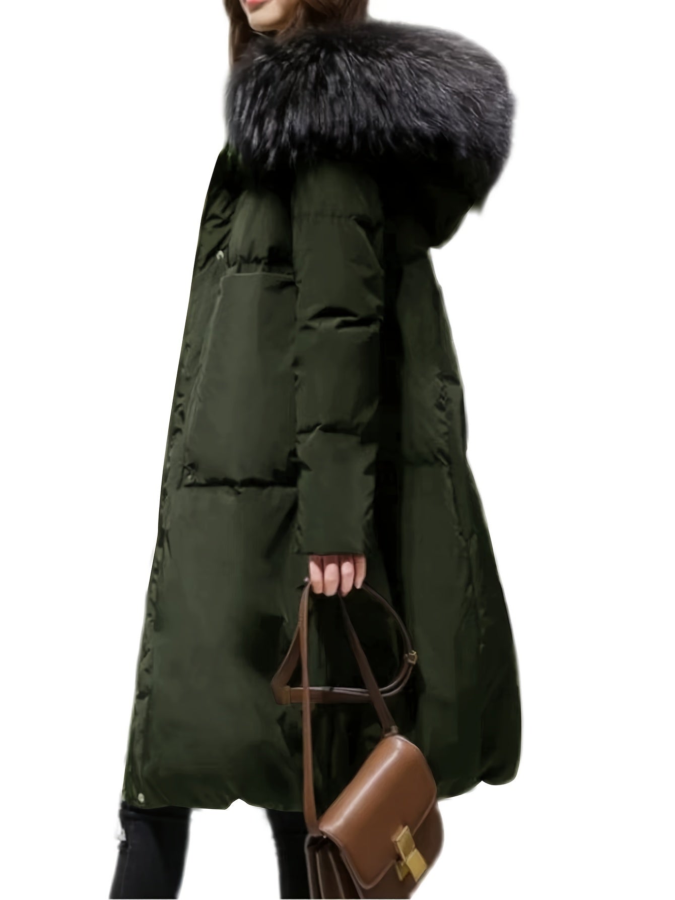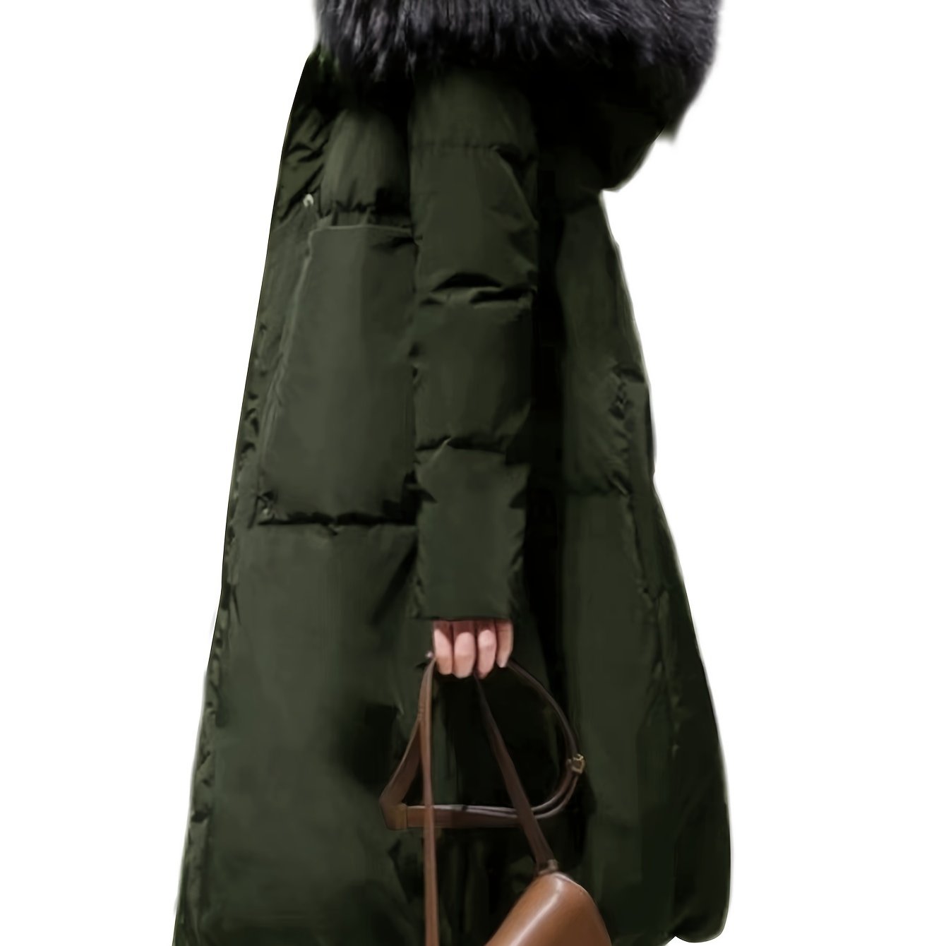 Ayollar uchun nafis uzun qishki kaput, soxta mo'yna trim bilan, oldidan zip-up, va sovuq ob-havo uslubi uchun yon cho'ntaklar.