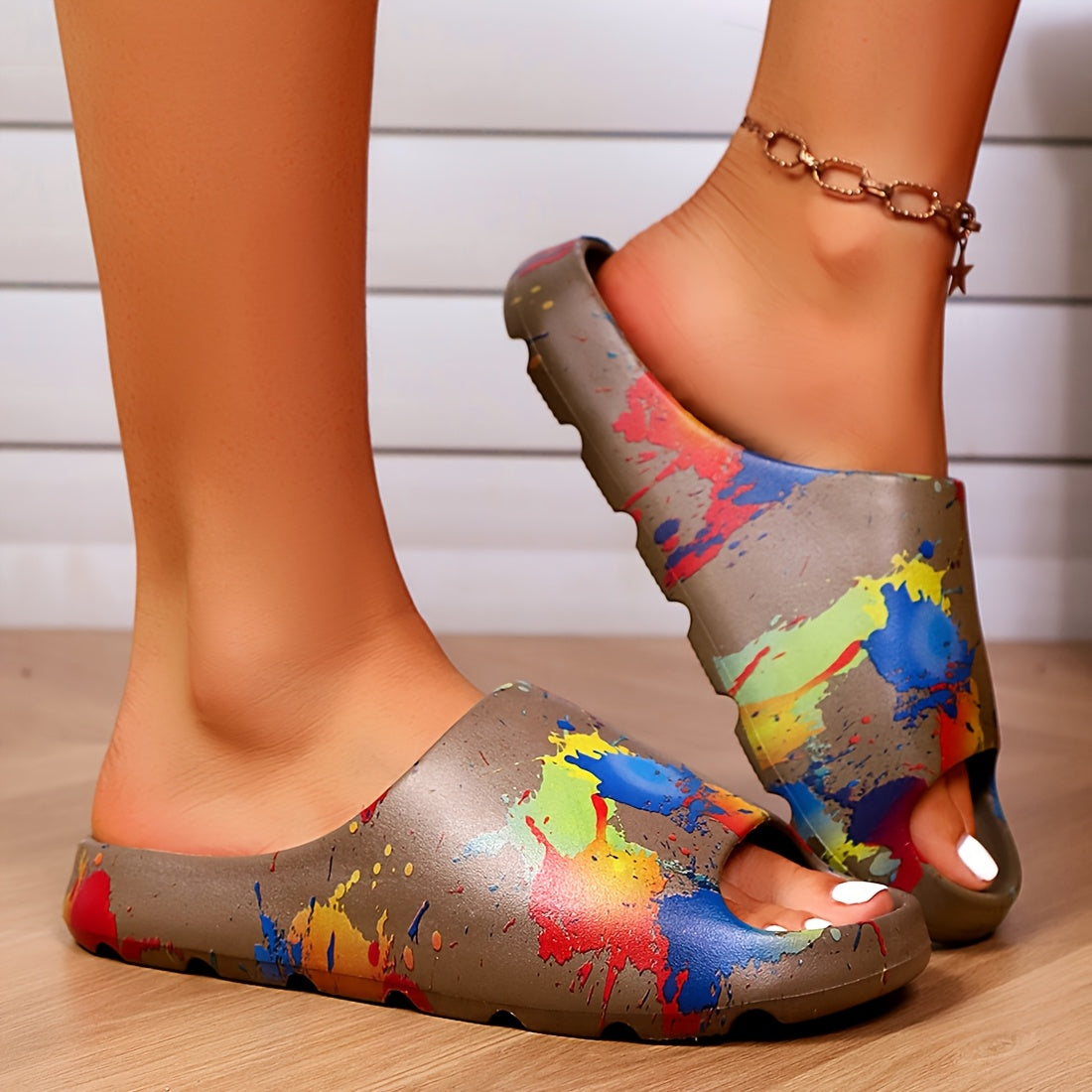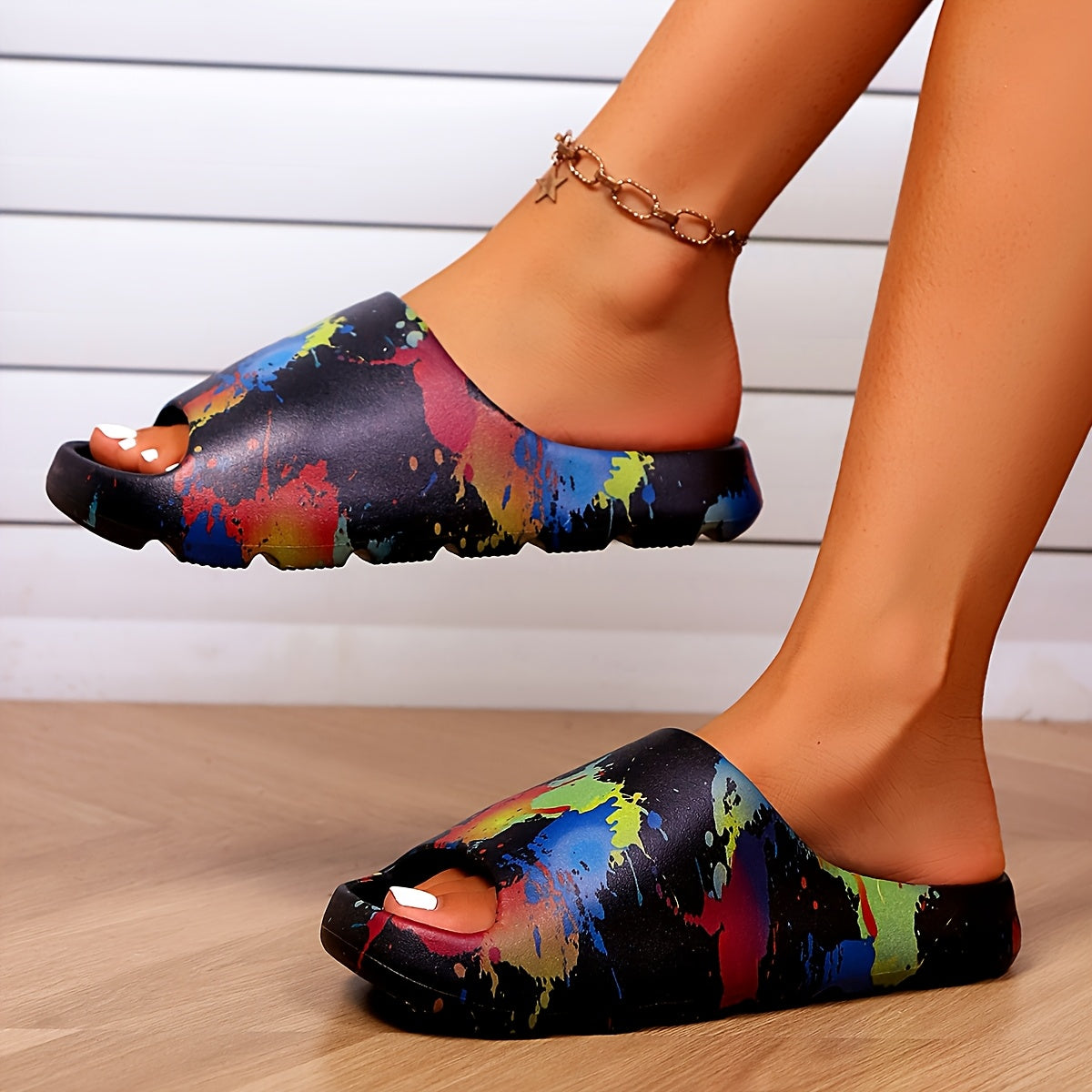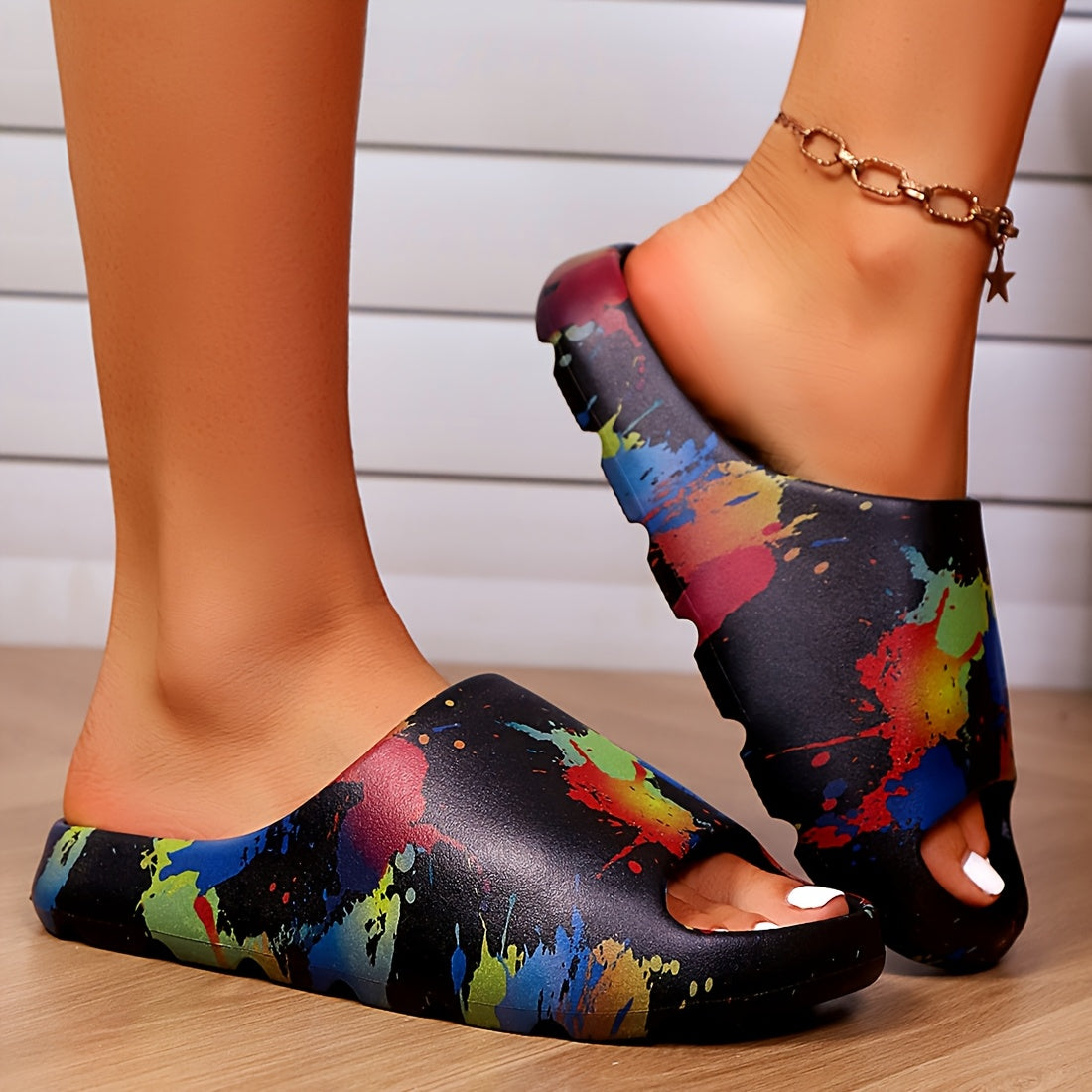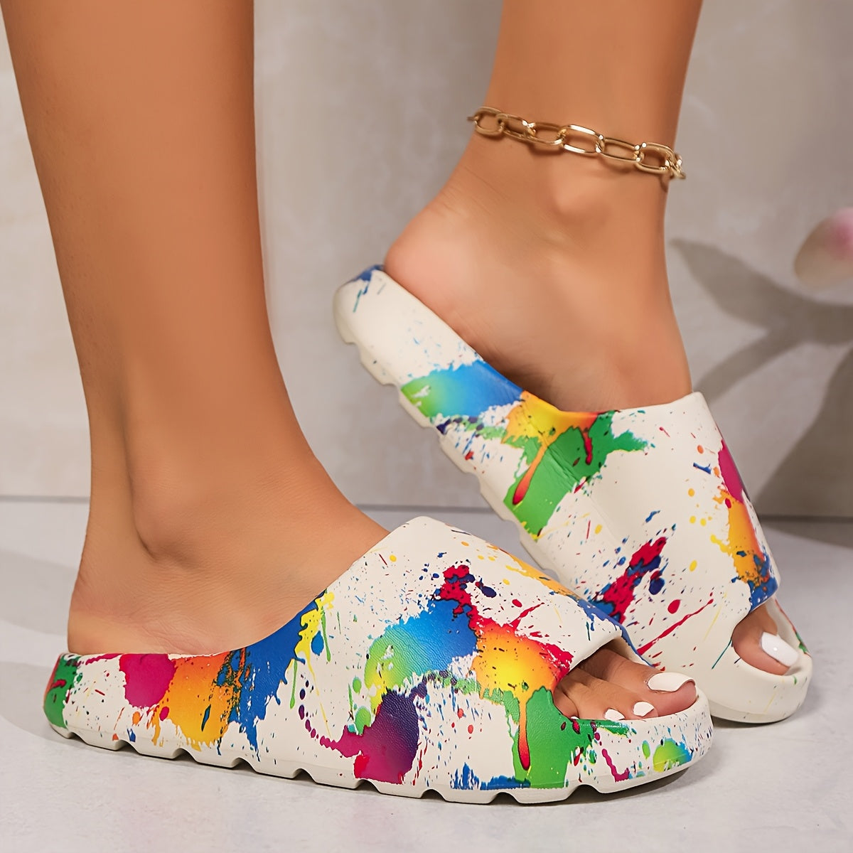 Ayollar uchun EVA slaydlar bo'yoq splash dizayni bilan ochiq barmoqli kundalik sandallar