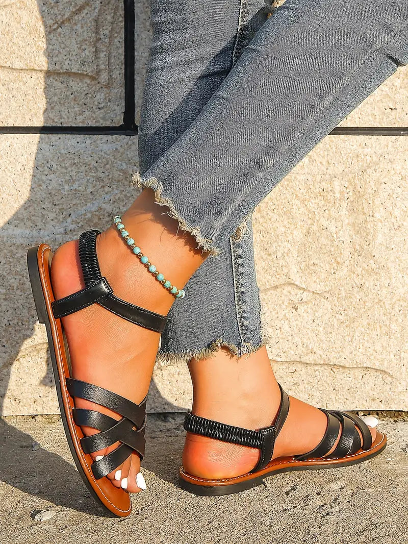 Women's Faux Leather Roman Flat Sandals Open Toe Non-Slip Strappy