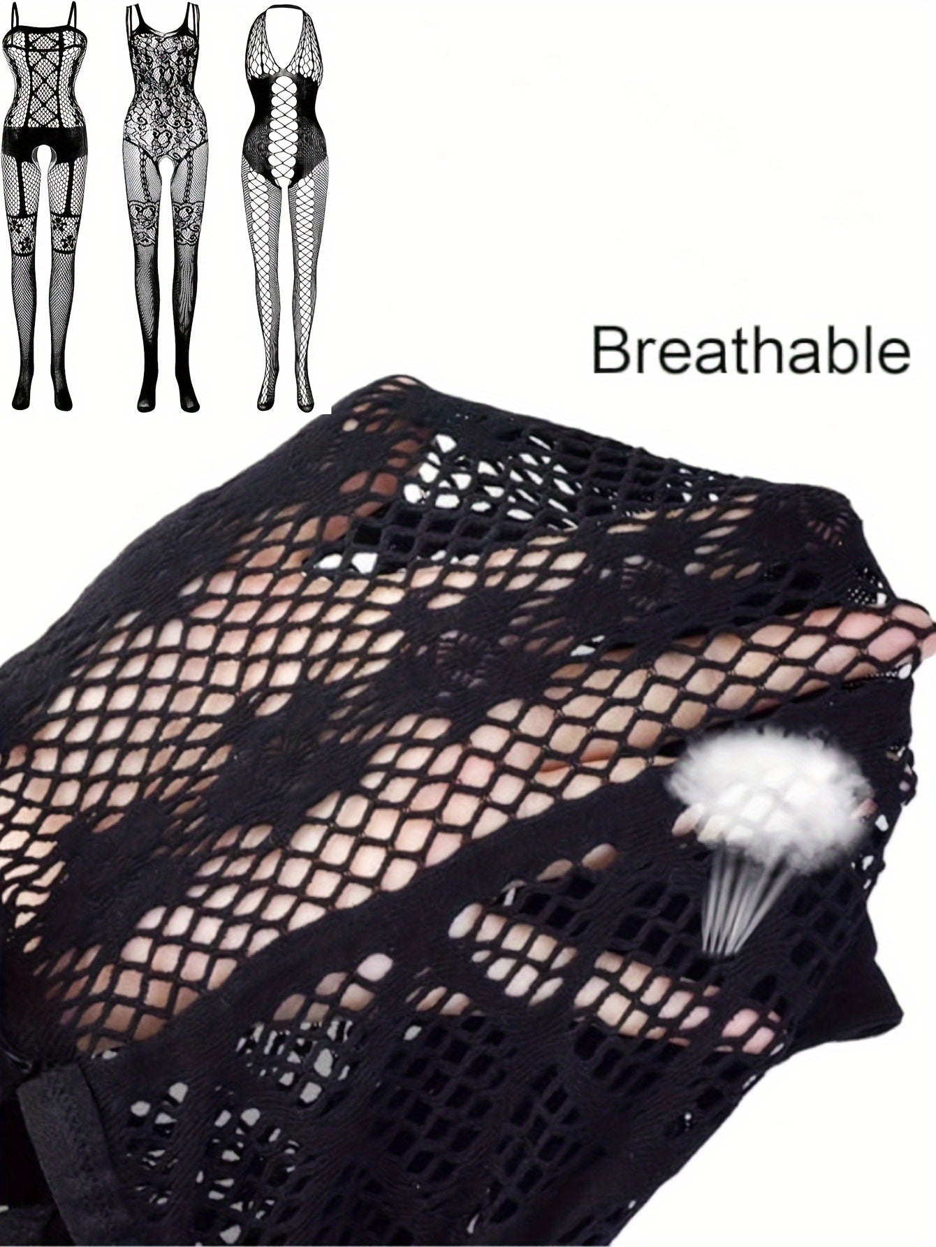 Ayollar uchun tarmoqli ichki kiyim to'plami, bodysuit, paypoqlar va sexy dantel dizaynida.