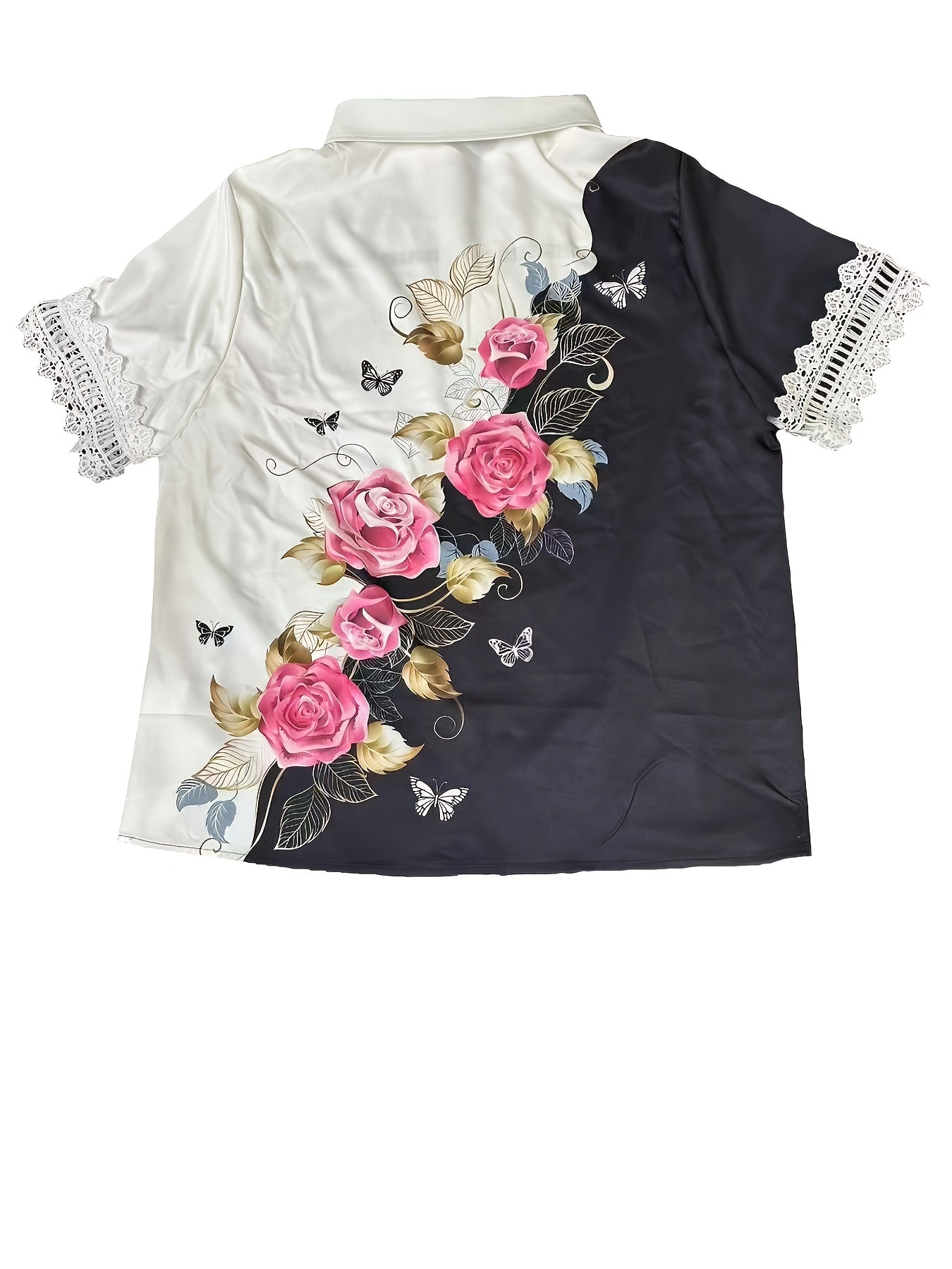 Ayollar uchun gul bosimli bluz, gipürli detallari bilan, qisqa sleeve, polyester, qora va oq