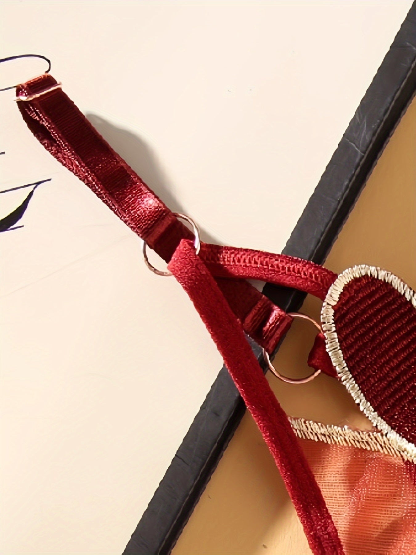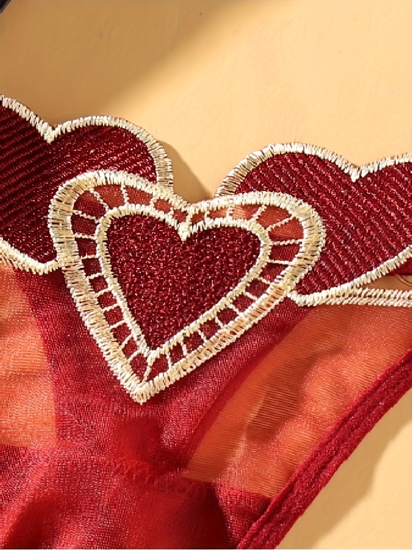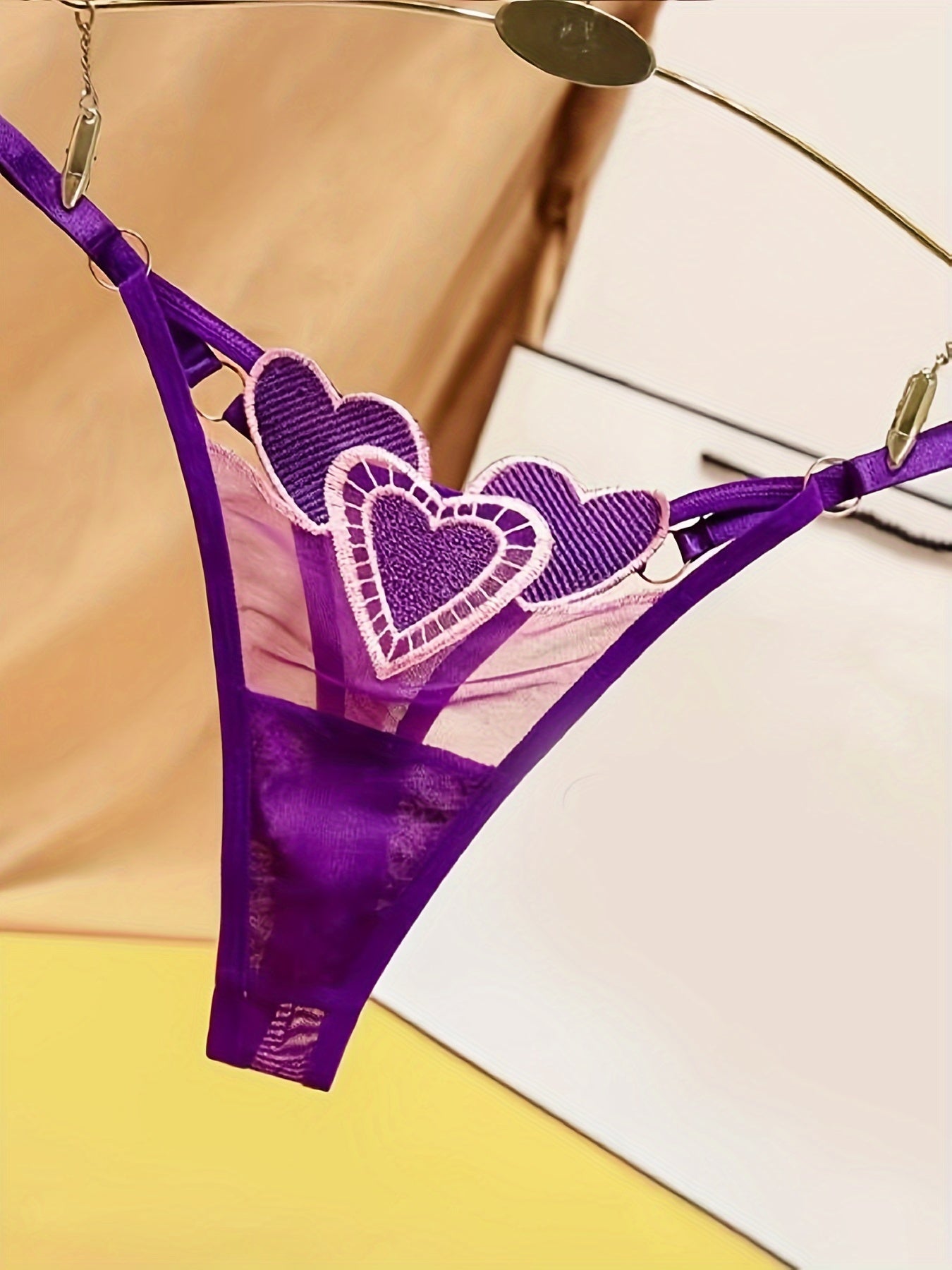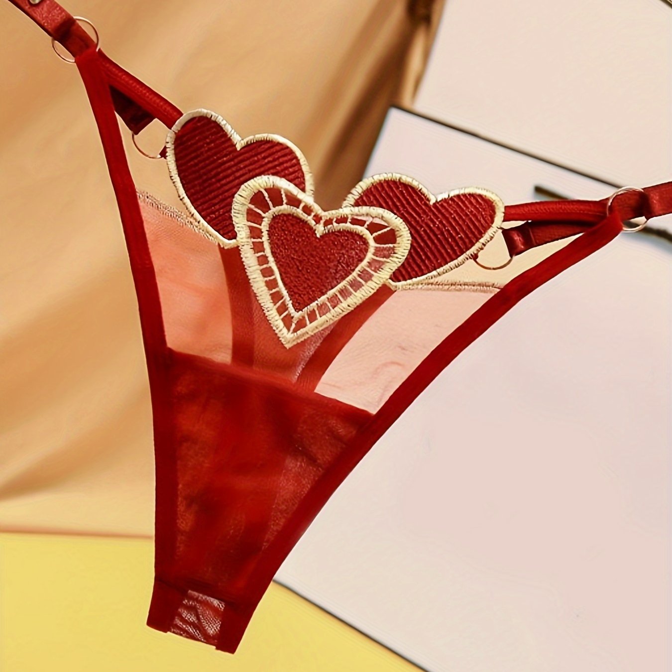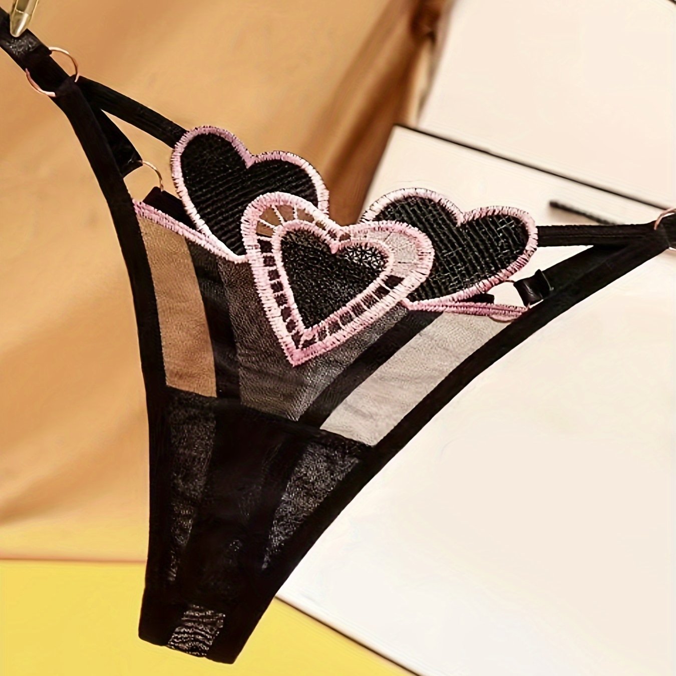 Ayollar uchun yurak naqshli thong ichki kiyim, moslashtiriladigan kattalashtirilgan o'lchamda, nafas oladigan to'r va jozibali to'qima bilan. Past bel, tungi klub uslubi, polyester materialda, S/M/L o'lchamlarida mavjud.