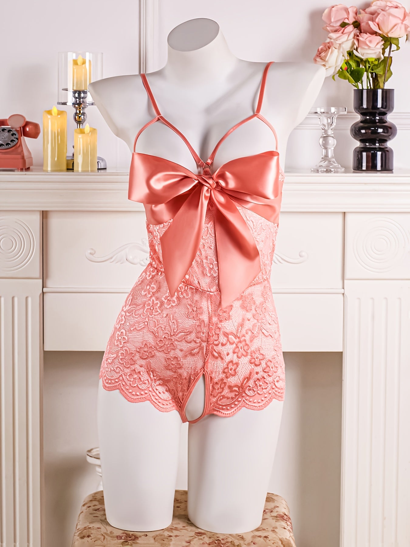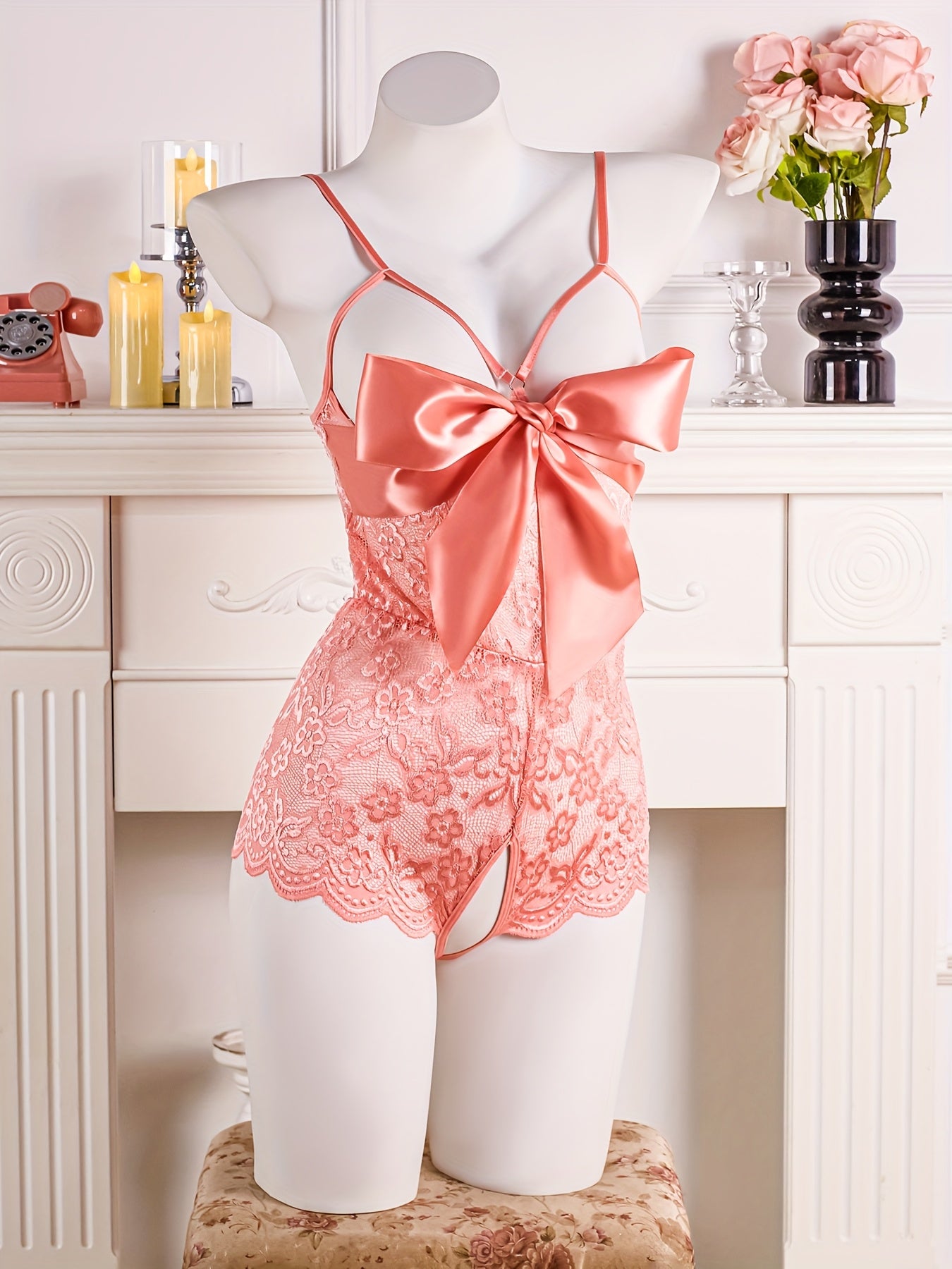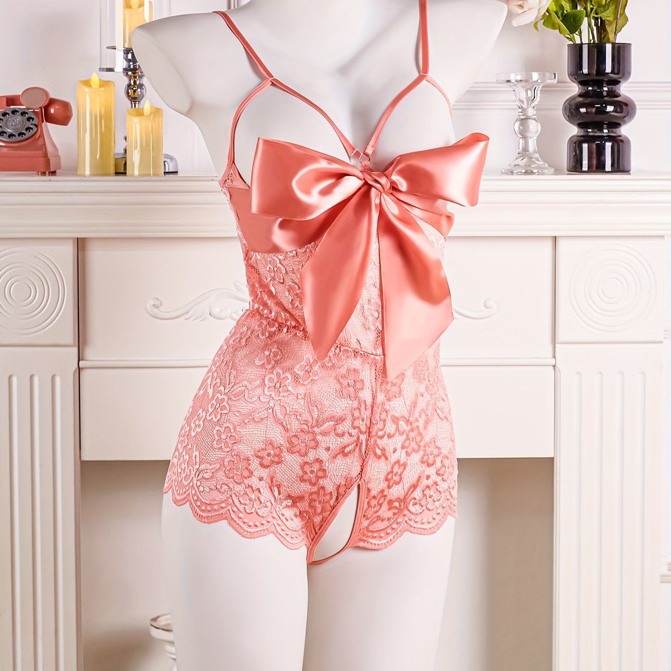 Ayollar uchun katta bo'sh joyli kamon bog'ichli dantel bodysuit, yengil qo'llab-quvvatlovchi mato, 88% poliamid va 12% elastandan tayyorlangan, to'ldirishsiz, 14-fevral uchun ideal.