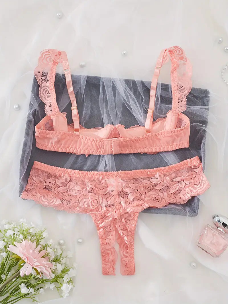 Ayollar uchun dantel ichki kiyim to'plami, ochiq qorinli shortiklar bilan.
