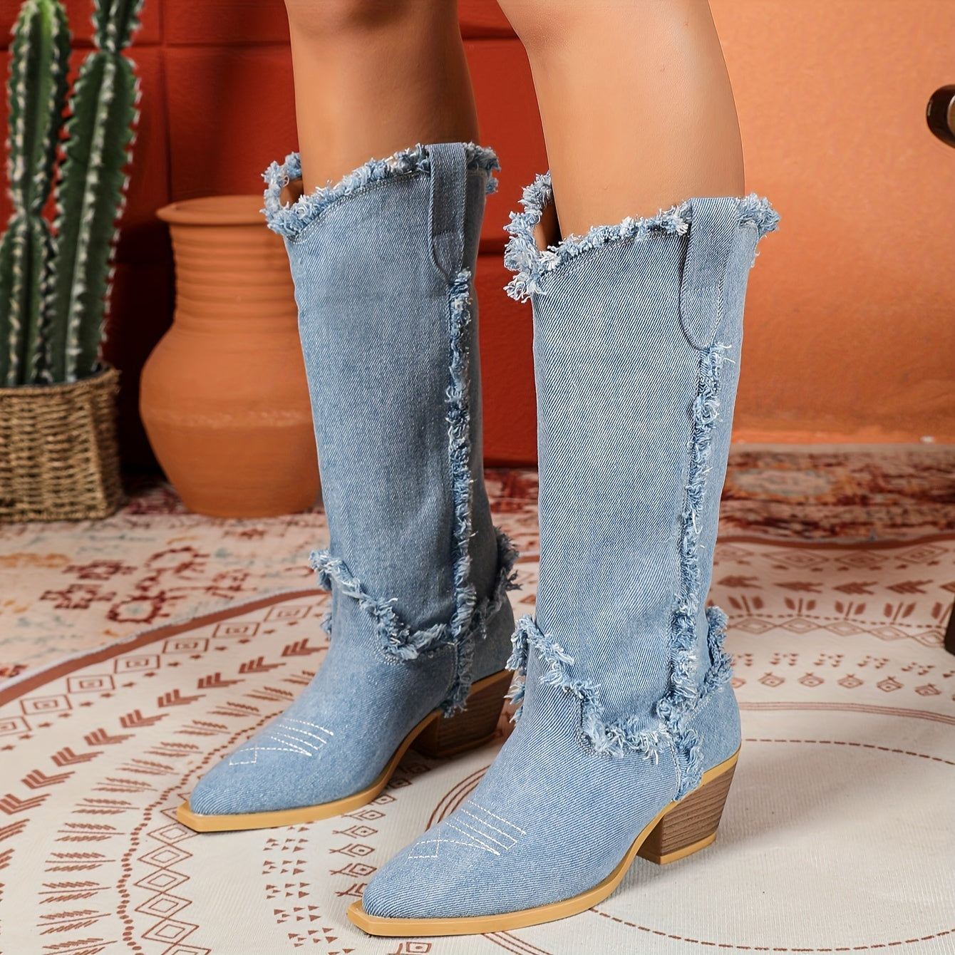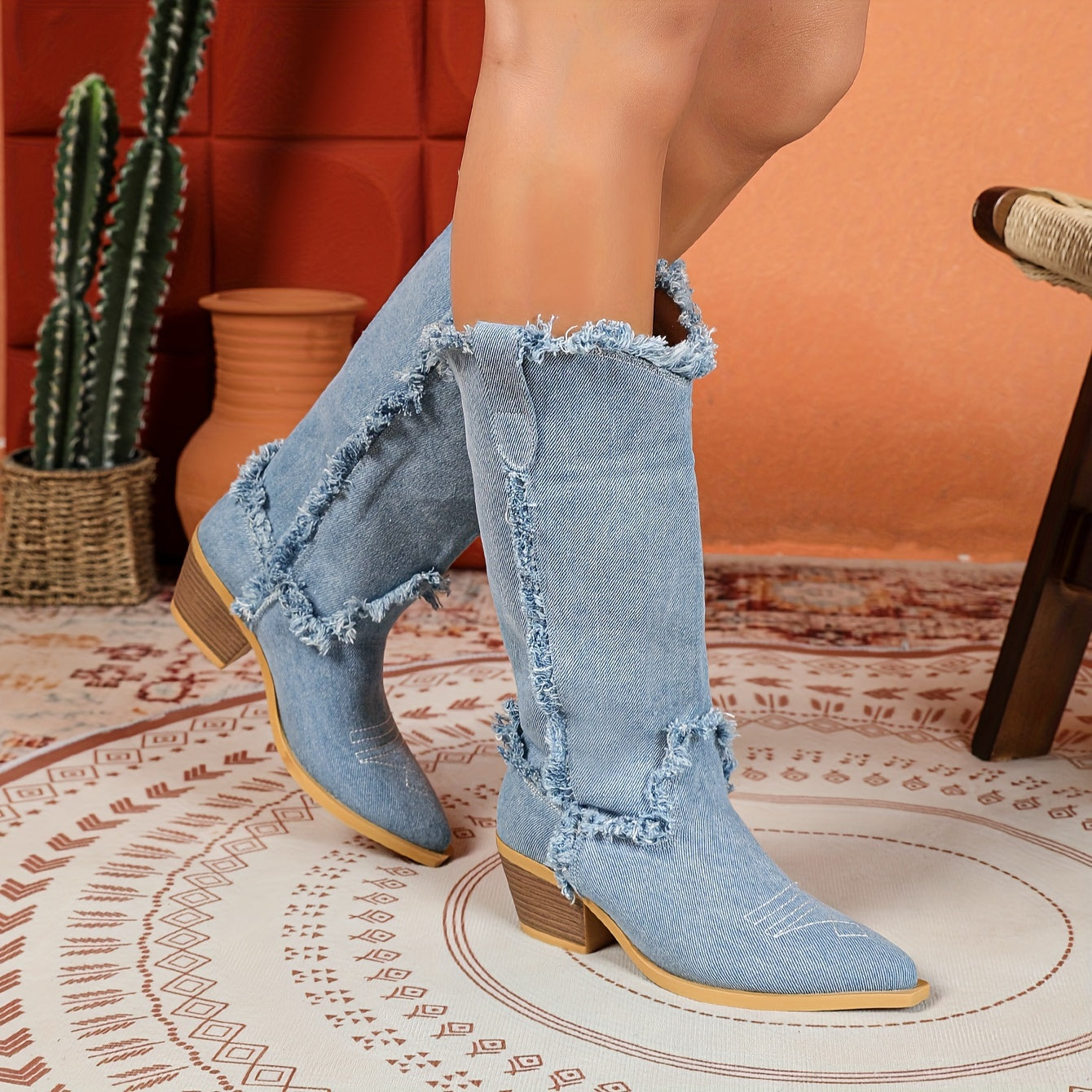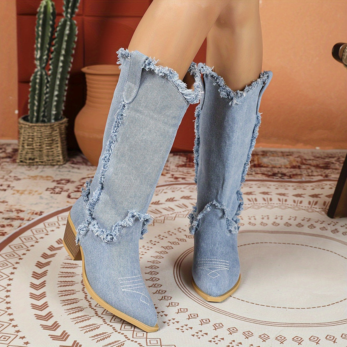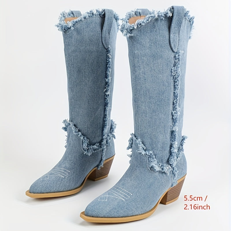 Ayollar uchun yengil ko'k o'rta uzunlikdagi g'arbiy botinkalar, oson kiyiladigan, nuqta barmoqli, qalin to'ntarli poyabzal