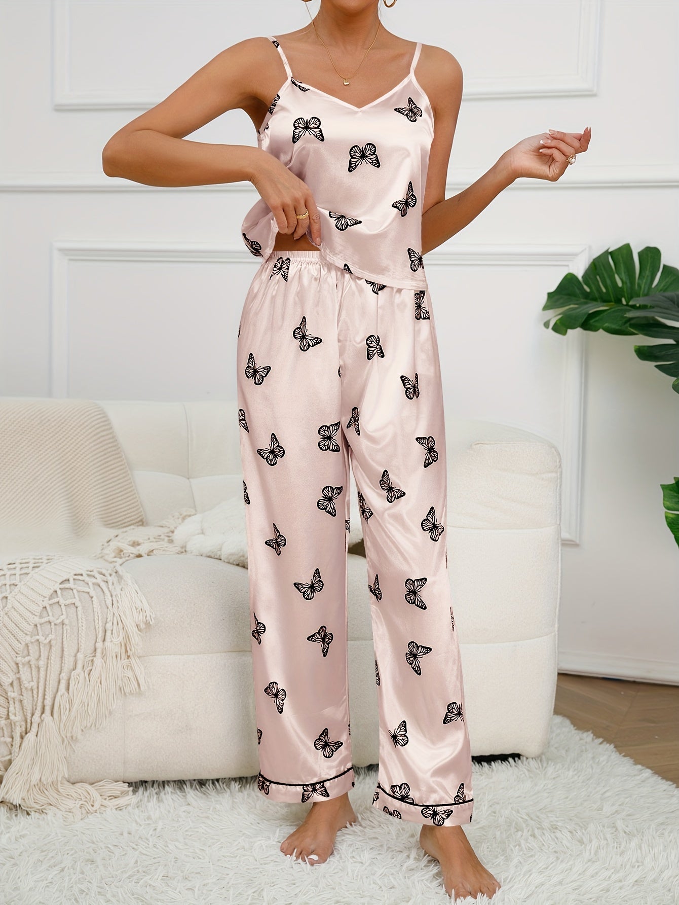 Ayollar uchun karnayli naqshli pijama to'plami, V-shaklidagi kamzuli, va elastik belli shimlar.