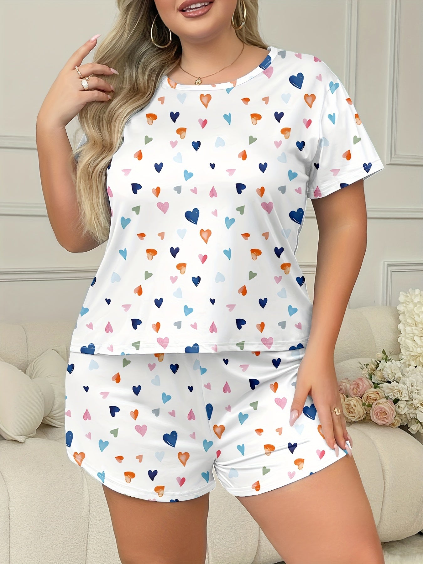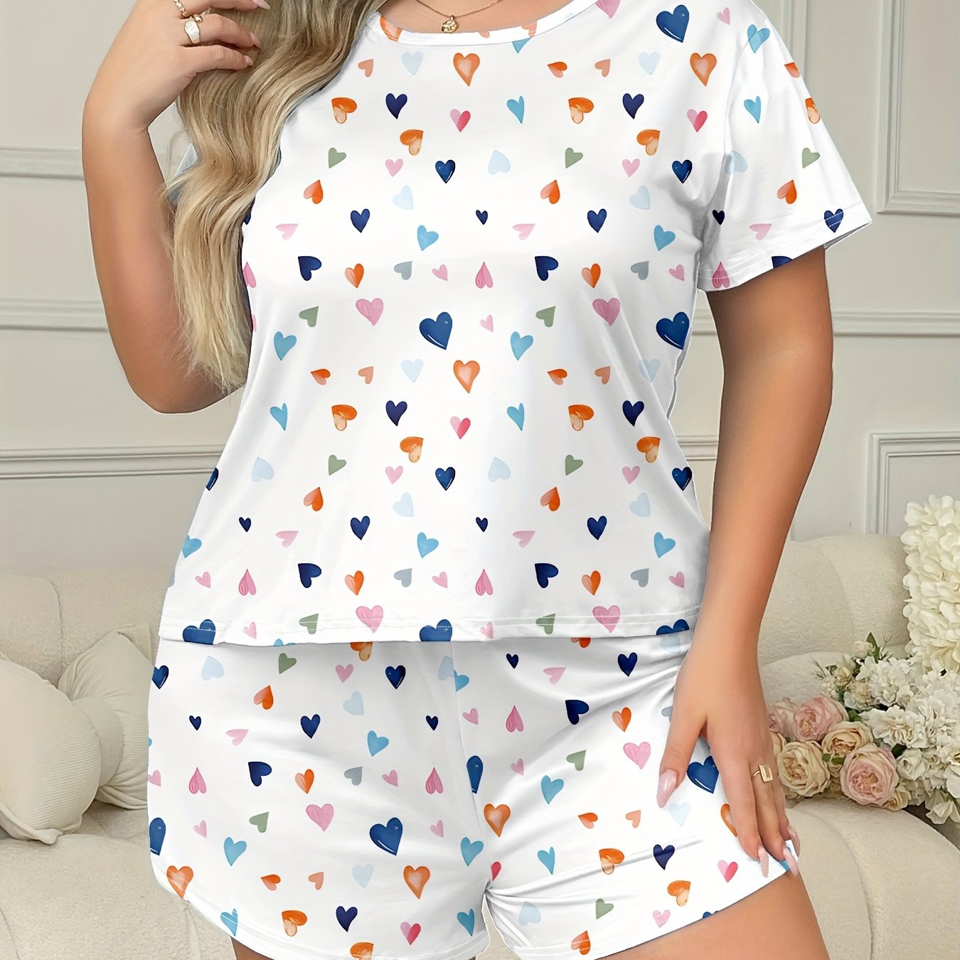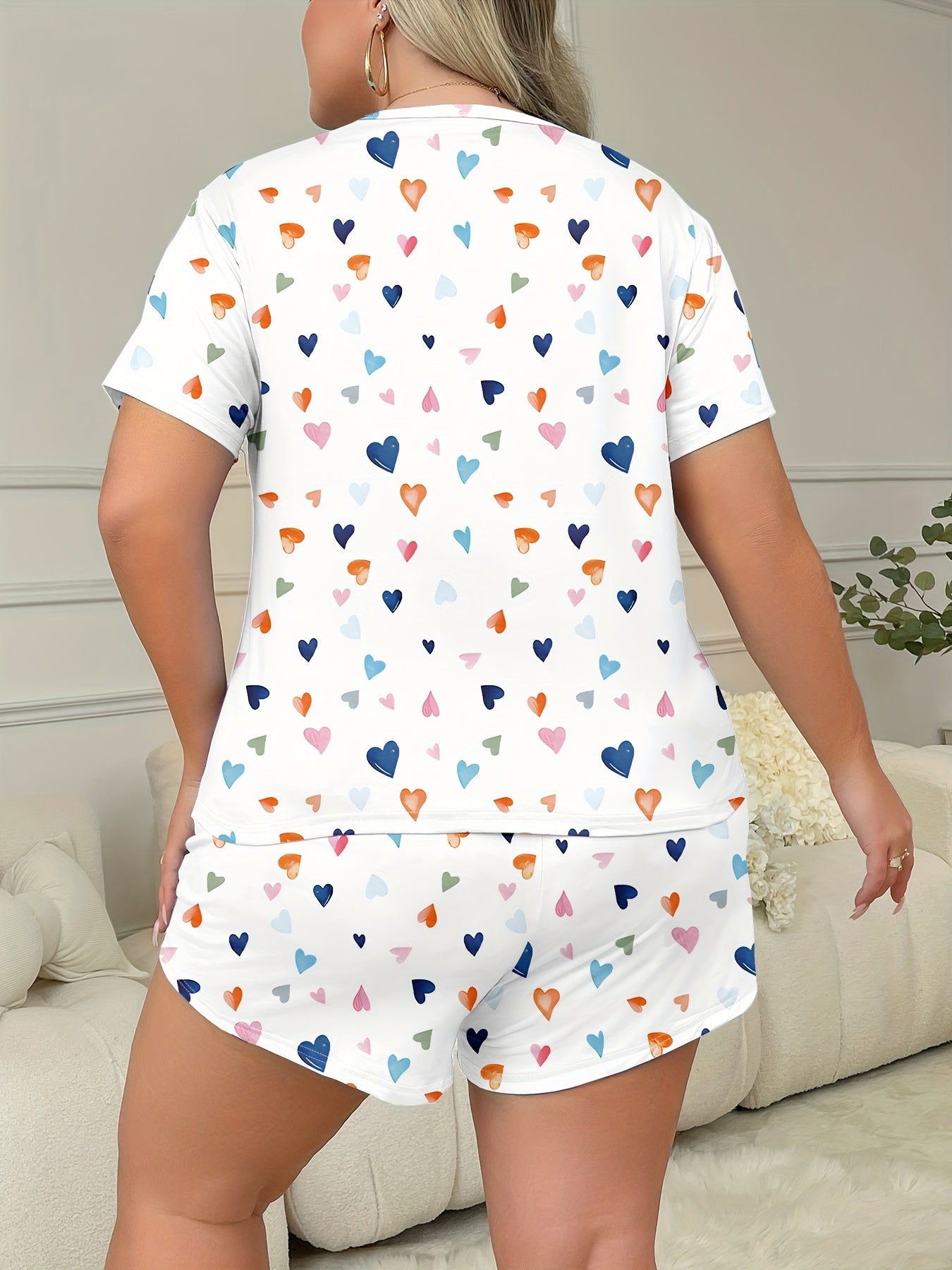 Ayollar uchun katta o'lchamli rang-barang yurak shaklidagi pizhama to'plami, shortlar va dam olish kiyimi
