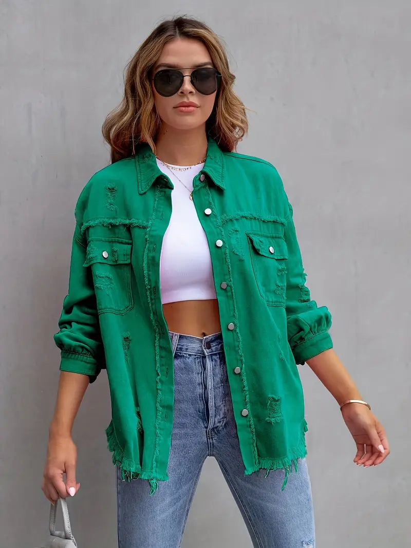 Ayollar uchun plussiz, boho uslubidagi, tugma tafsiloti va rayon/viskosa aralashmasidan tayyorlangan yirtilgan denim ko'ylagi. Bahor/kovak modasi uchun mos.
