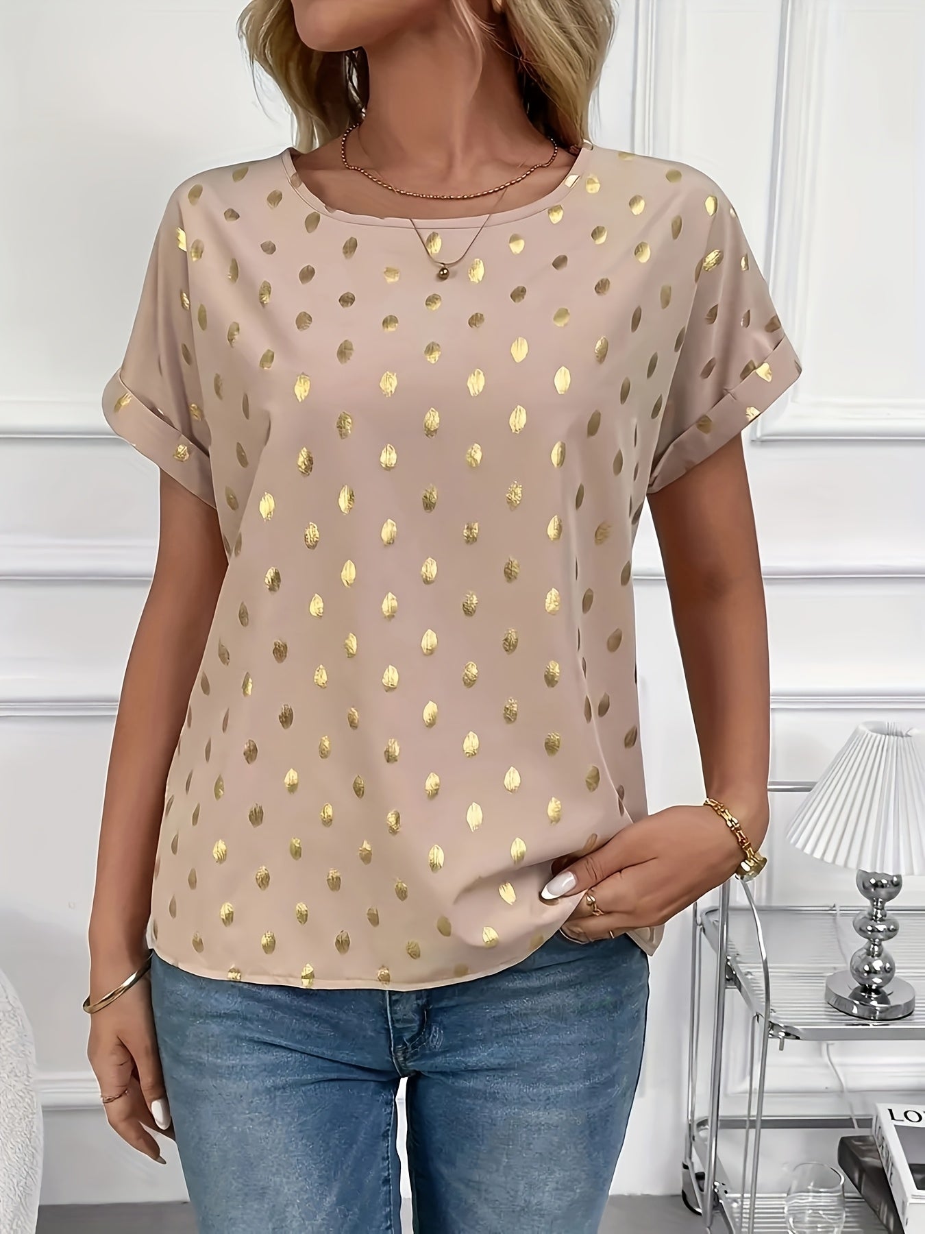 Ayollar uchun kattaroq o'lchamdagi oltin polka nuqta qisqa ko'ylak, dumaloq bo'yin, ofis kiyimi