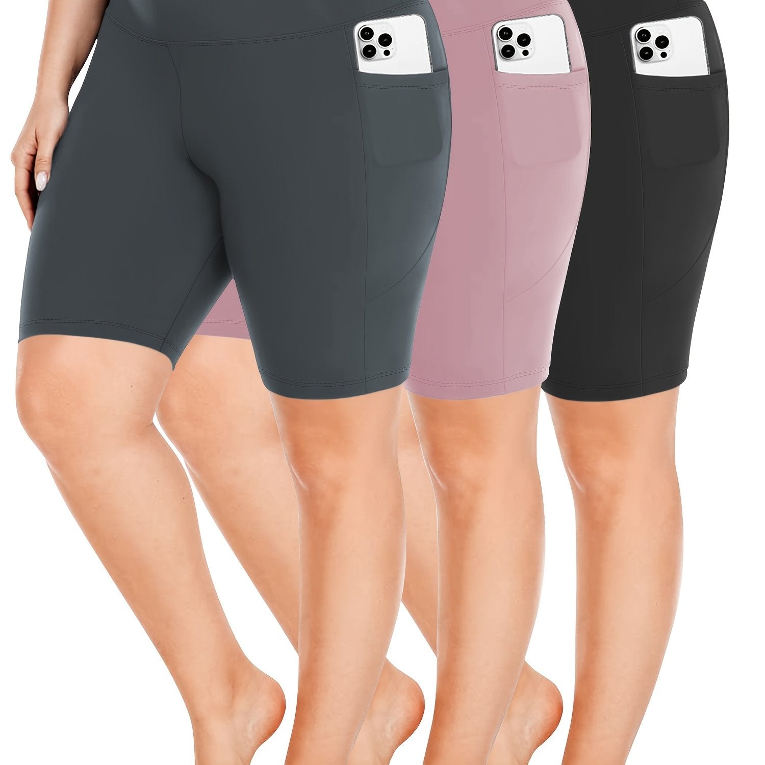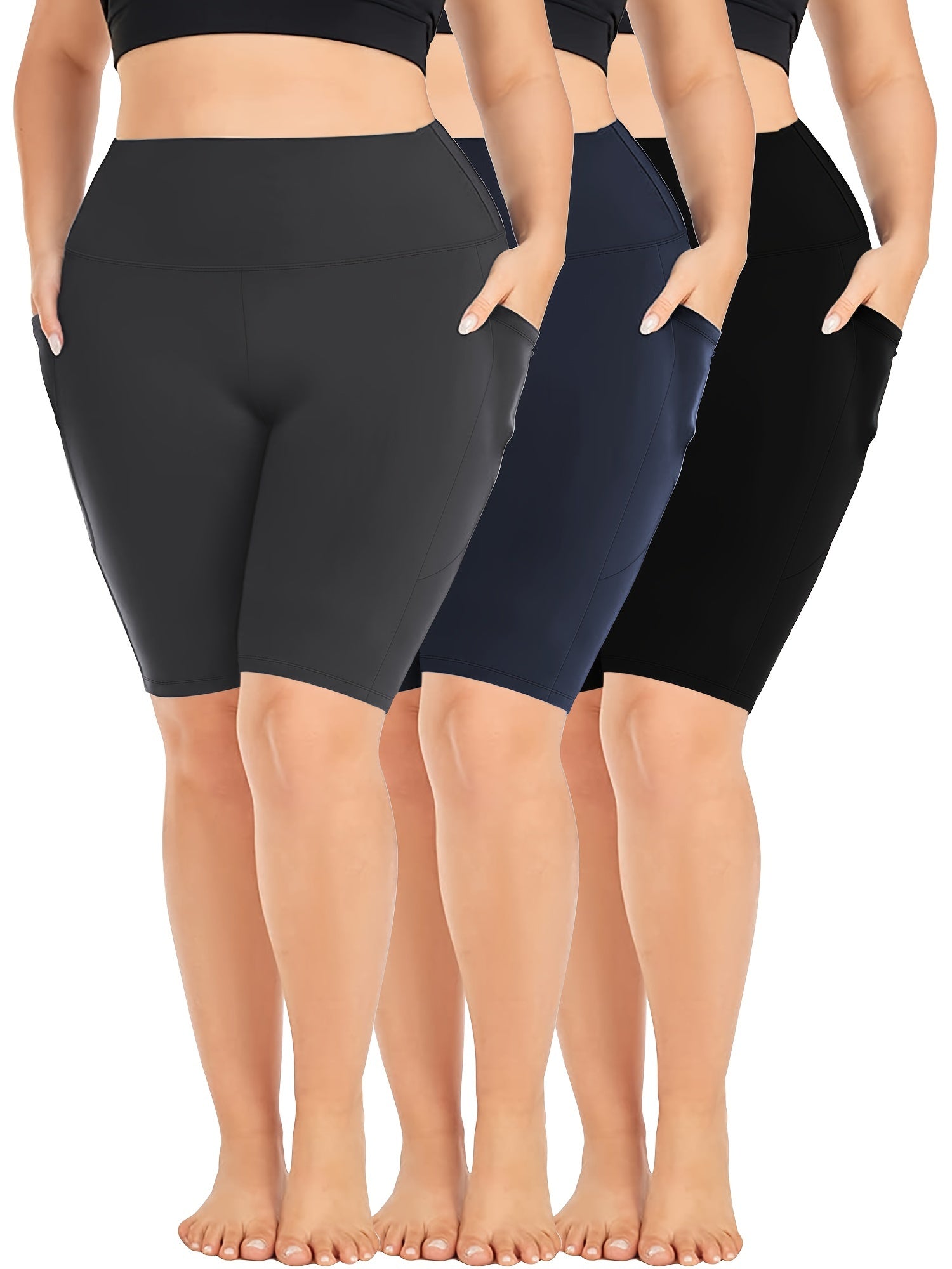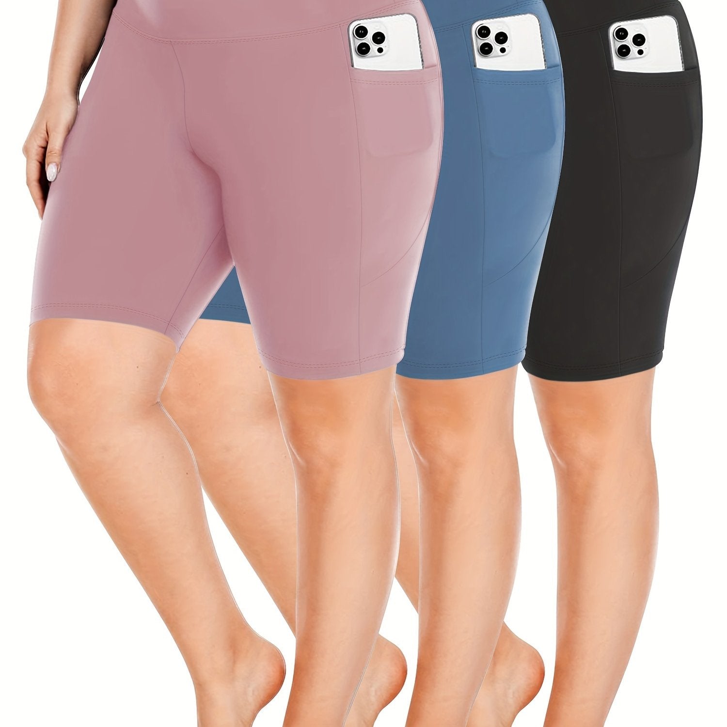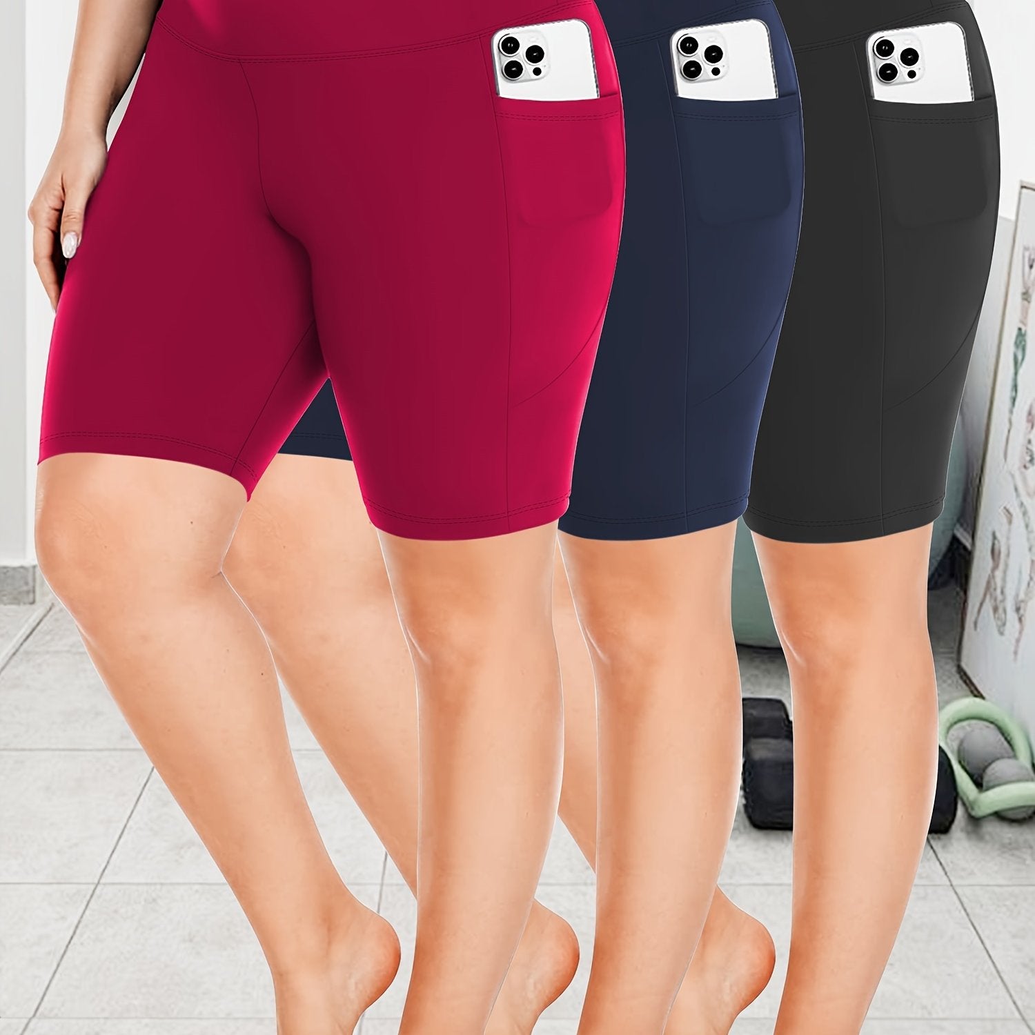 Ayollar uchun kattaroq o'lchamli yuqori belli bir rangli shortlar faoliyat kiyimlari to'plami, 3 ta