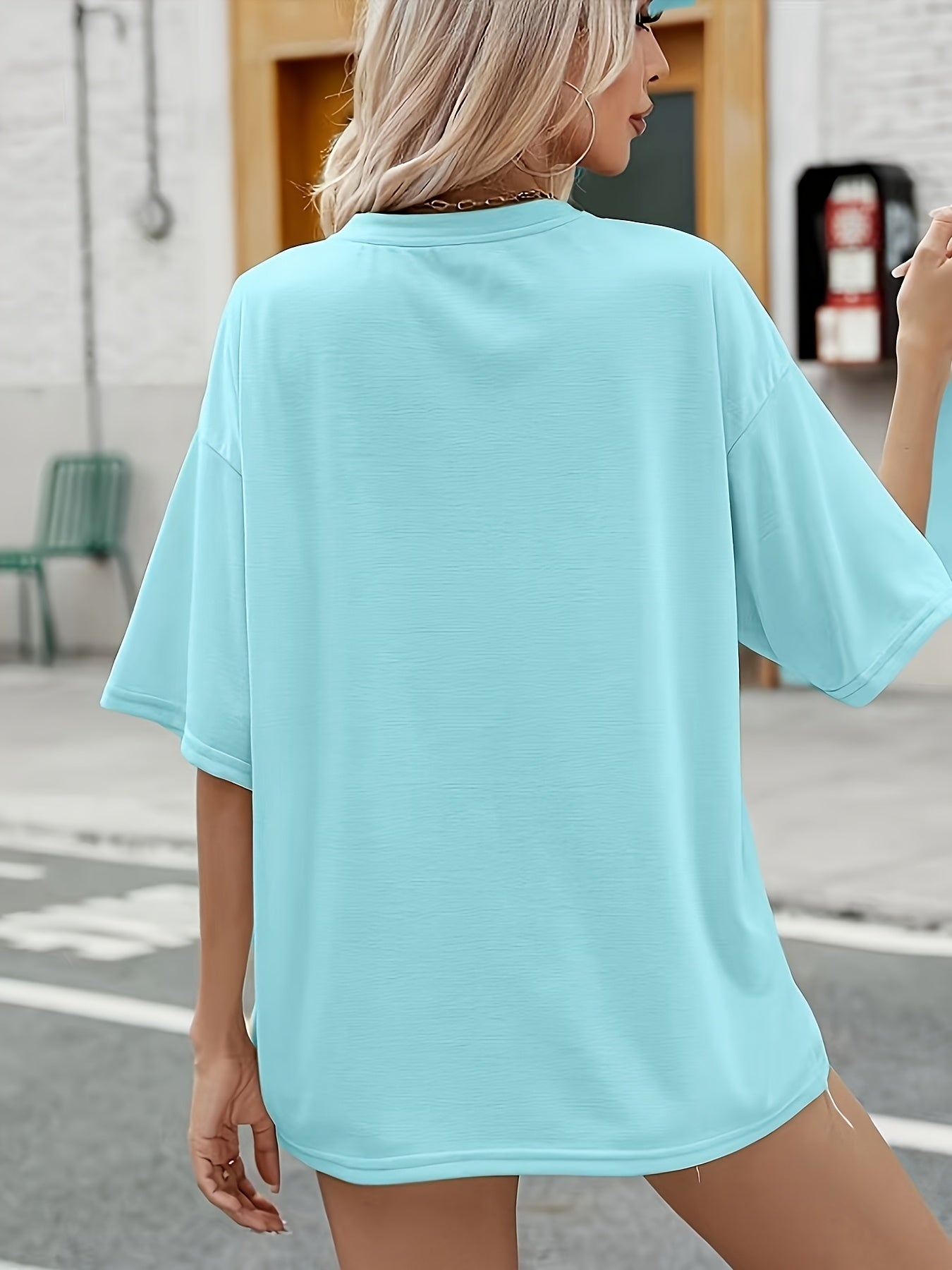 Ayollar uchun kattaroq o'lchamdagi ochko'k ko'k vintage g'arbiy grafik T-shirt, kundalik musiqa ustki kiyimi