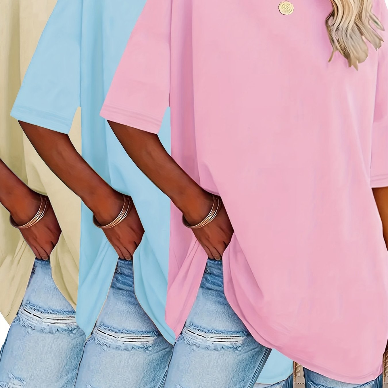 Ayollar uchun kattaroq o'lchamdagi keng bo'yinli paxta futbolkalar, qisqa qo'l, kundalik yozgi ko'ylaklar, 3 ta rangda
