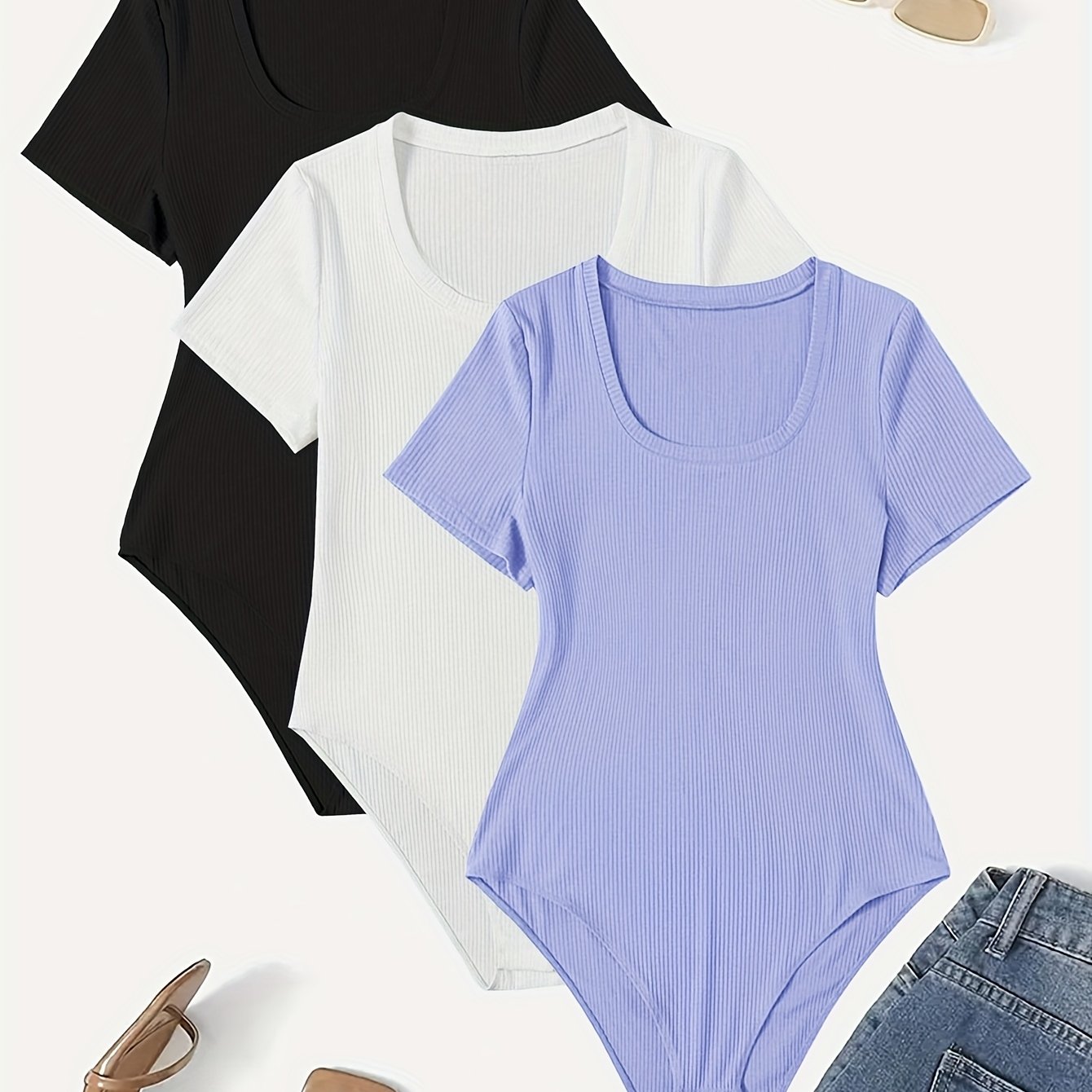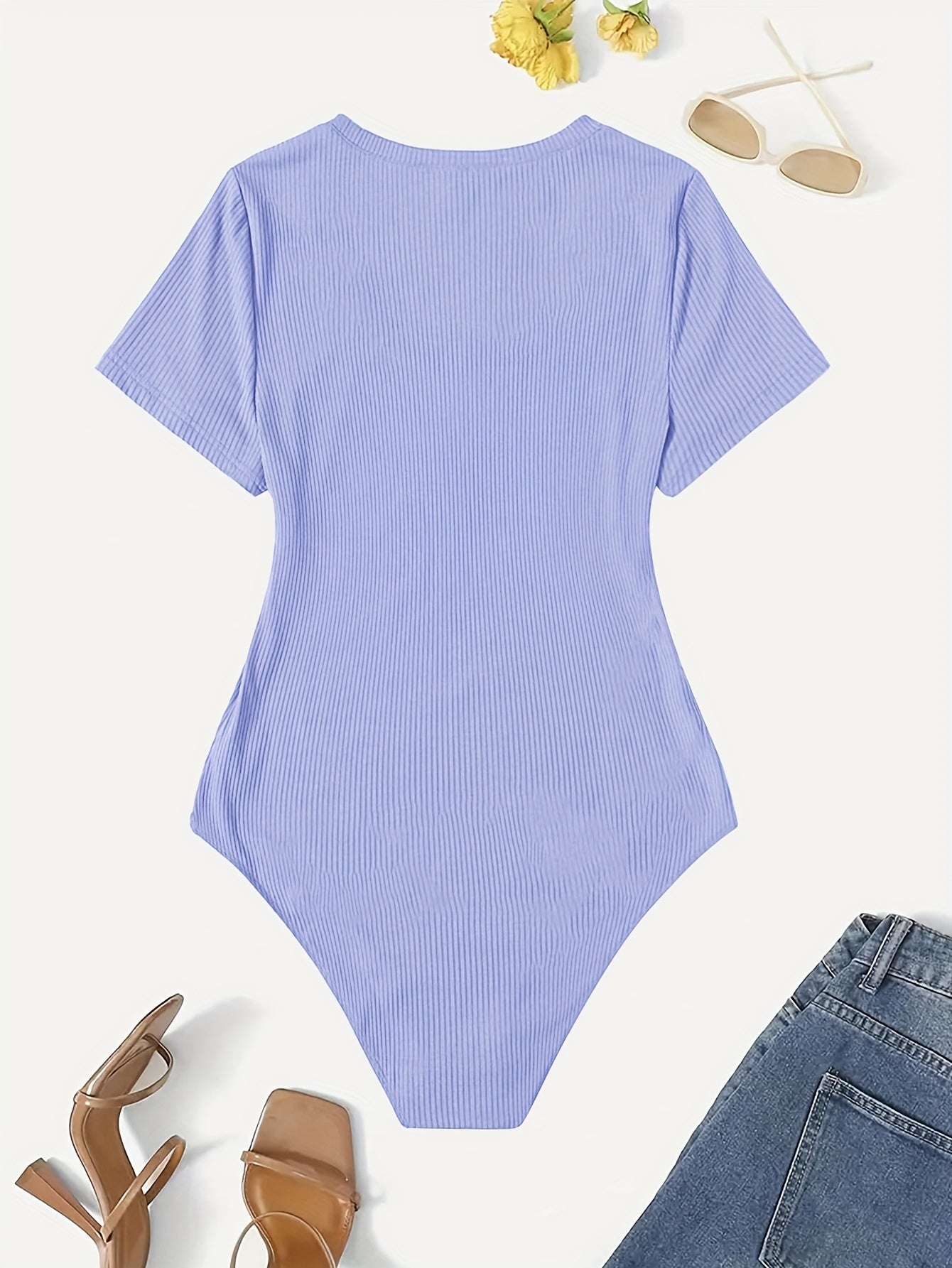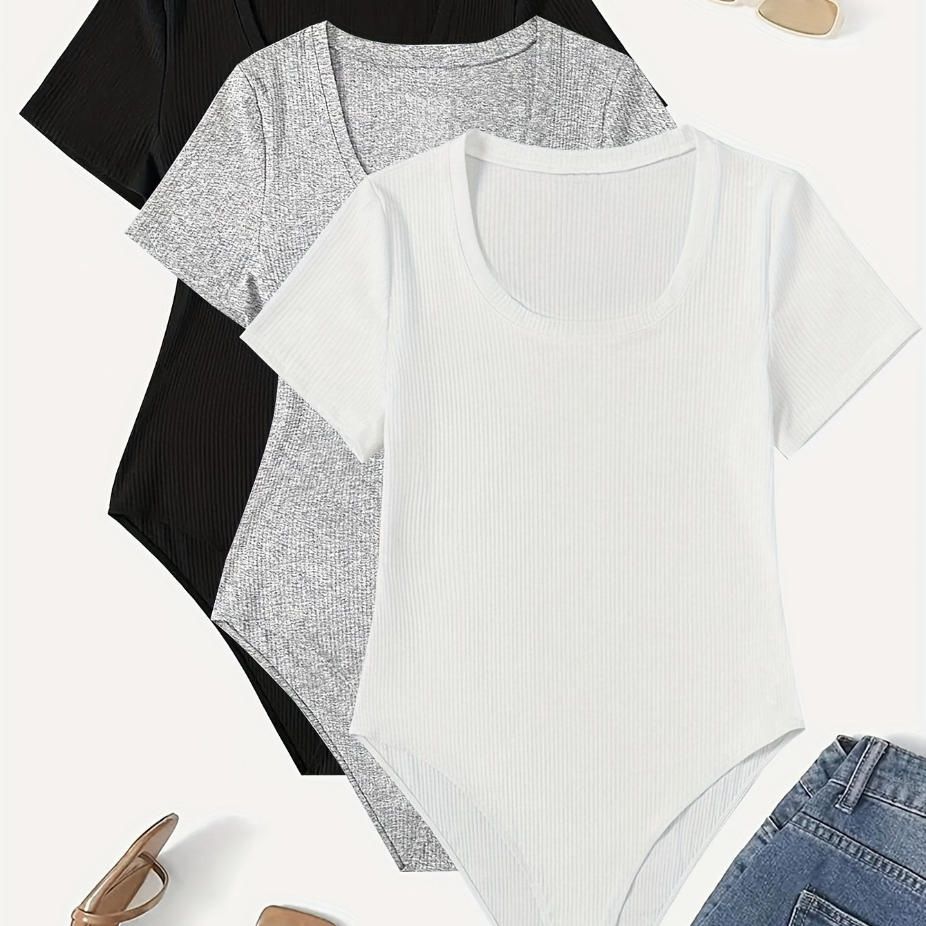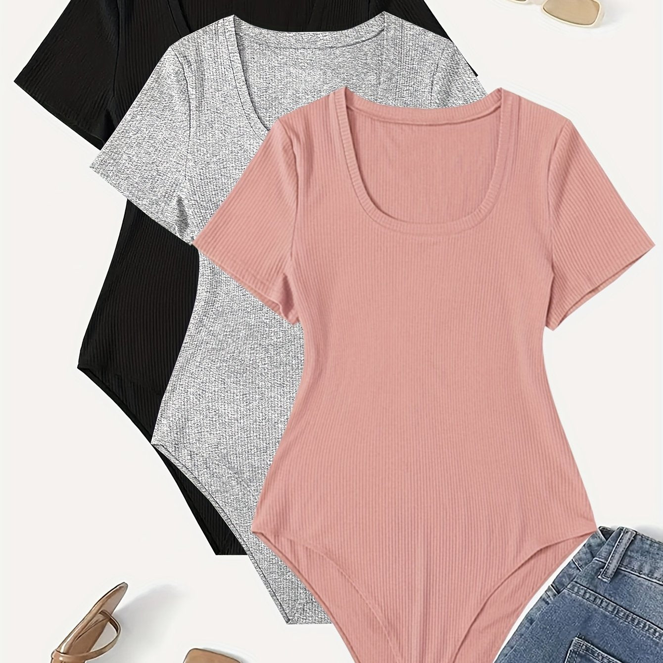 Ayollar uchun kengaytirilgan o'lchamli elastik bodysuitlar, bir rangli, kruj neck, qisqa qo'lli to'plam
