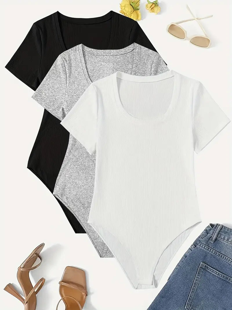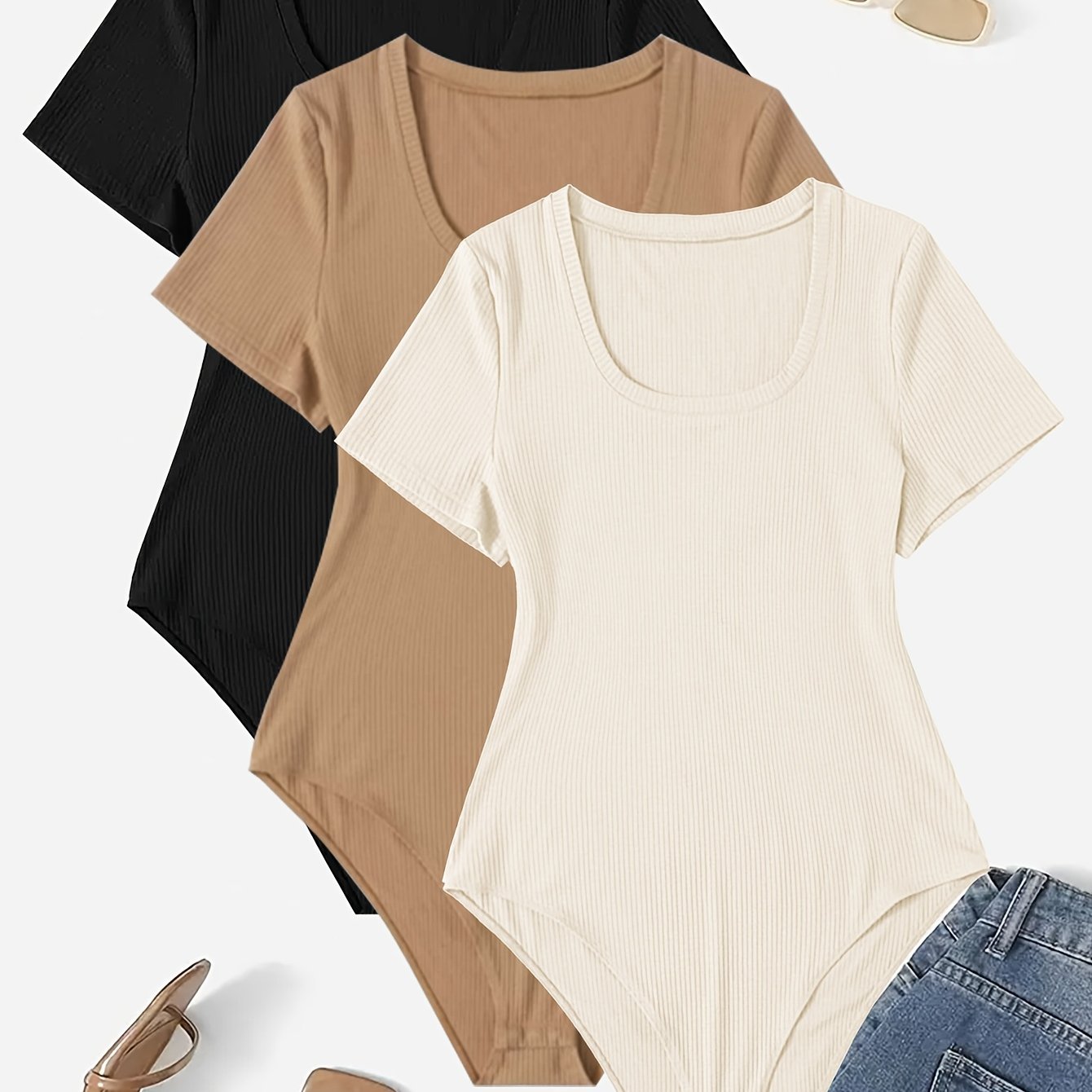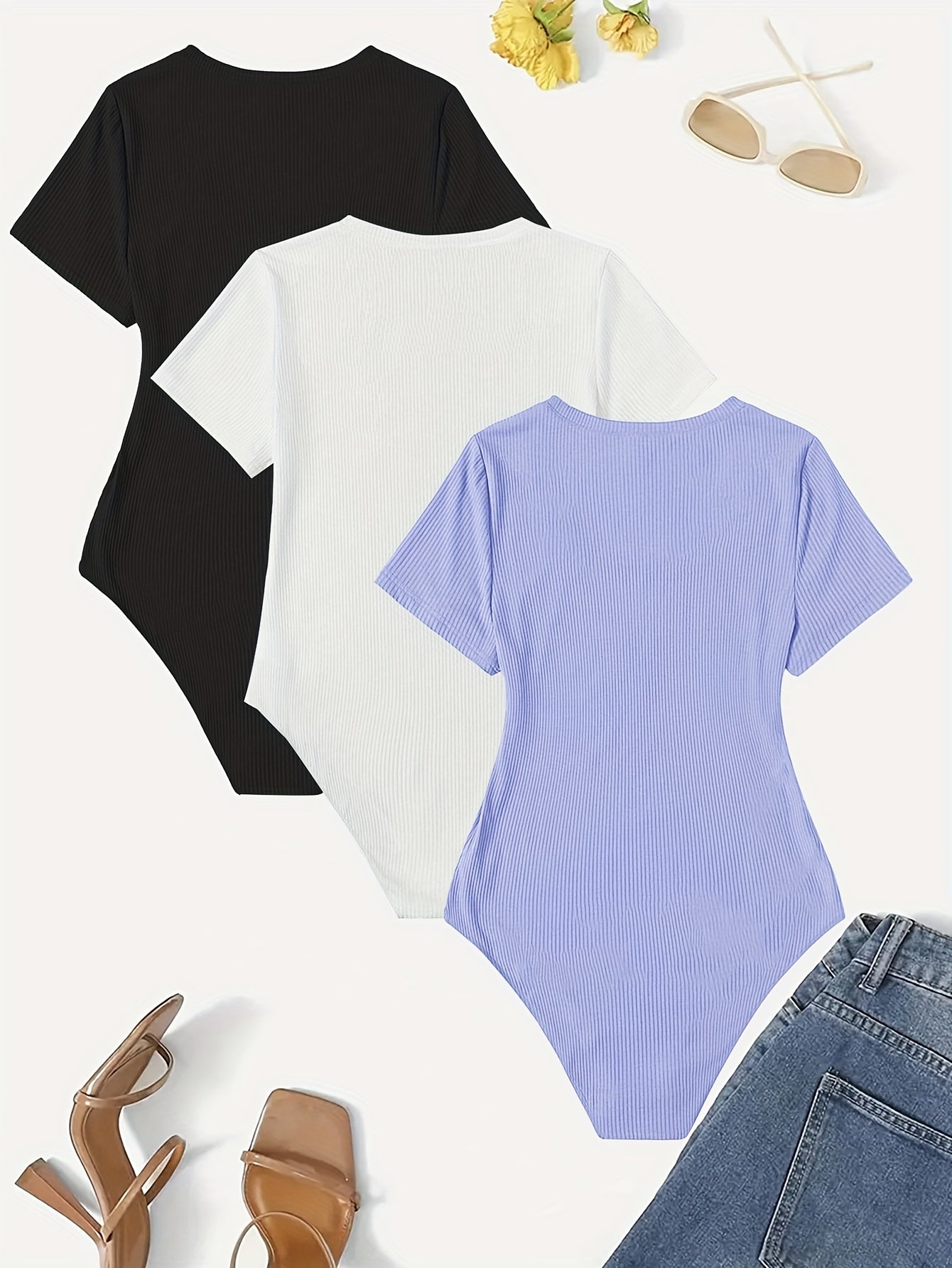 Ayollar uchun kengaytirilgan o'lchamli elastik bodysuitlar, bir rangli, kruj neck, qisqa qo'lli to'plam