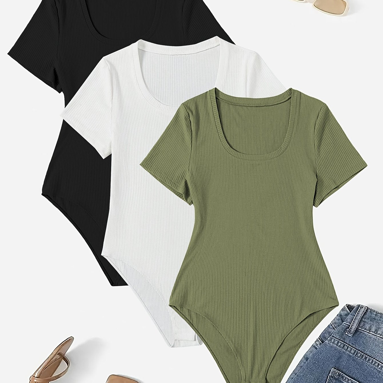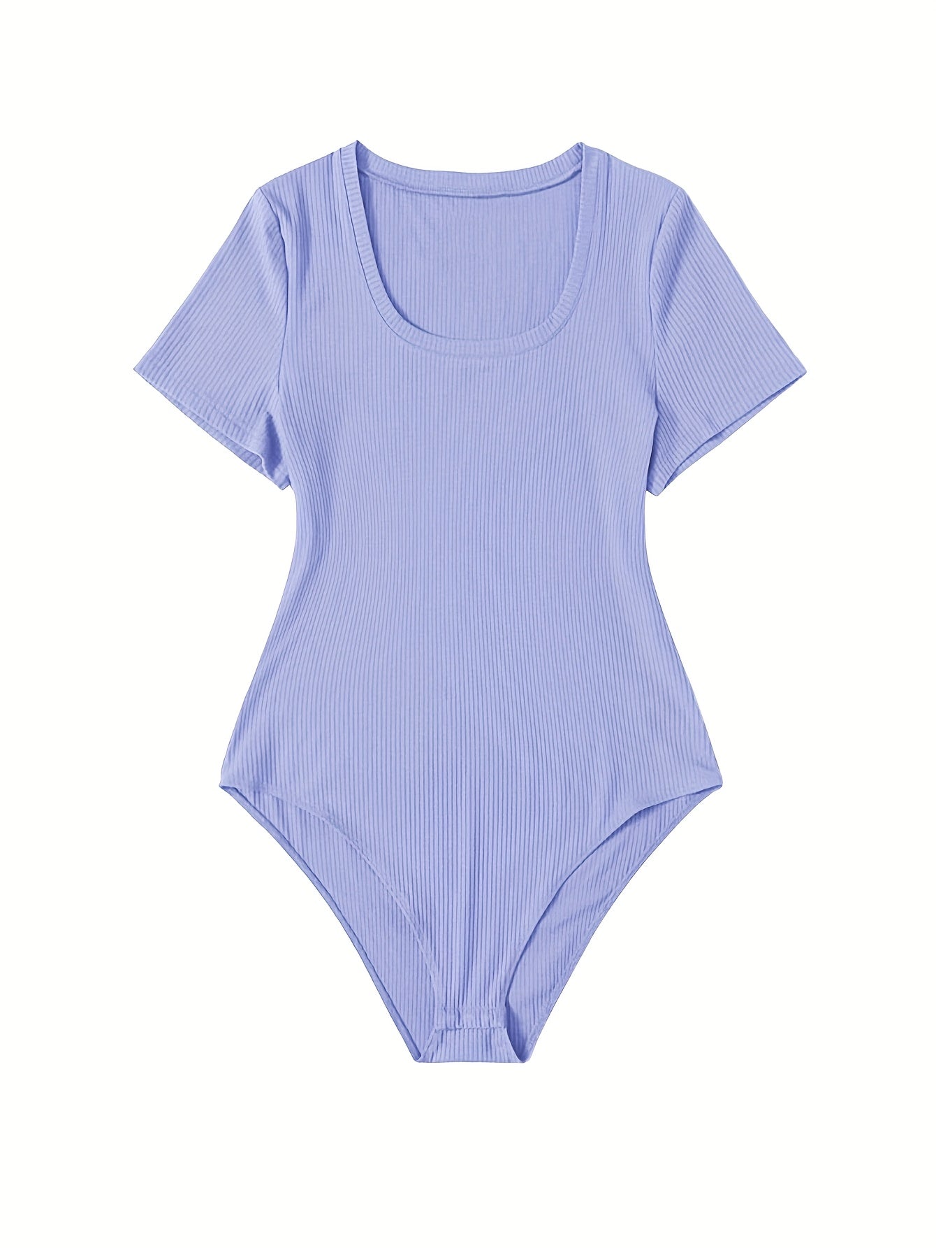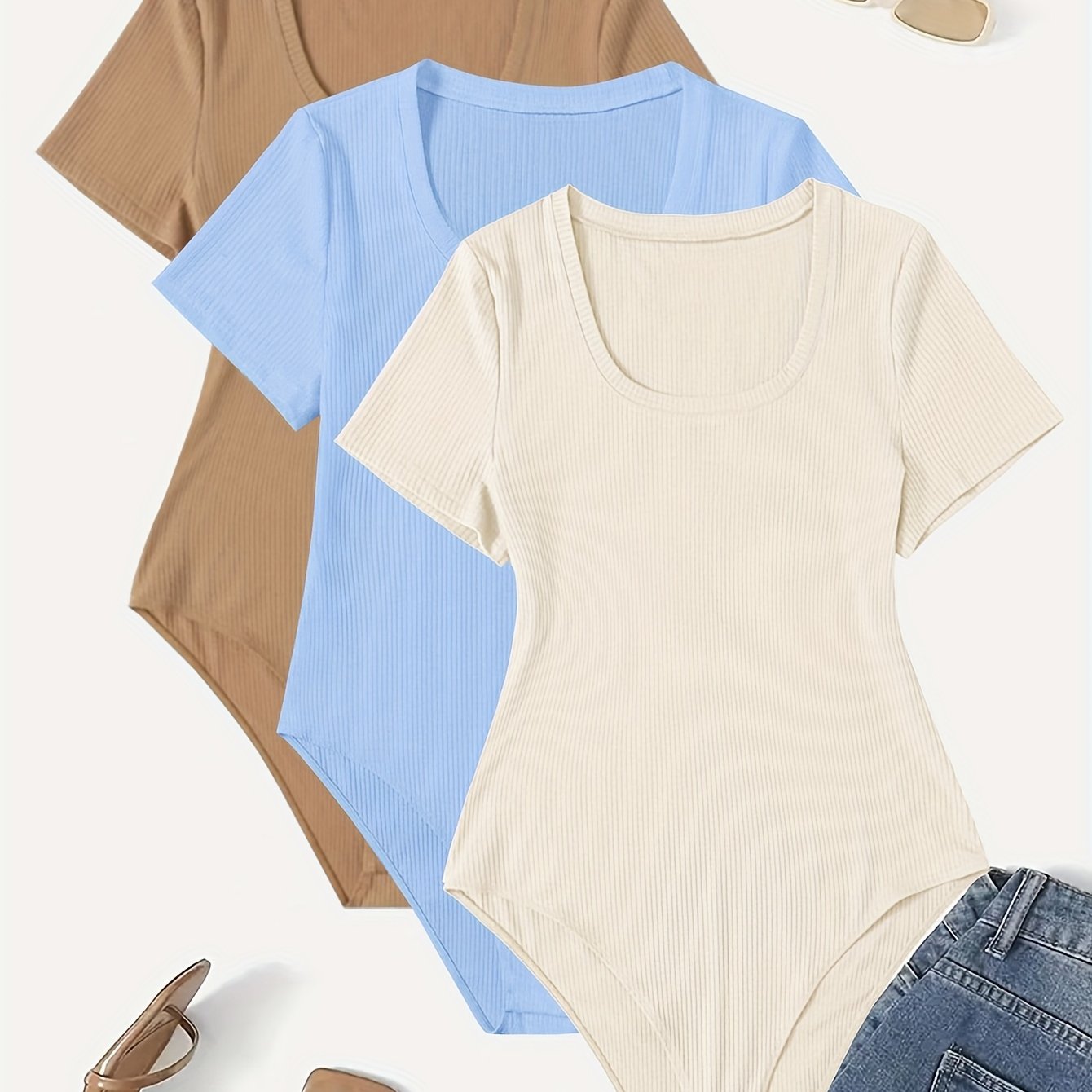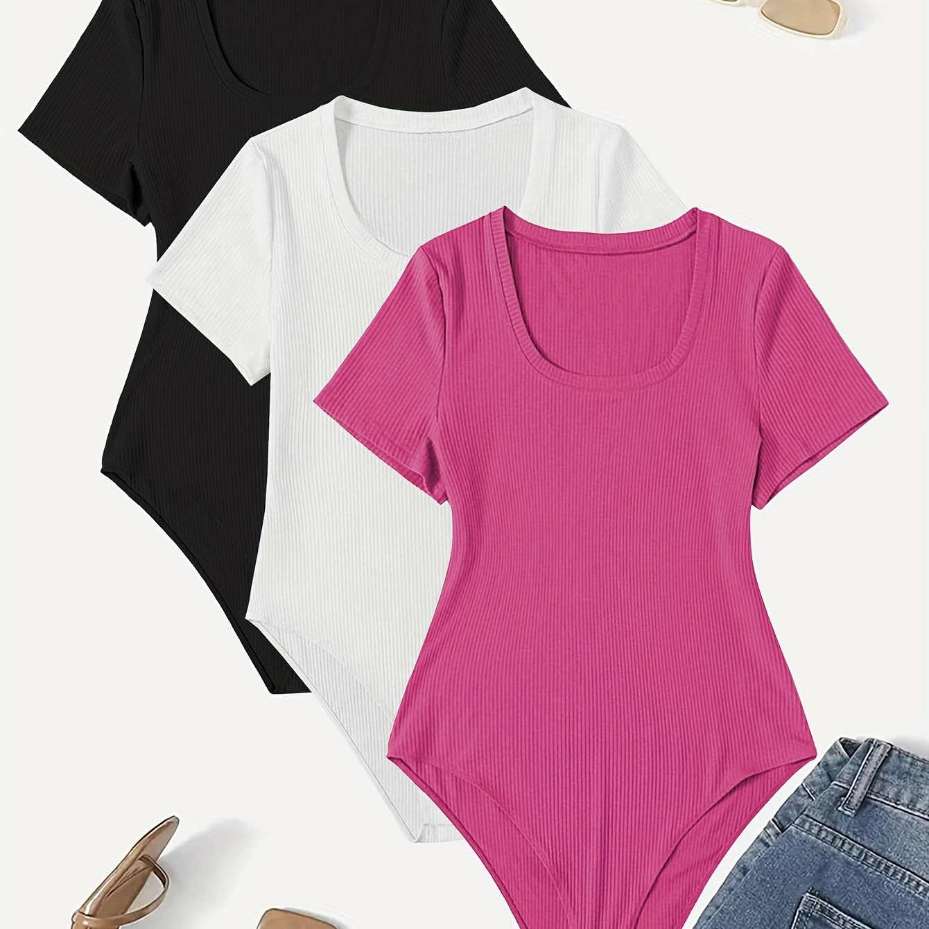 Ayollar uchun kengaytirilgan o'lchamli elastik bodysuitlar, bir rangli, kruj neck, qisqa qo'lli to'plam