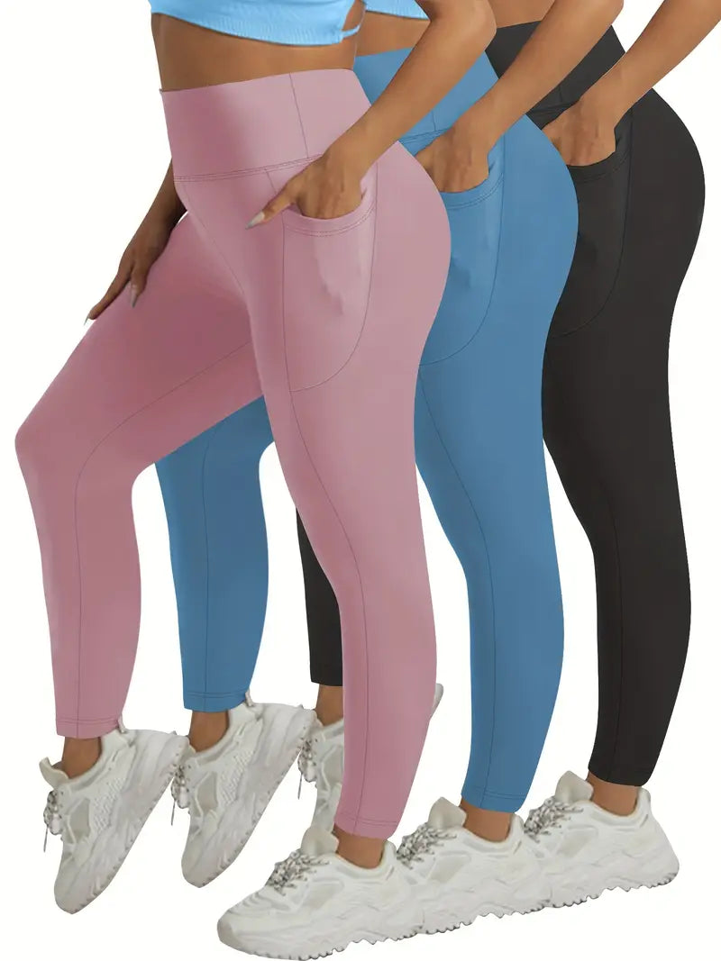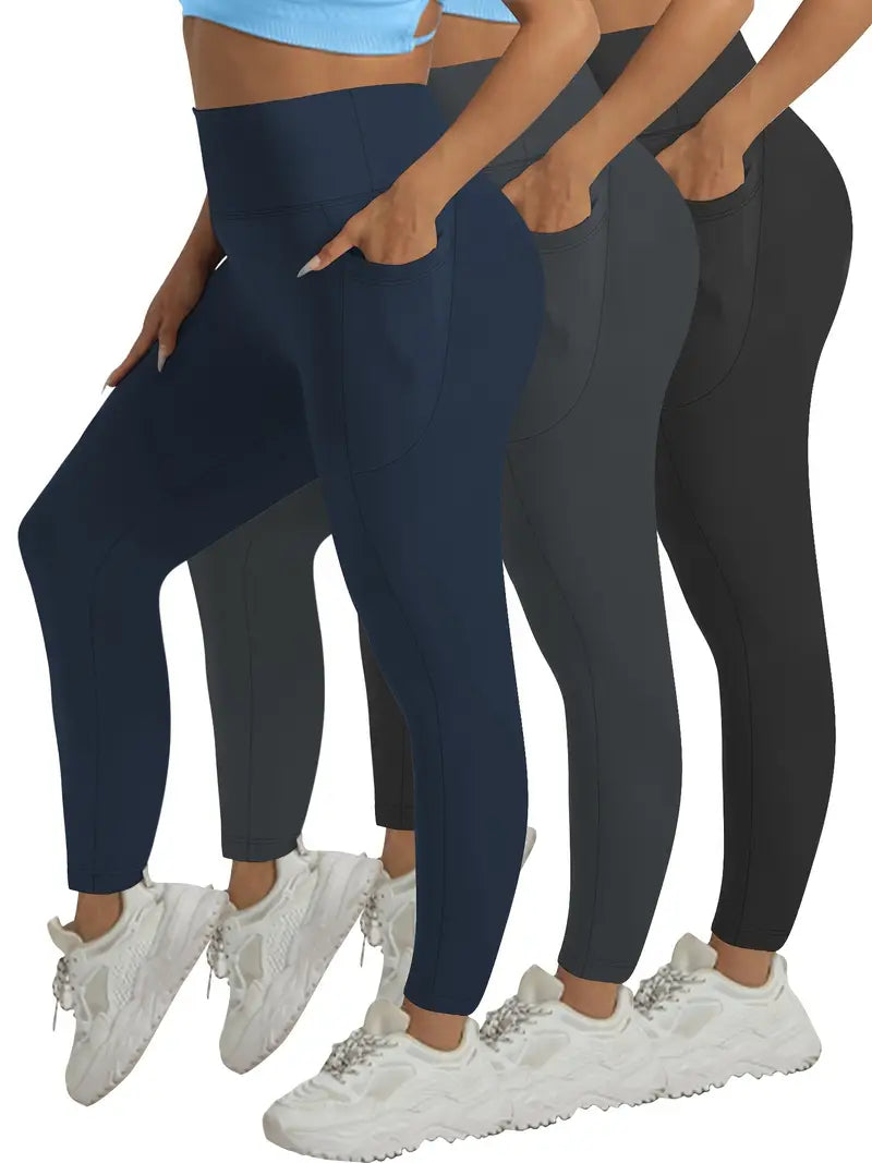 ayollar uchun kattaroq o'lchamdagi qomatni nazorat qiluvchi sport legginslar, cho'ntaklar bilan, yuqori bel
