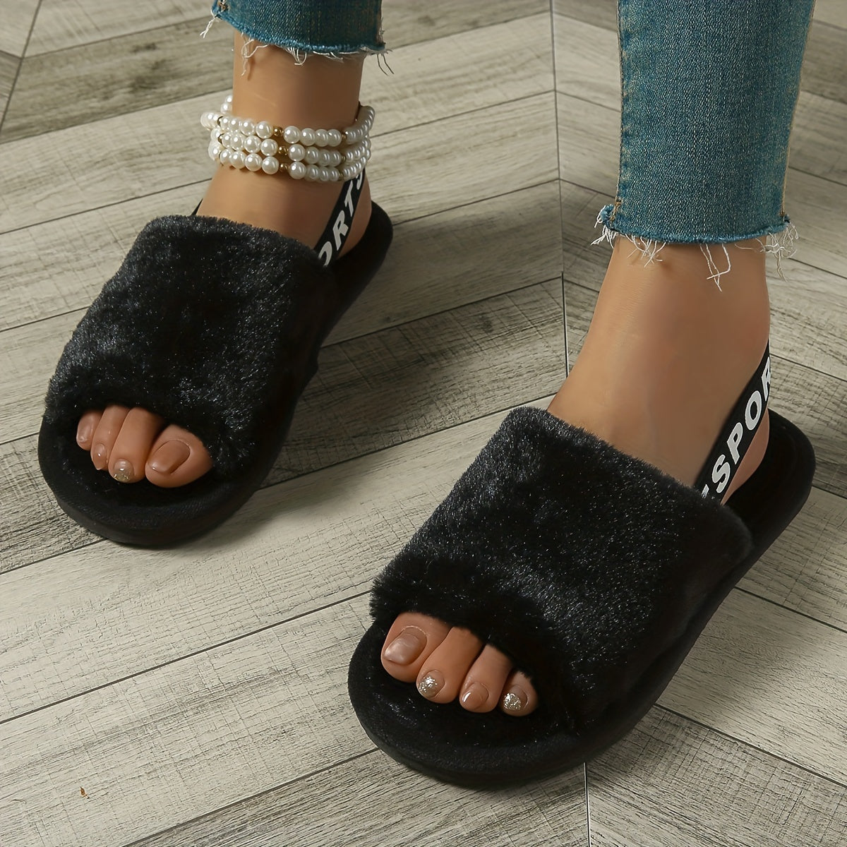 Ayollar uchun mo'ljallangan qulay va issiq plush qoplamali flip-floplar, ochiq barmoqli, qora ichki uy poyabzali