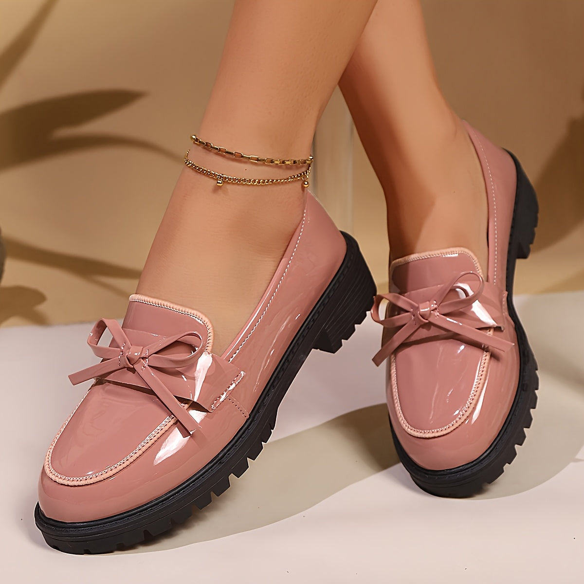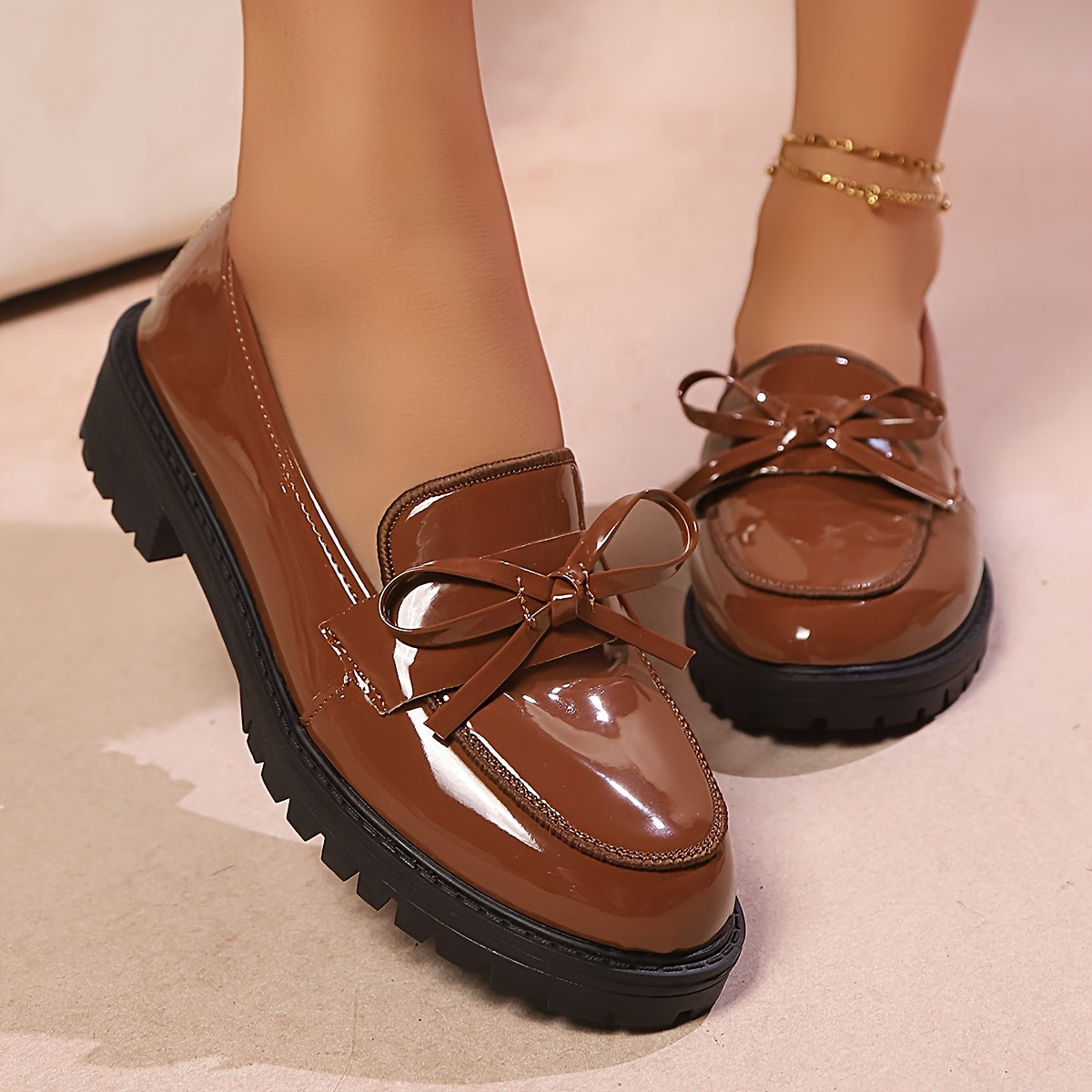 Women's Red Bow Oxford Loafers Glossy PU Slip-Resistant Comfort Sole