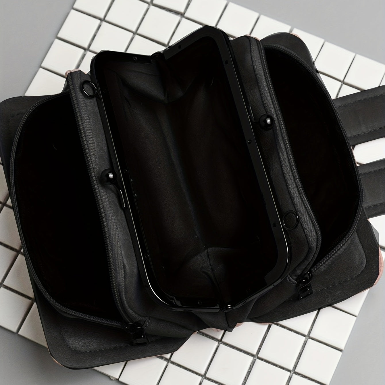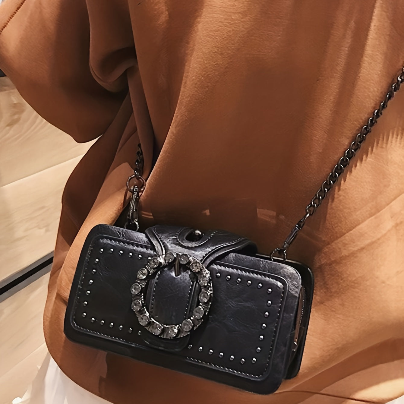 Ayollar uchun retro clutch sumkasi, rivetlar bilan, zanjirli yelka tasmasi, qora rang, ko'p qatlamli klip va kichik kvadrat dizayn.