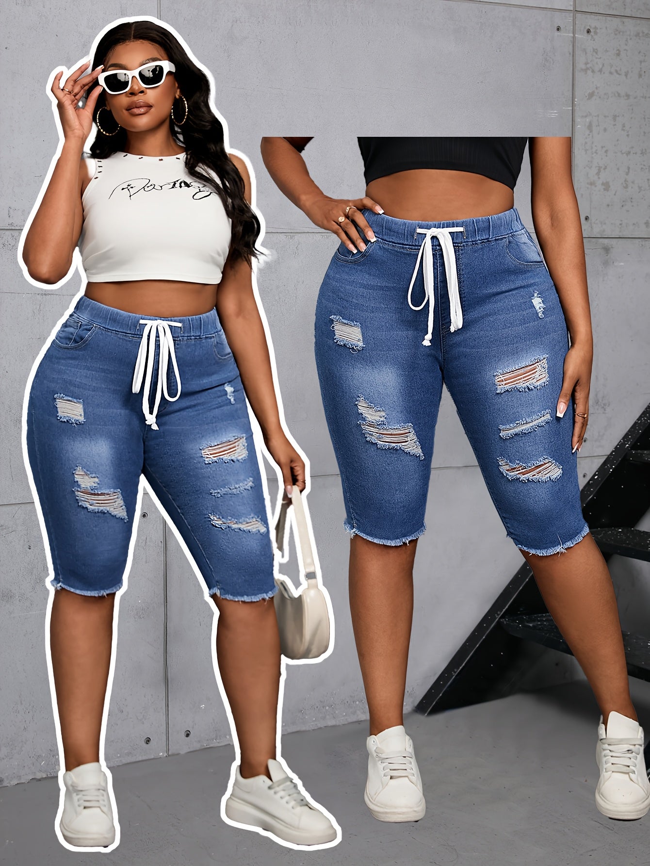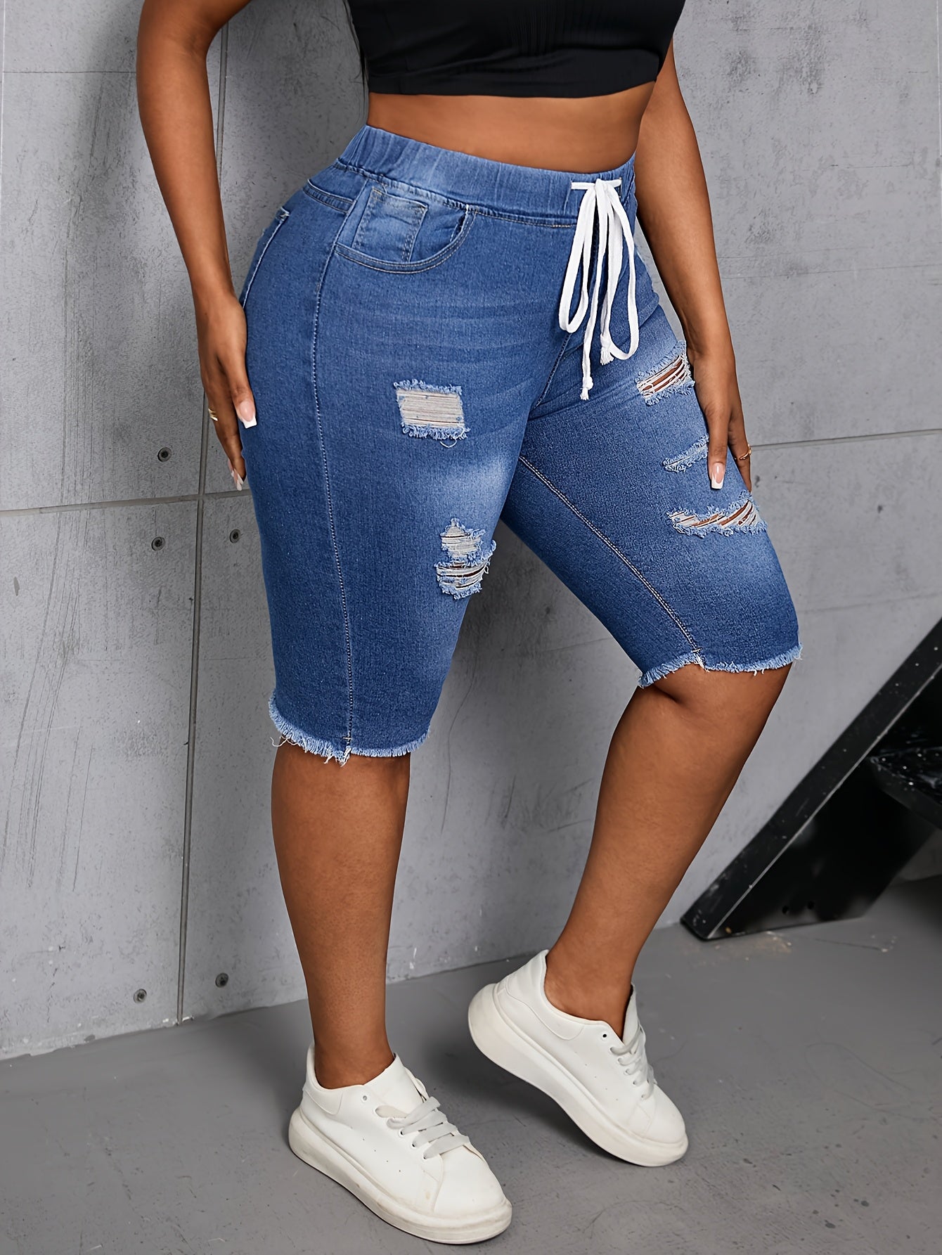Ayollar uchun tornali, toza bo'yinli denim kapri shimlar, chiziqli elastik belbog' bilan