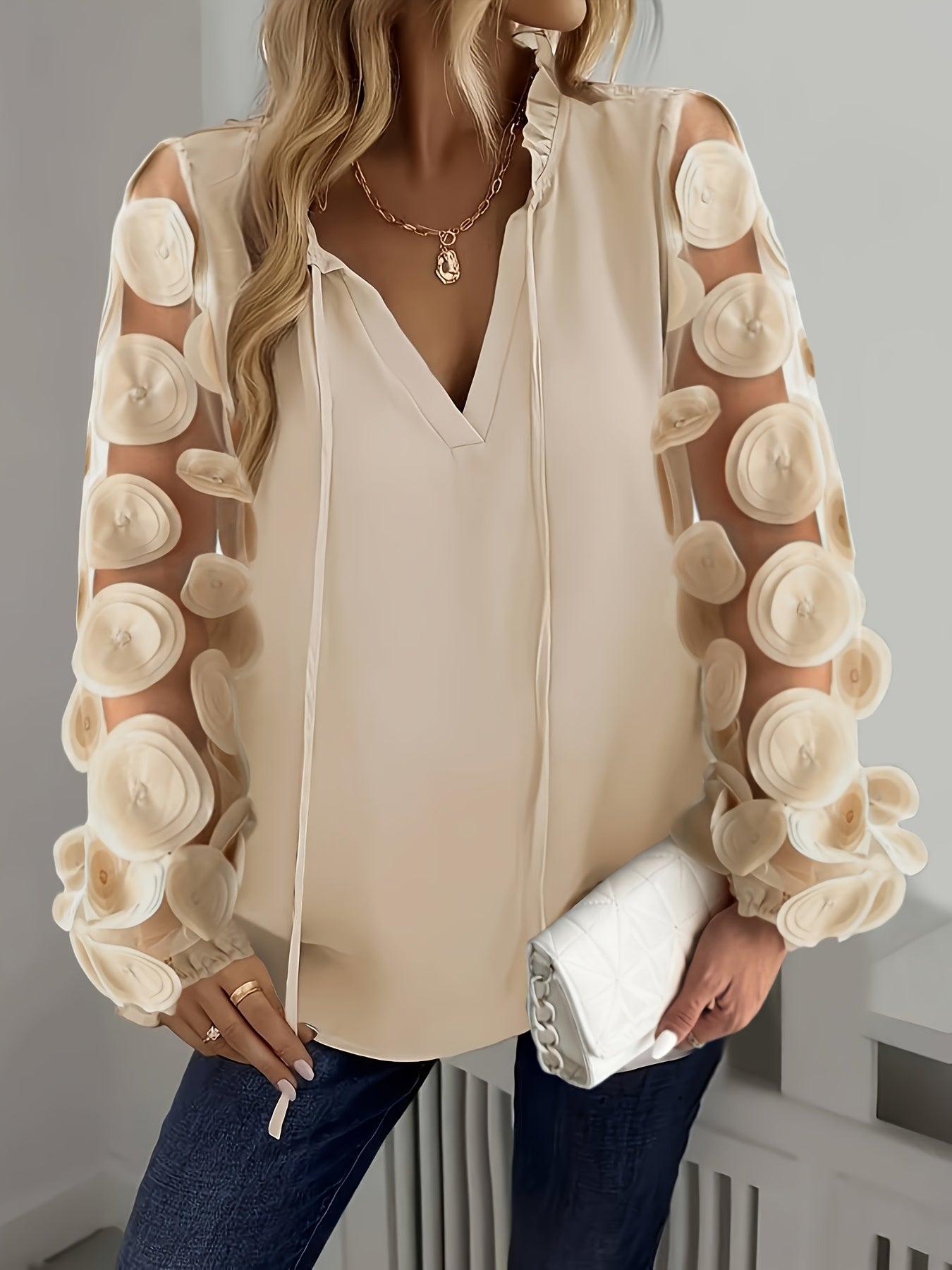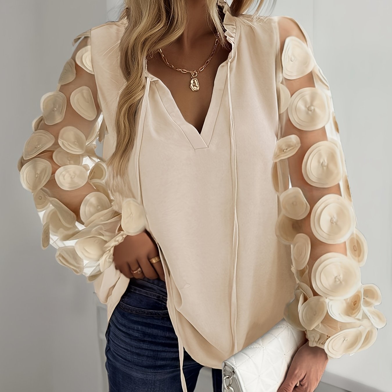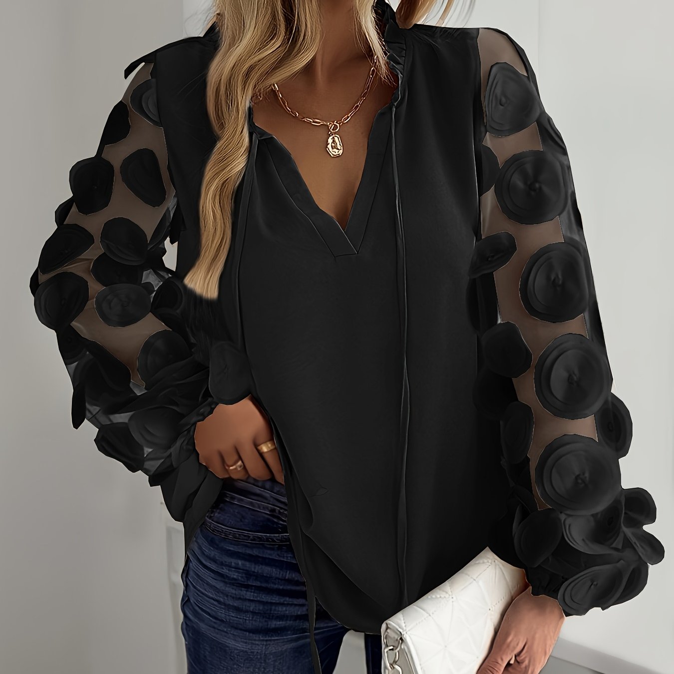 Ayollar uchun notchli yengli, lantern yengli va kontrastli mesh tafsilotlari bilan bezatilgan dumaloq mesh pullover. Tashqariga chiqish yoki ta'til uchun mukammal. Oddiy rangli polyesterdan tayyorlangan.