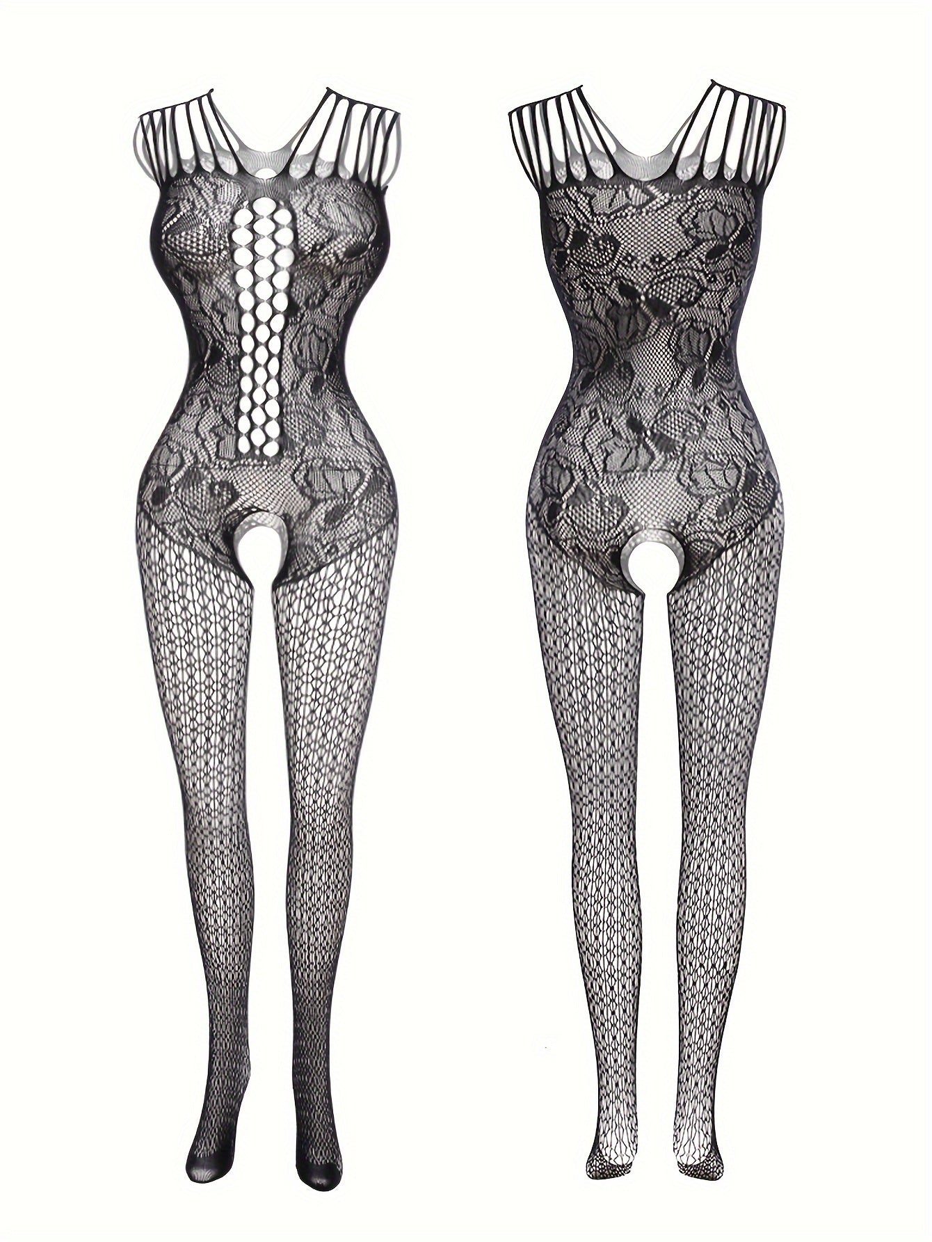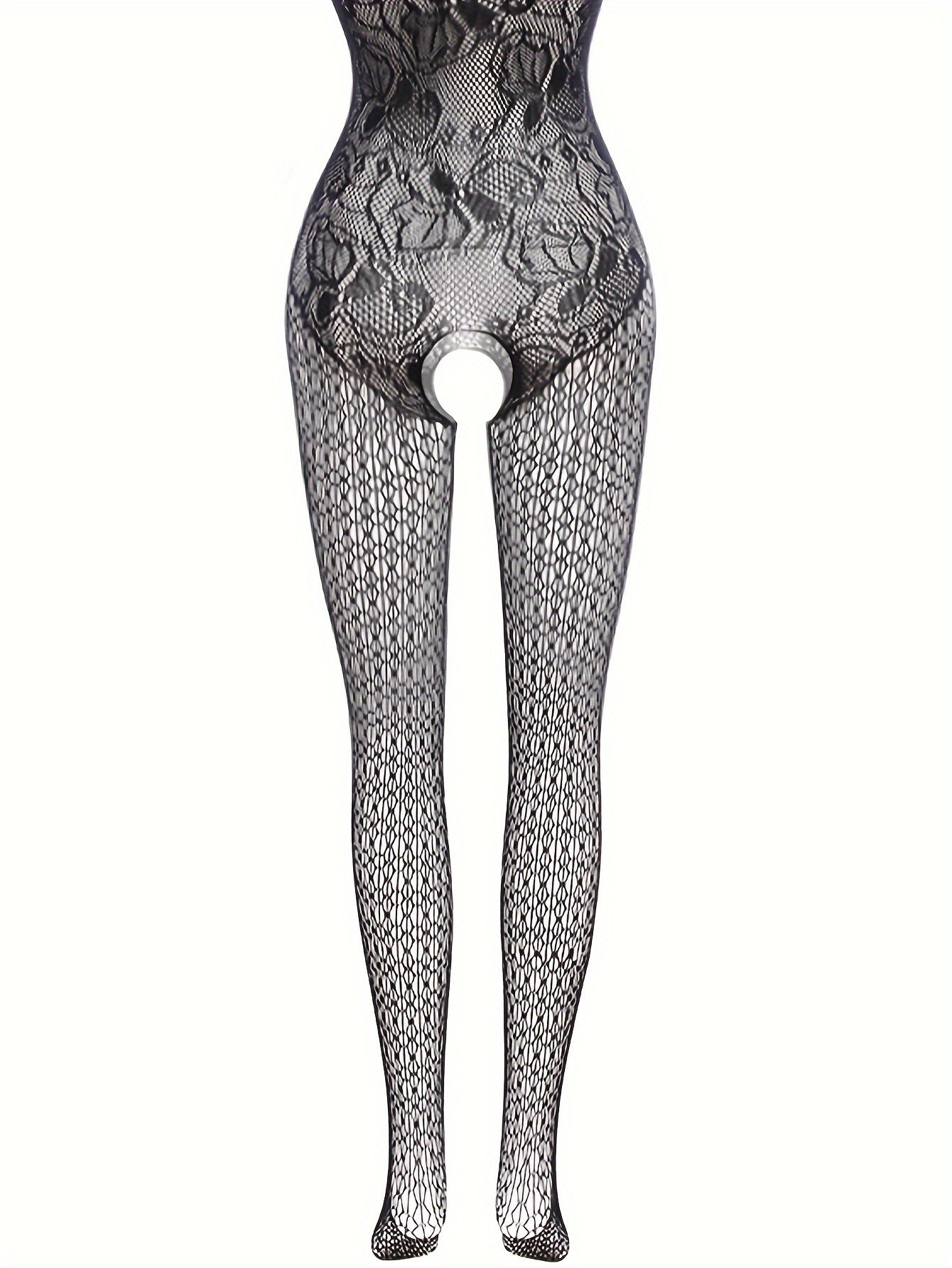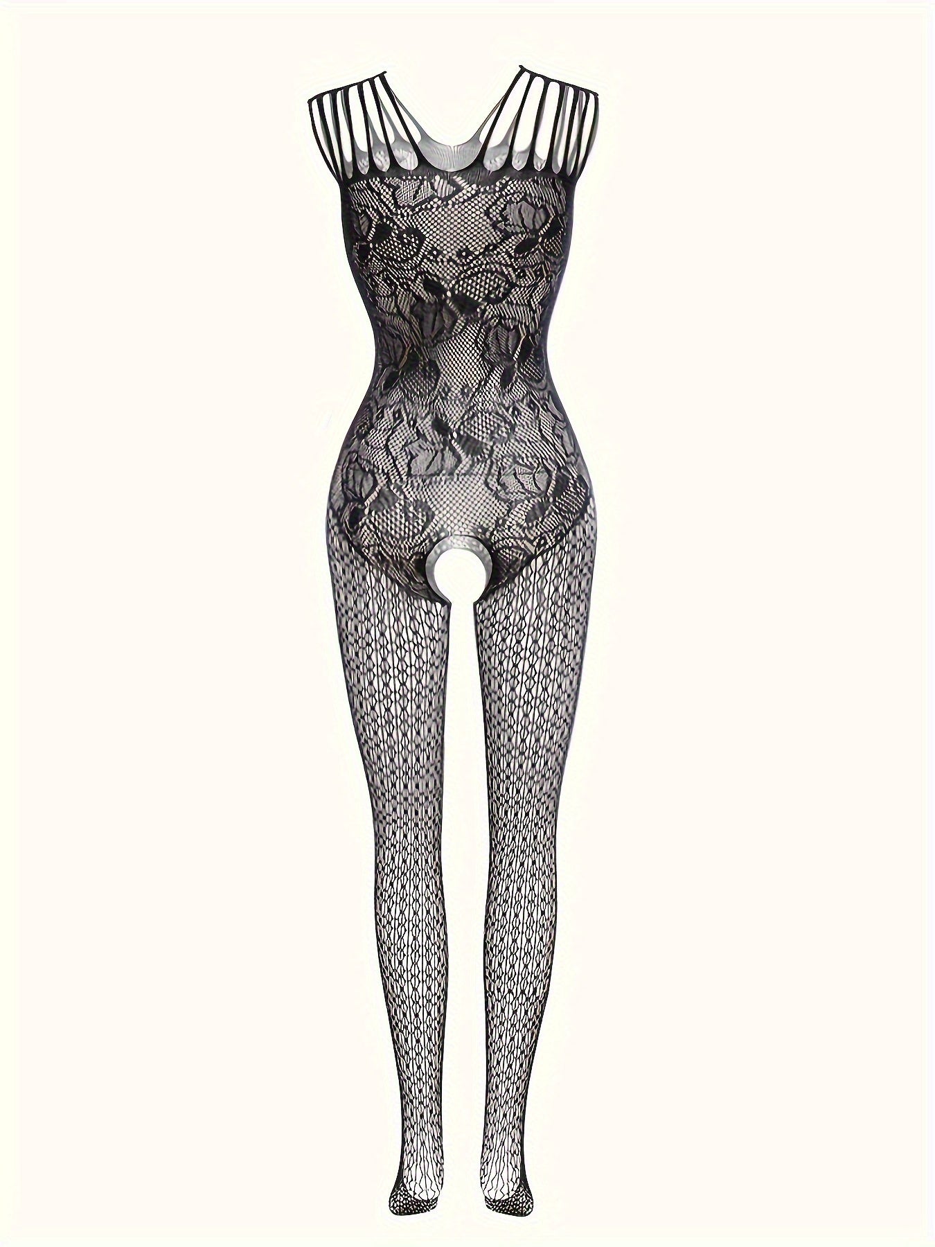 Ayollar uchun jozibali dantel bodysuit, yelkasiz dizayni, ochiq qorin, shaffof baliq to'rdan tayyorlangan material va bo'sh joy detali bilan ajralib turadi.