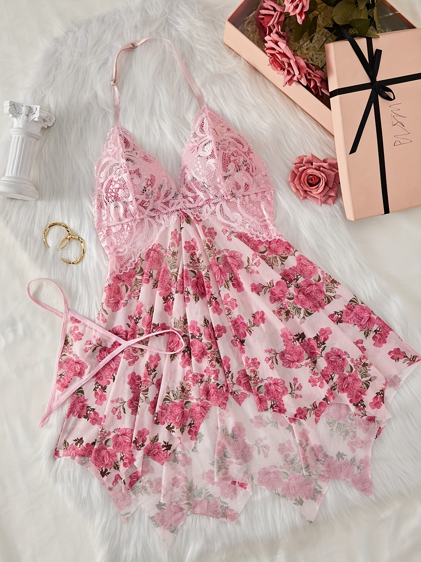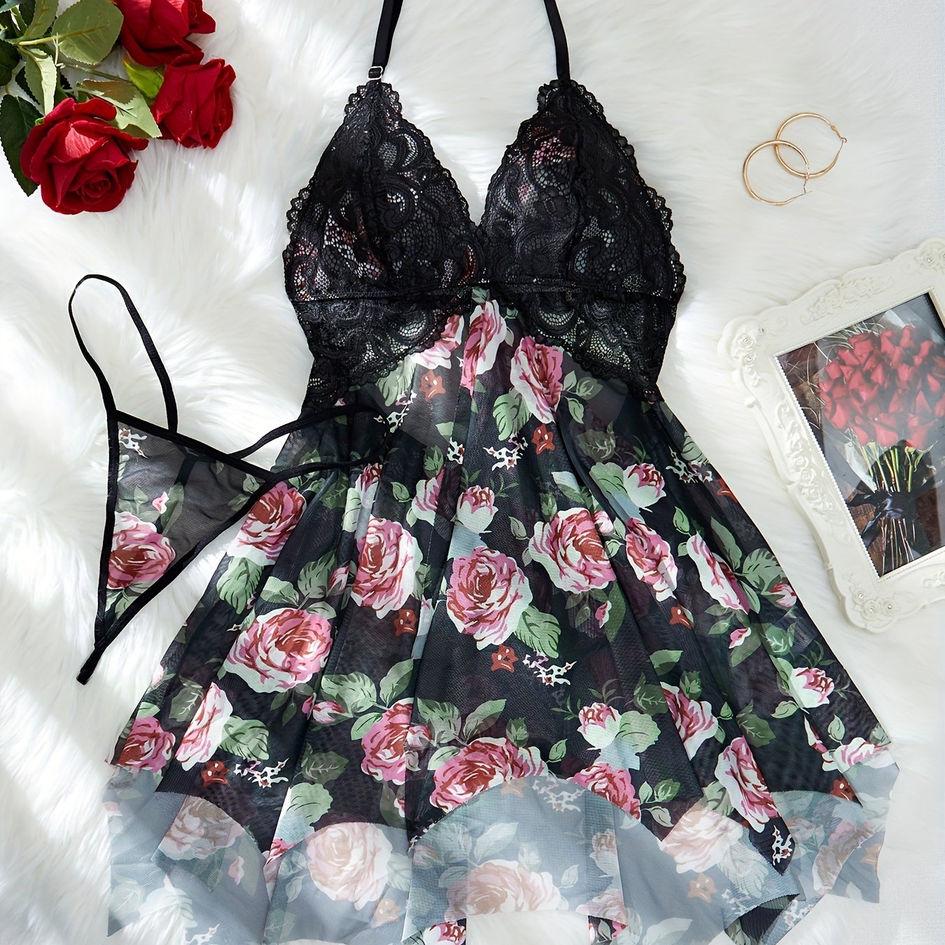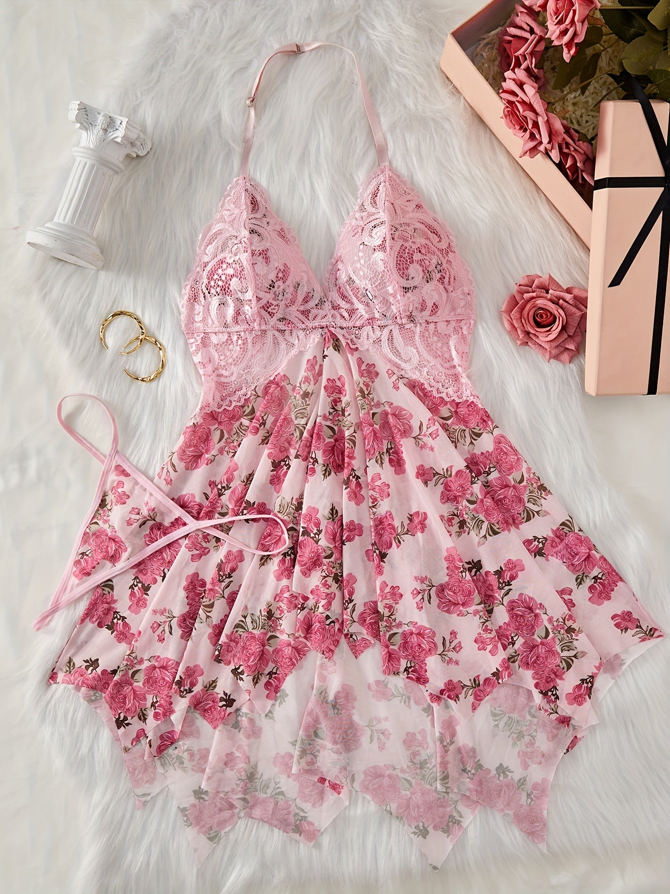 Ayollar uchun jozibali ichki kiyim, chuqur V shaklidagi dantel birikmasi dizayni, bosma naqsh, halter bo'yin va orqa qismi ochiq uslubda.