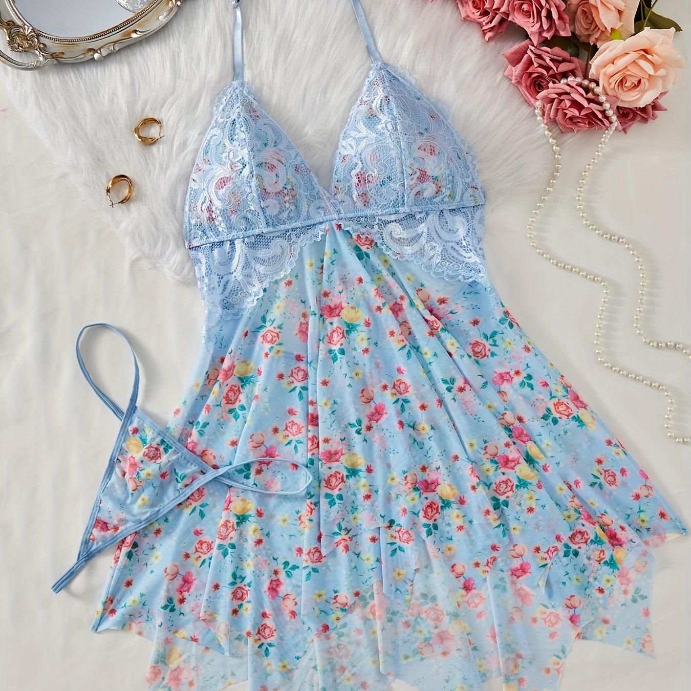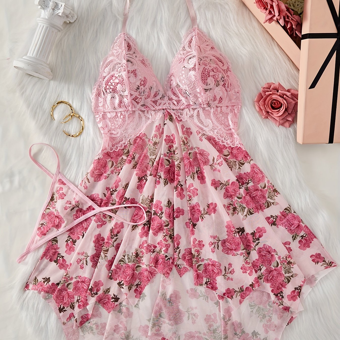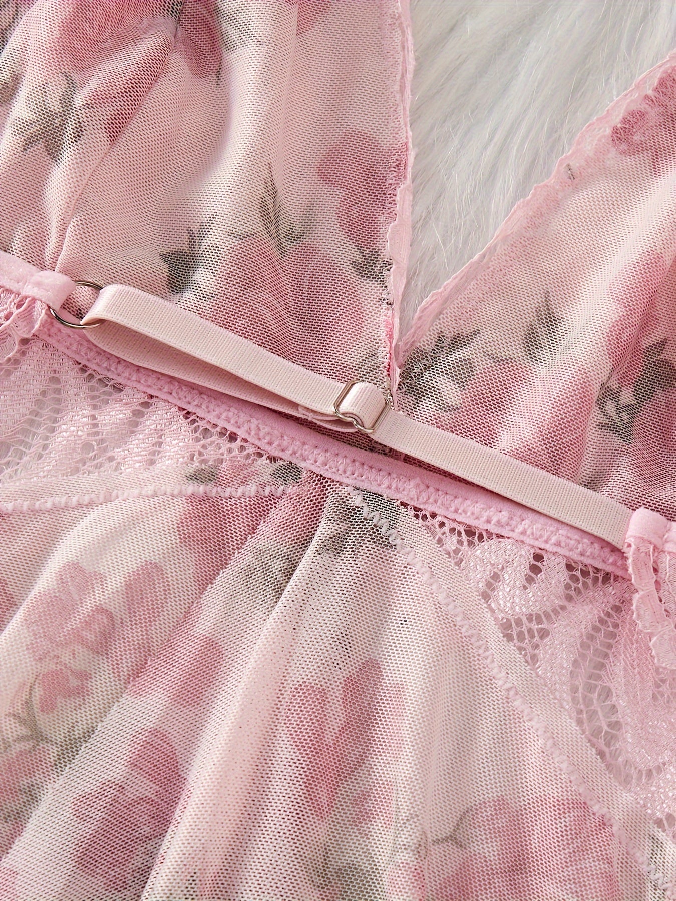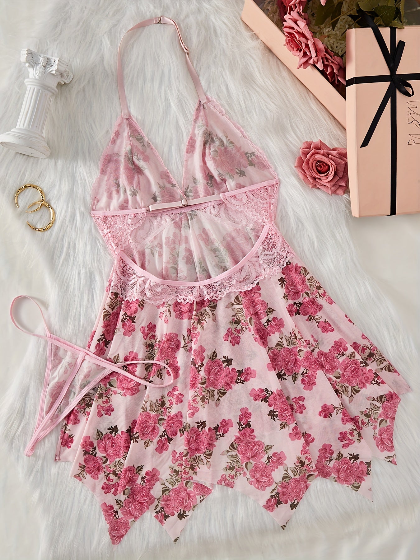 Ayollar uchun jozibali ichki kiyim, chuqur V shaklidagi dantel birikmasi dizayni, bosma naqsh, halter bo'yin va orqa qismi ochiq uslubda.