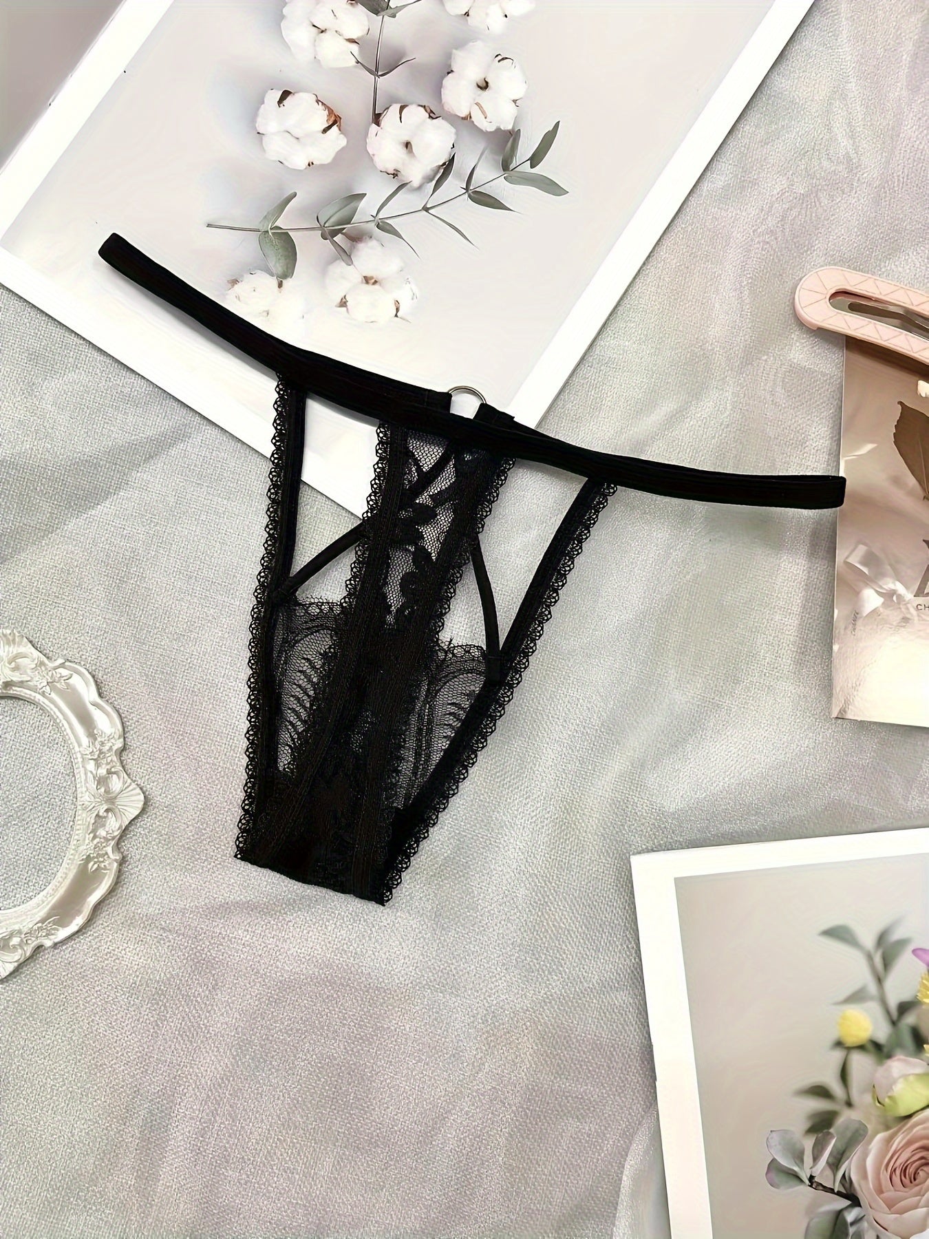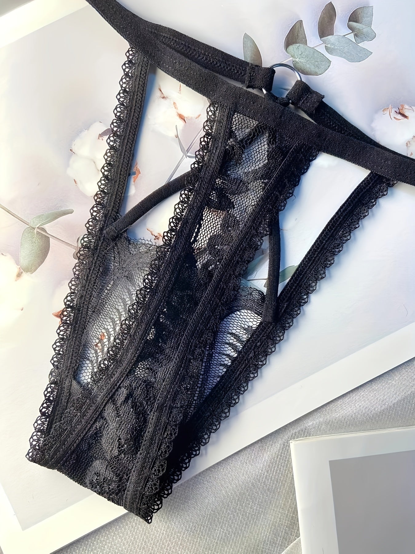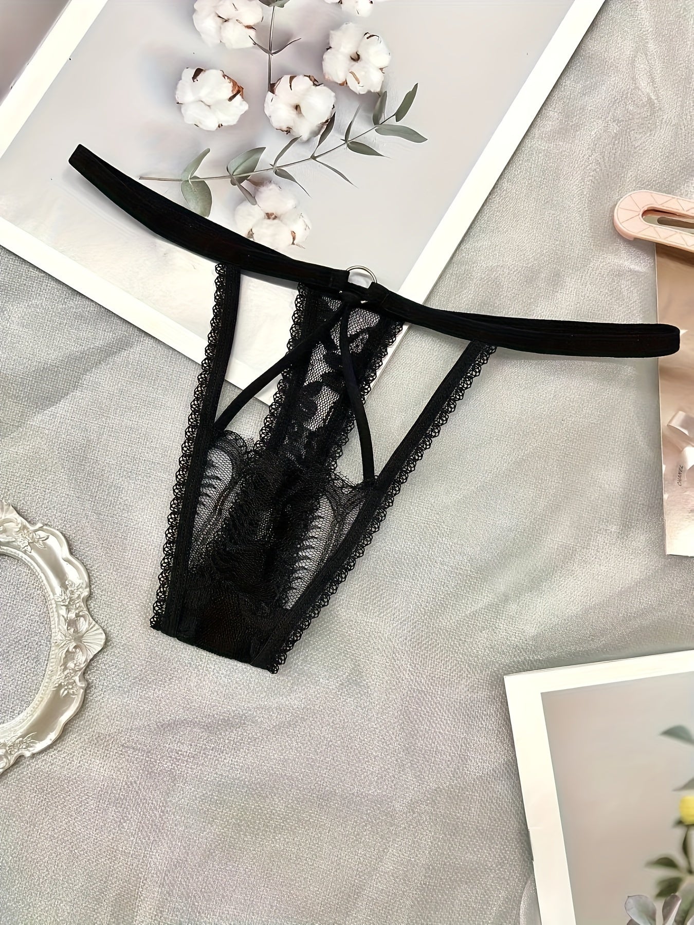 Ayollar uchun jozibali ichki kiyimlar to'rli, kesilgan past bel dizayni bilan thongni o'z ichiga oladi.