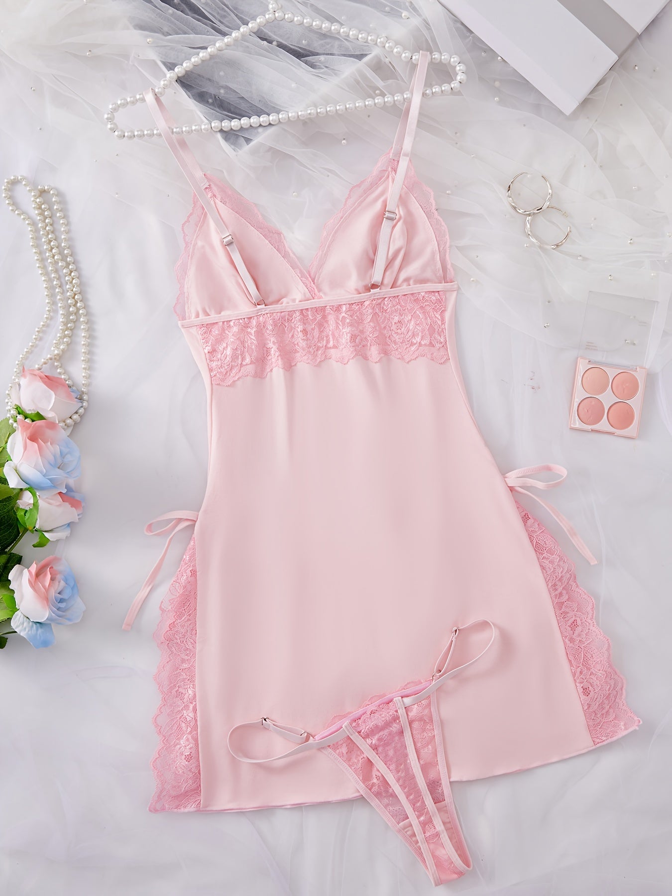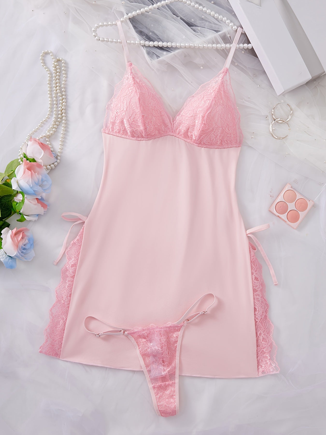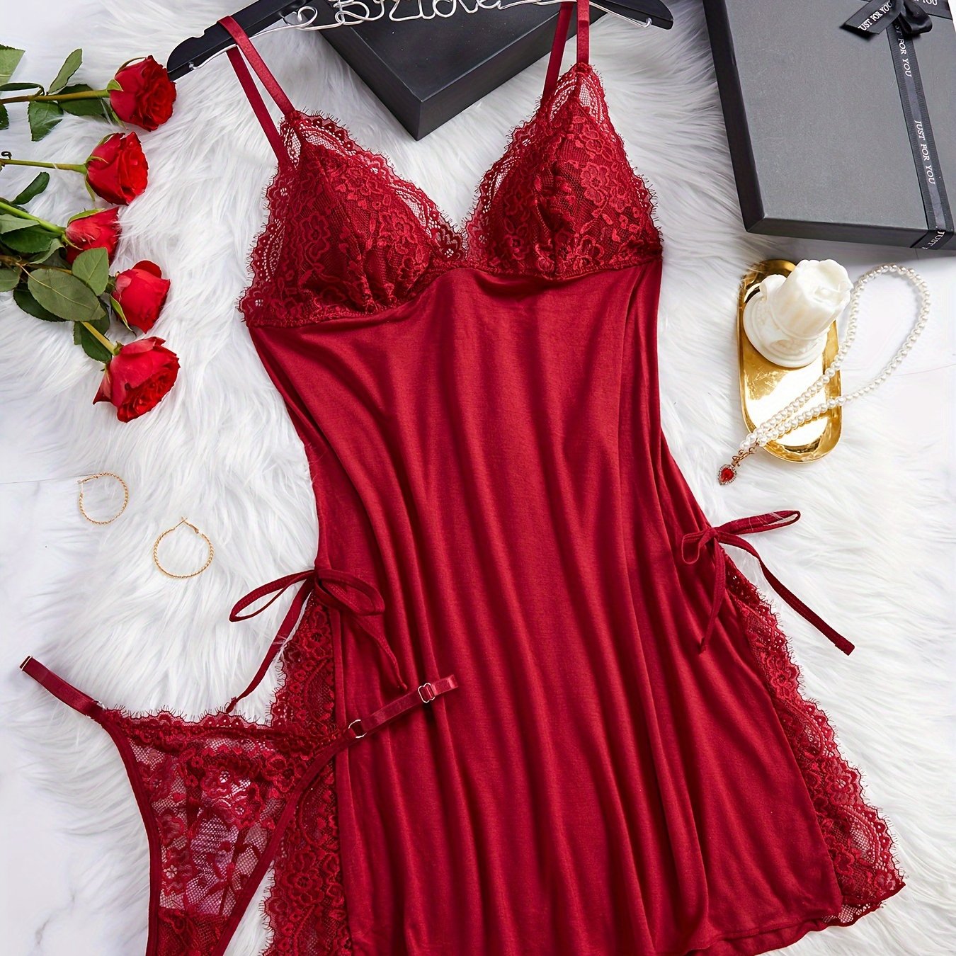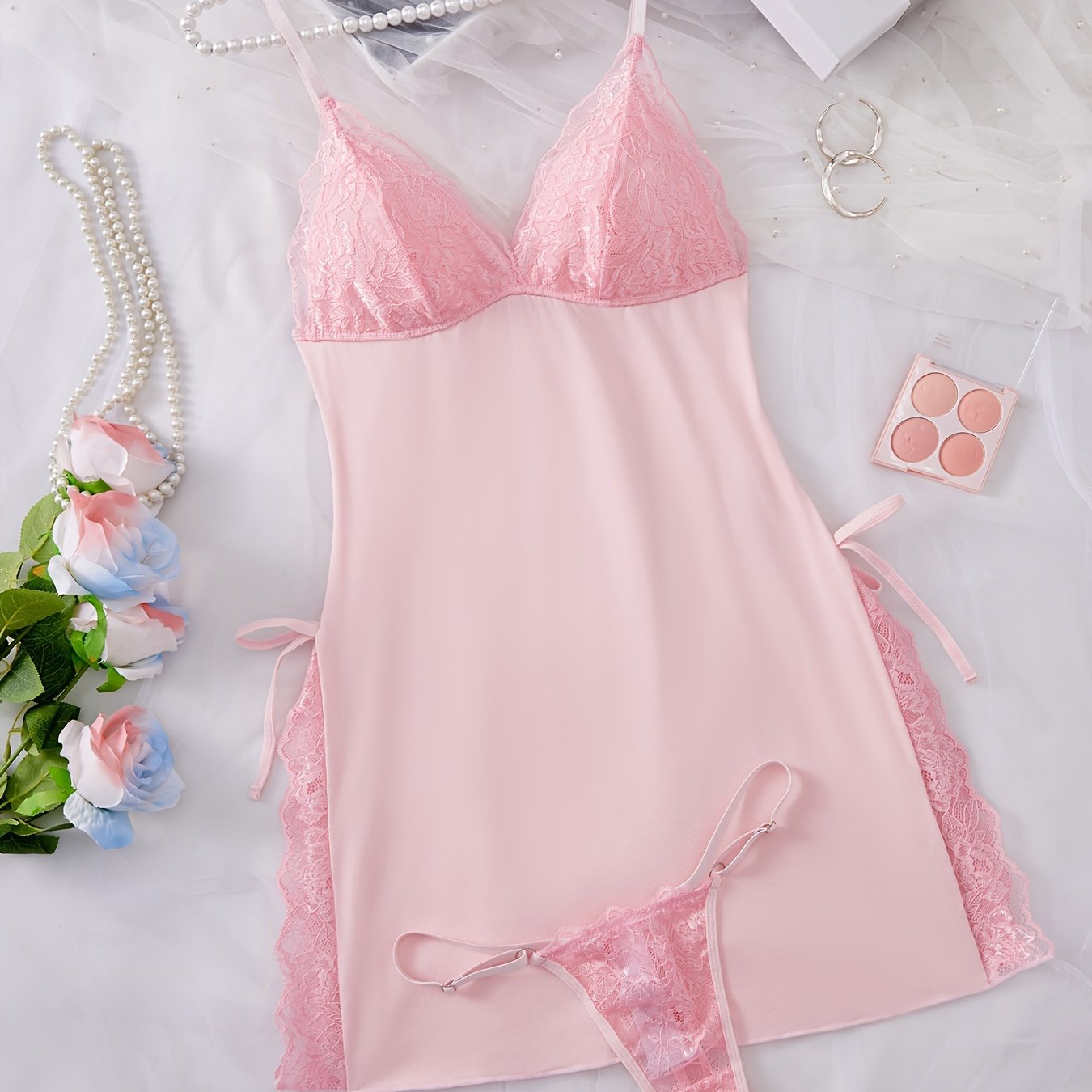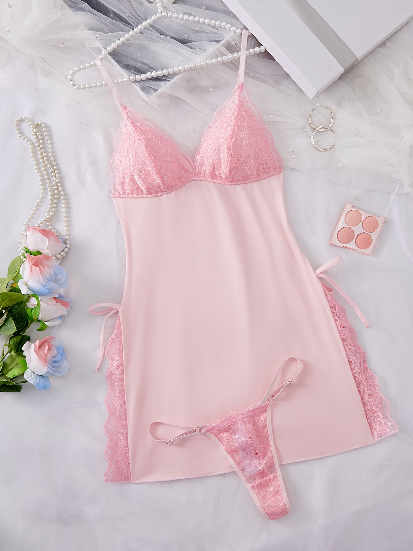 Ayollar uchun sexy tunika va ichki kiyim to'plami, V-shakl, ingichka yelka tasmalari va zamonaviy jozibali dizayn bilan.