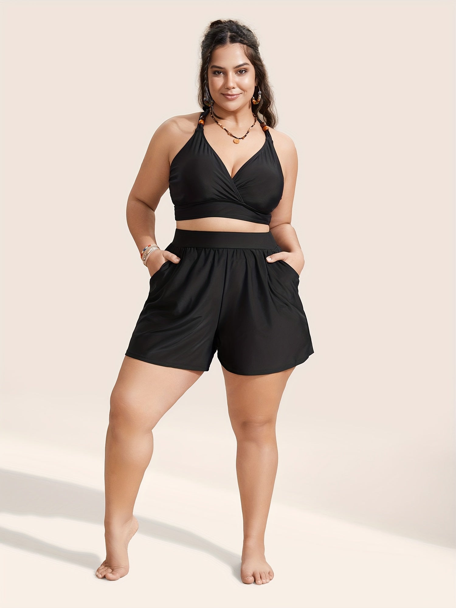 Бу қизлар учун юқори белли, қўлтўппали, бир хил рангдаги пліссировка шортлар, иссиқ ҳаво учун мос бўлган, эркин ва қулай кийим бўлиб хизмат қилади. Ўзгартириладиган ёпиқ ёзувчи билан эгаликда бўлган эластик белтўзак ва қўлтўппалар билан жиҳозланган, улар қулайлик ва ҳаракат эркинлигини таъминлайди. Ташқи фаолиятлар ва кундалик касуал кийимлар учун идеал, уларнинг бир хил ранг ва ўртача эластан мато билан стиль ва қулайликни бирлаштиради.