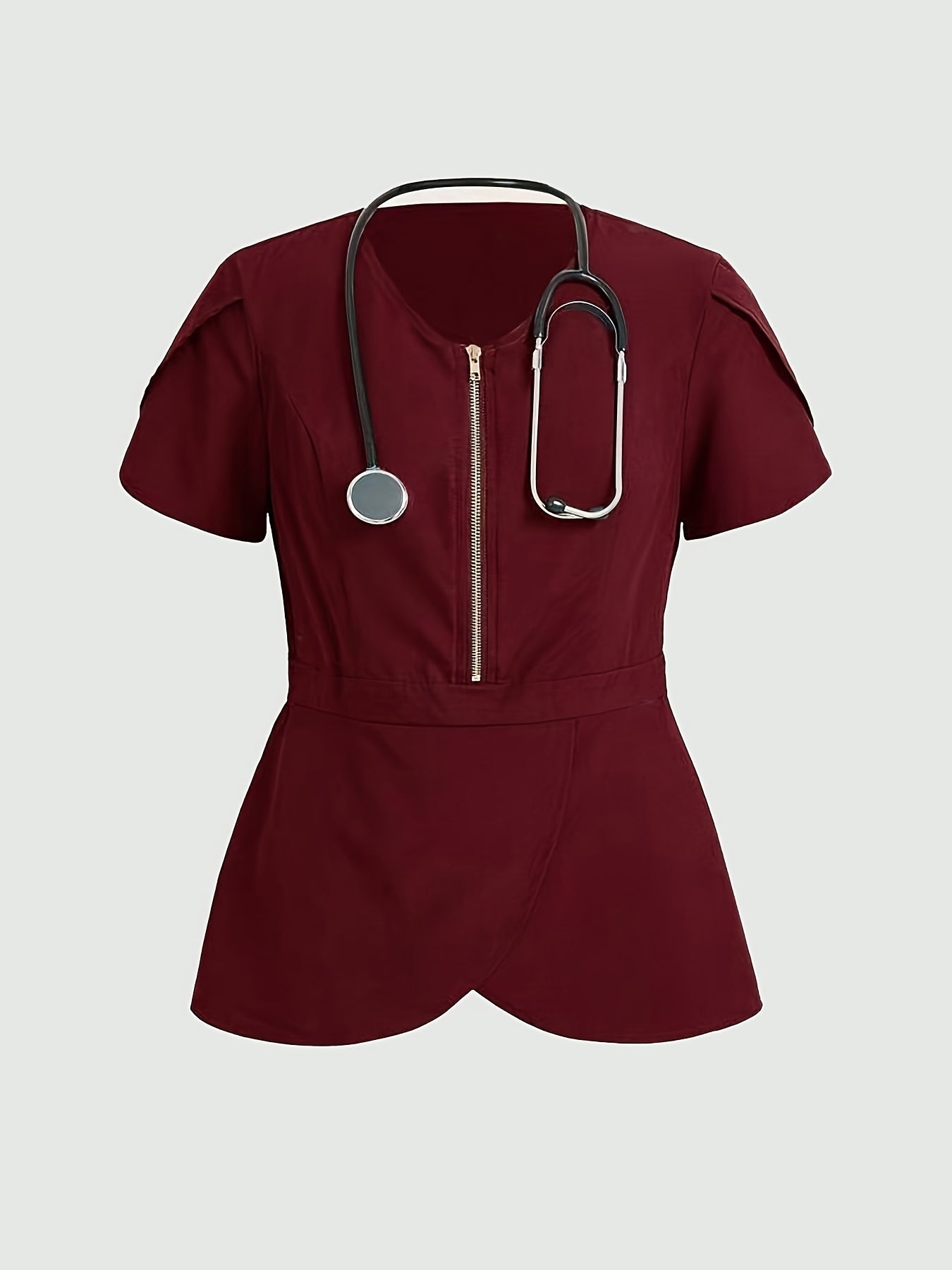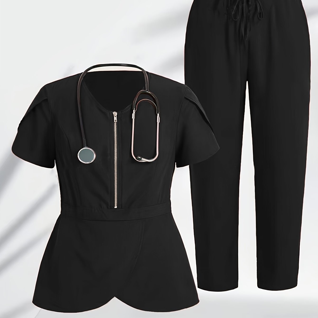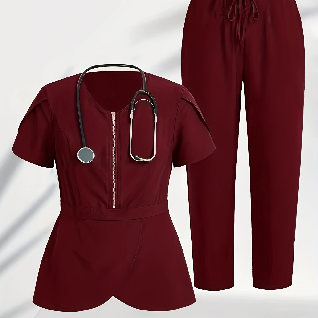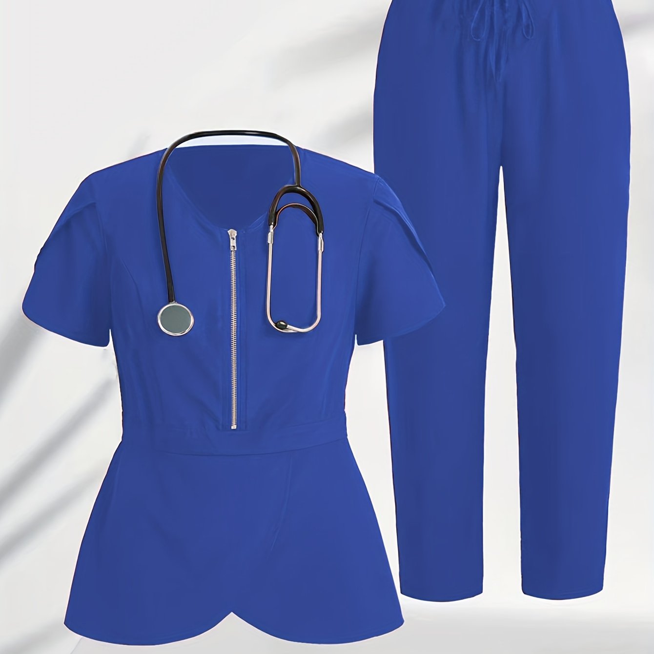 Ayollar uchun rangsiz polyester skrab to'plami, yelkasiz dizayn, qisqa petal yenglar, ozgina cho'ziladigan mato va zipper tafsiloti bilan. Barcha mavsumlar uchun tibbiy hamshiralik formalariga mukammal.