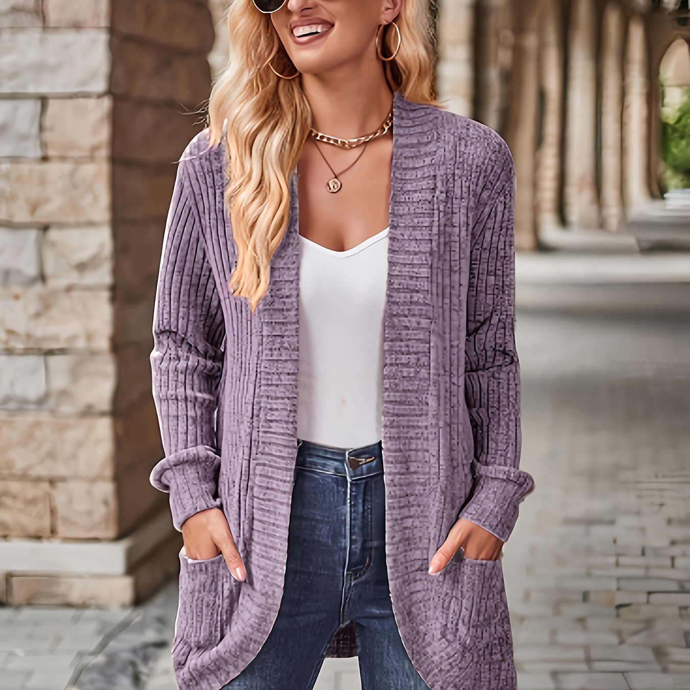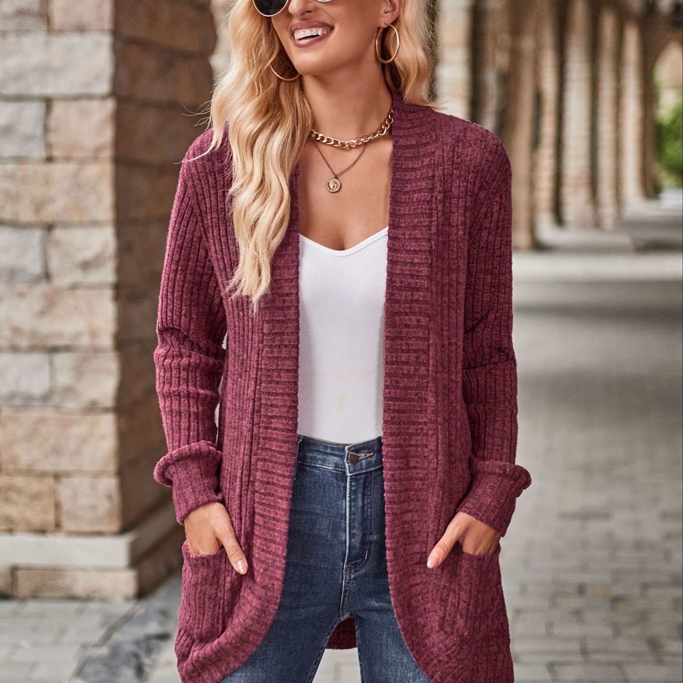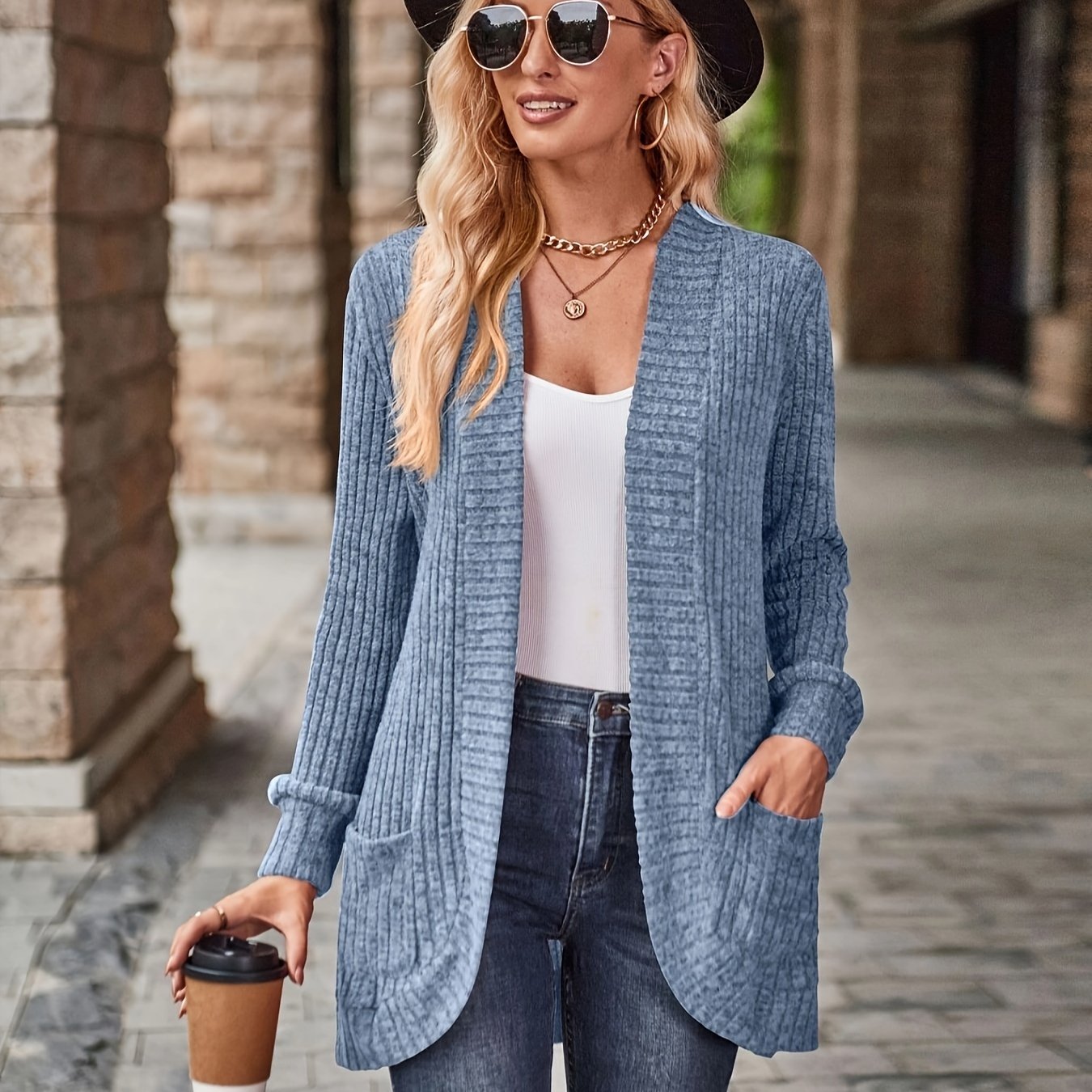 Ayollar uchun bir rangli ribli trikotaj kardigan, cho'ntaklar bilan, uzun qo'lli tashqi kiyim