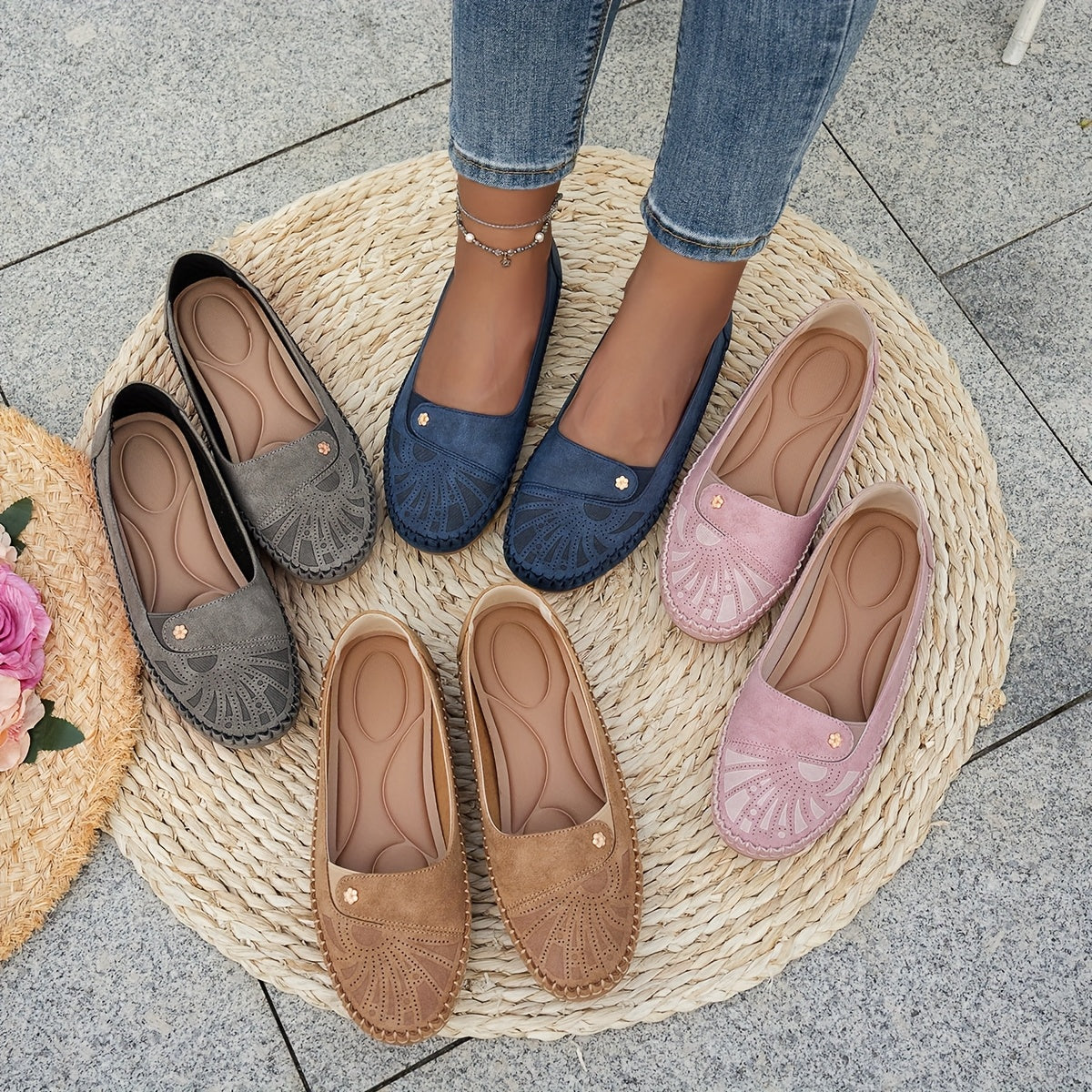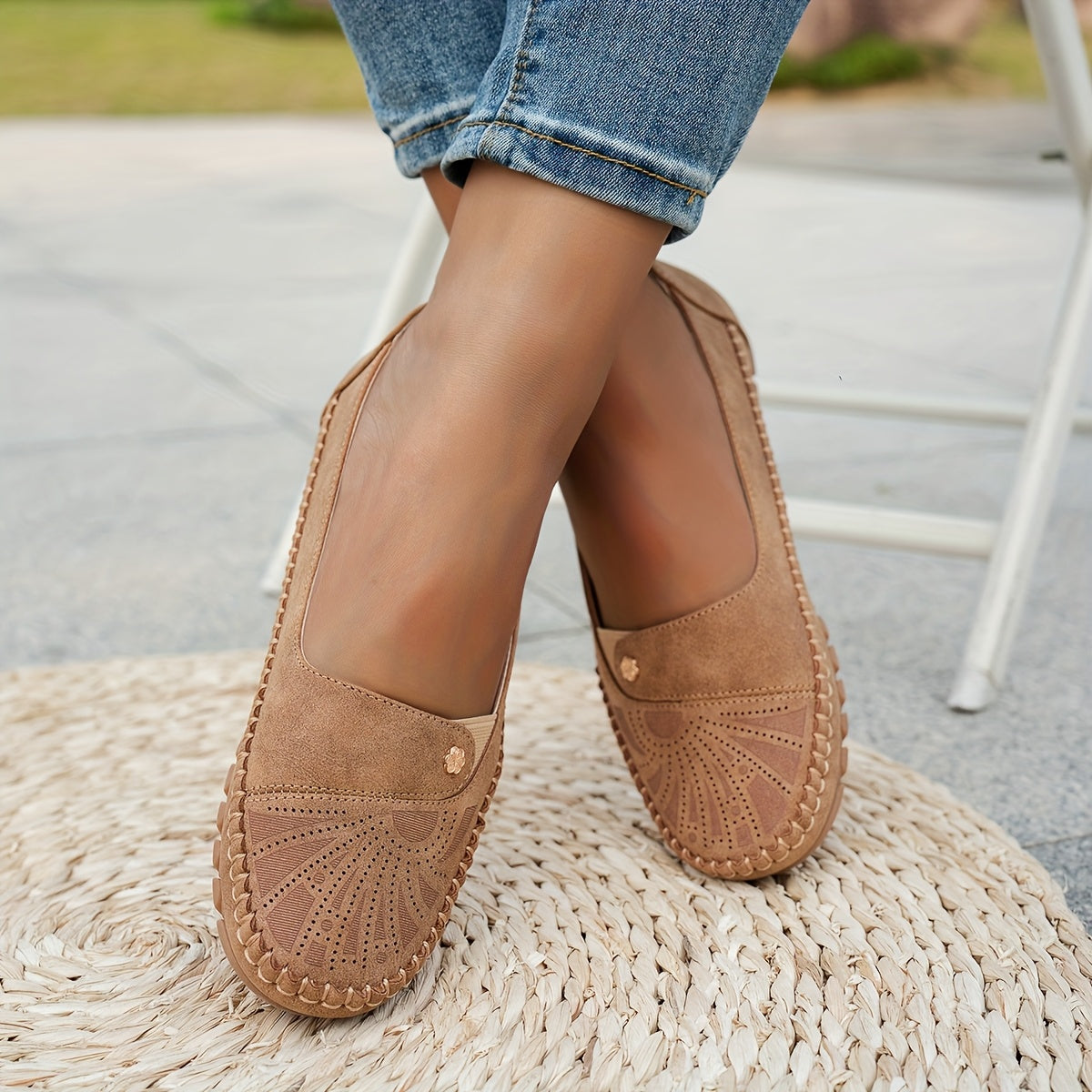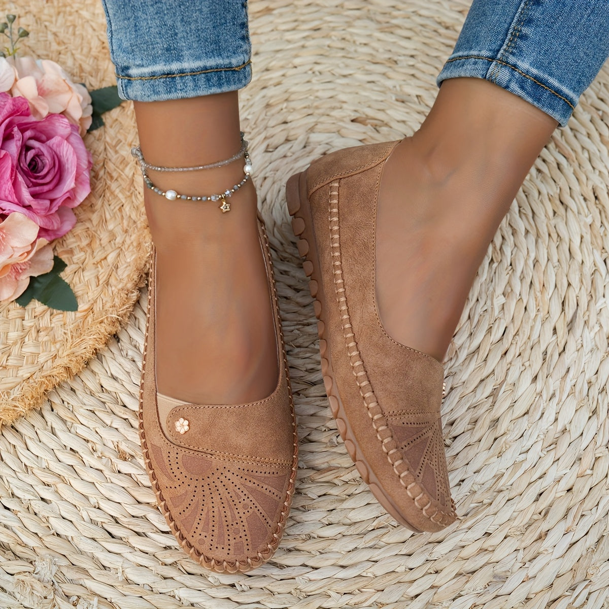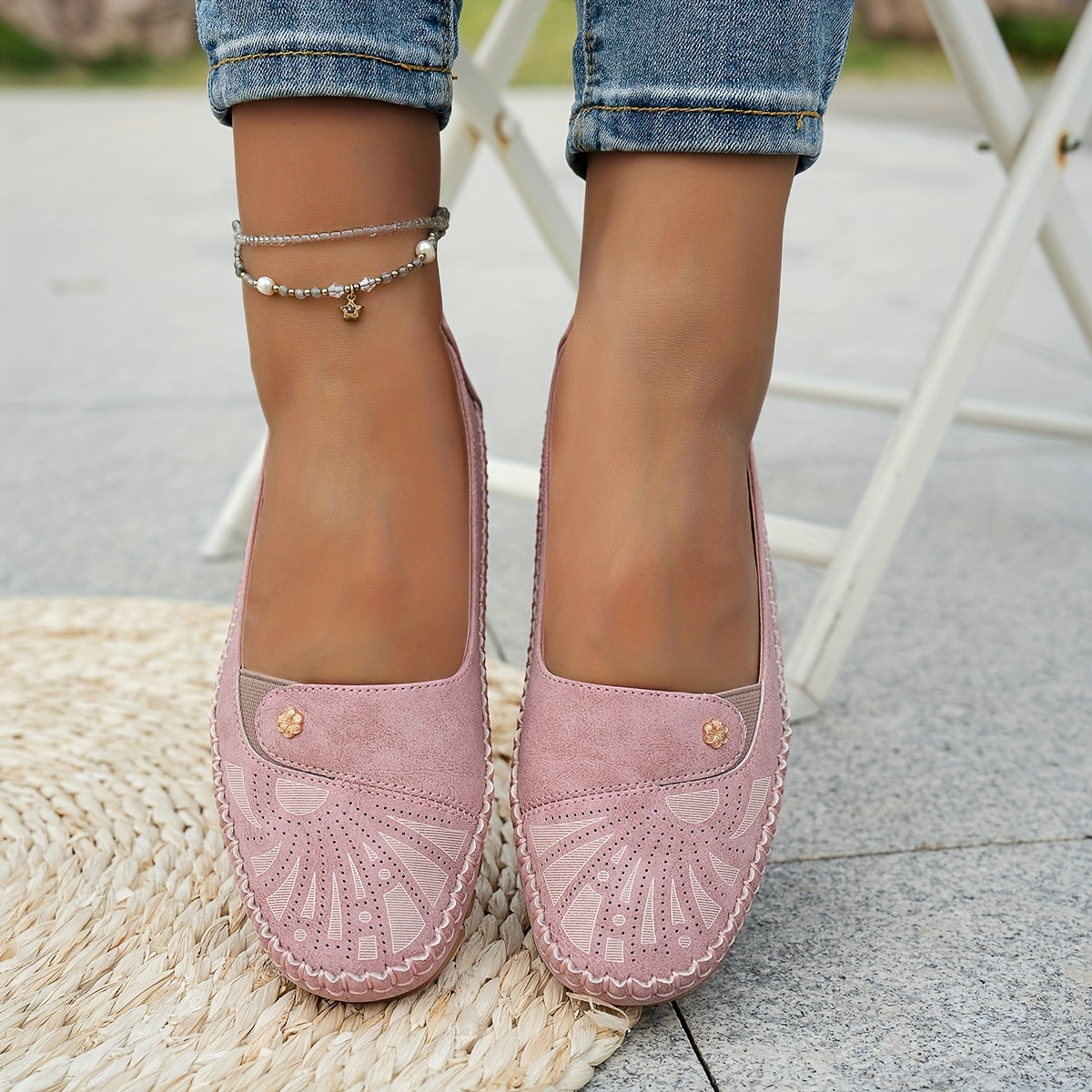 Ayollar uchun vintage gul naqshli lenta bilan yopiladigan kundalik qulay barcha mavsum poyabzali