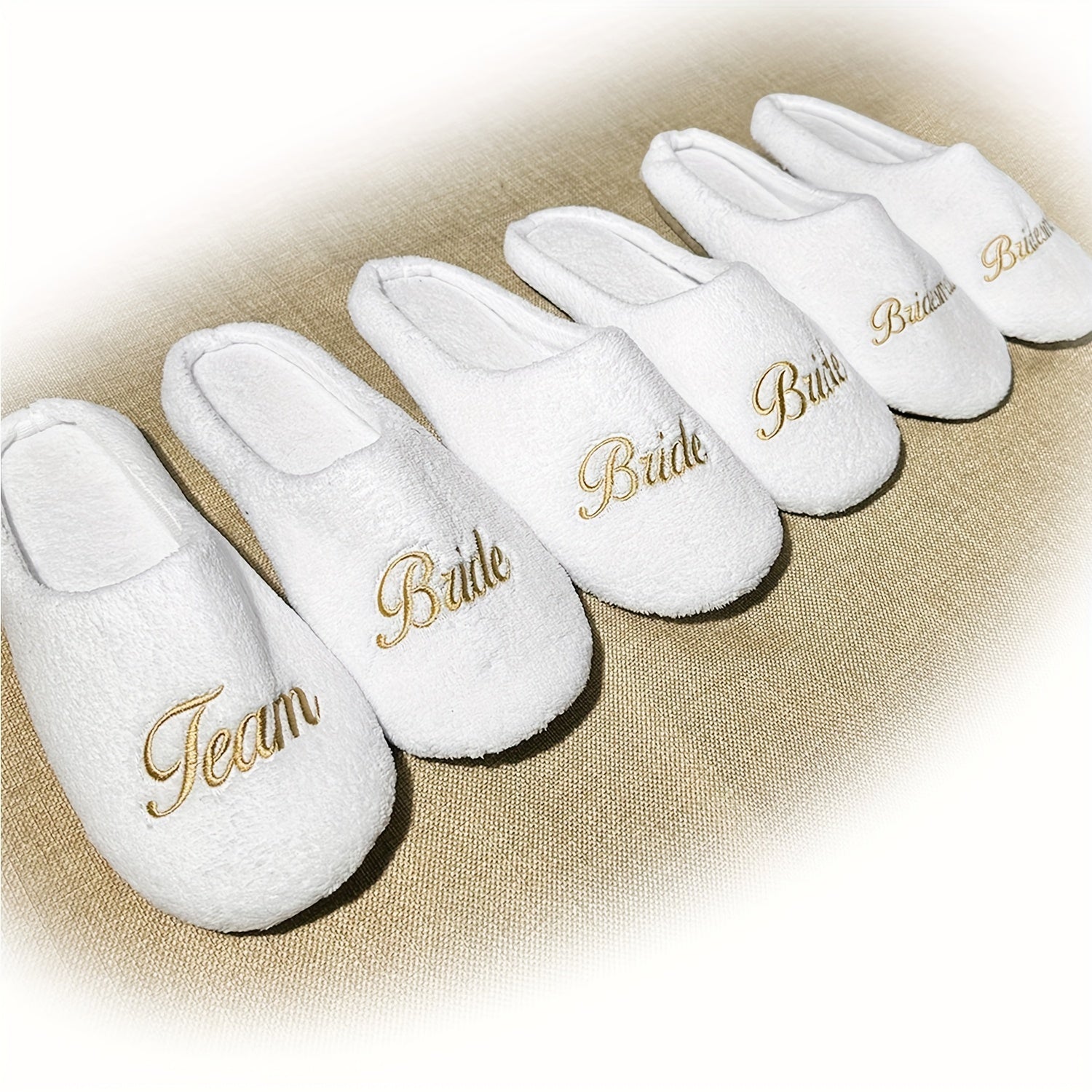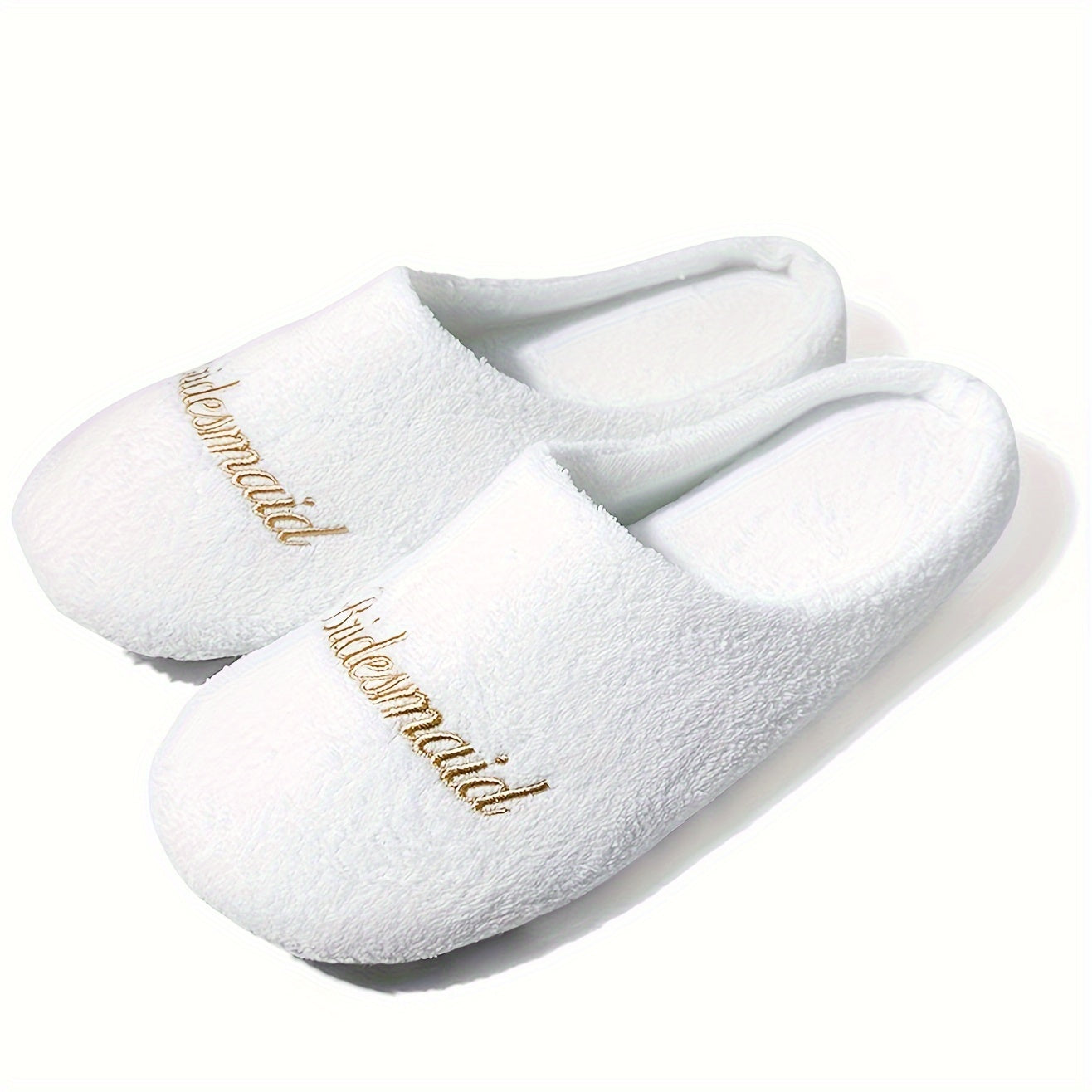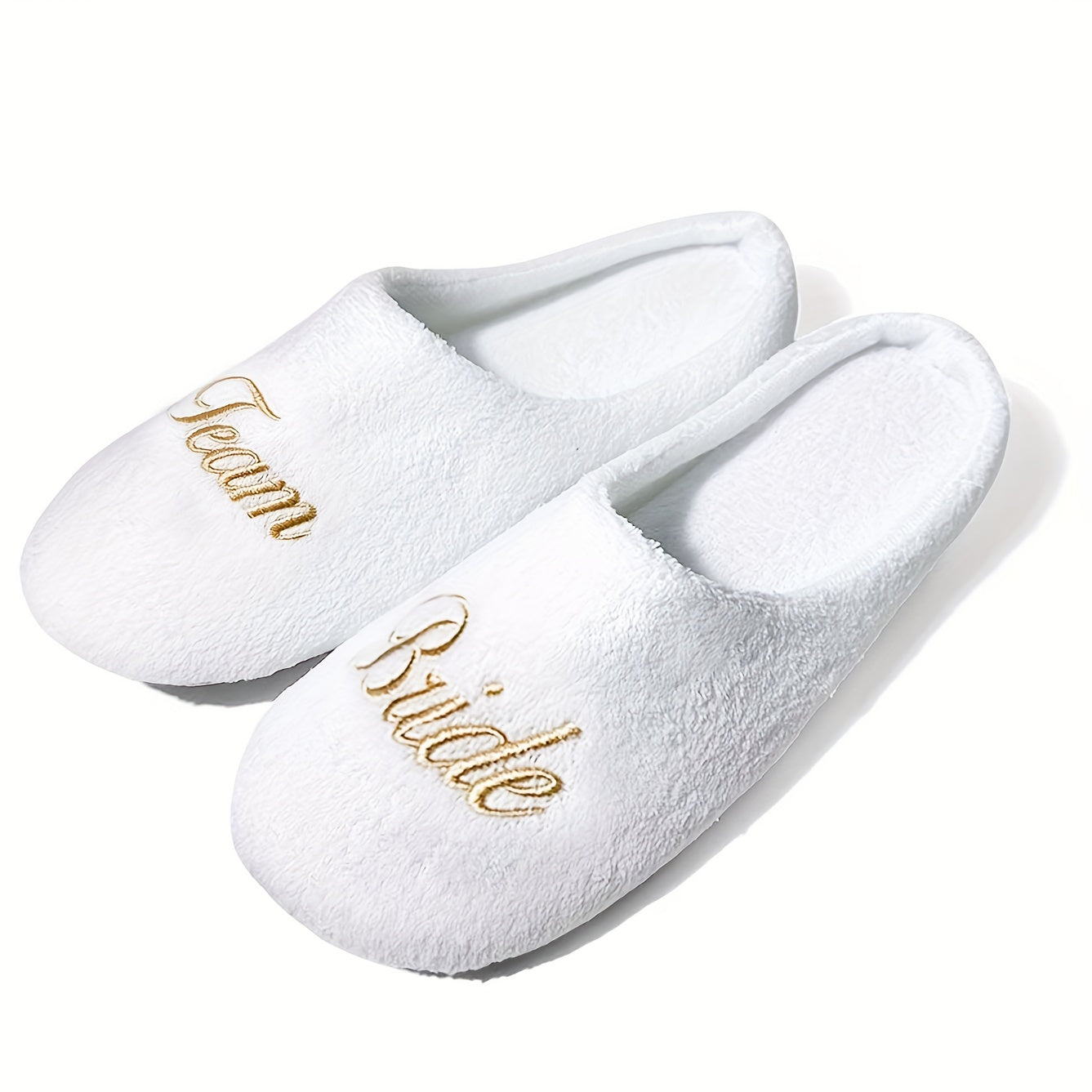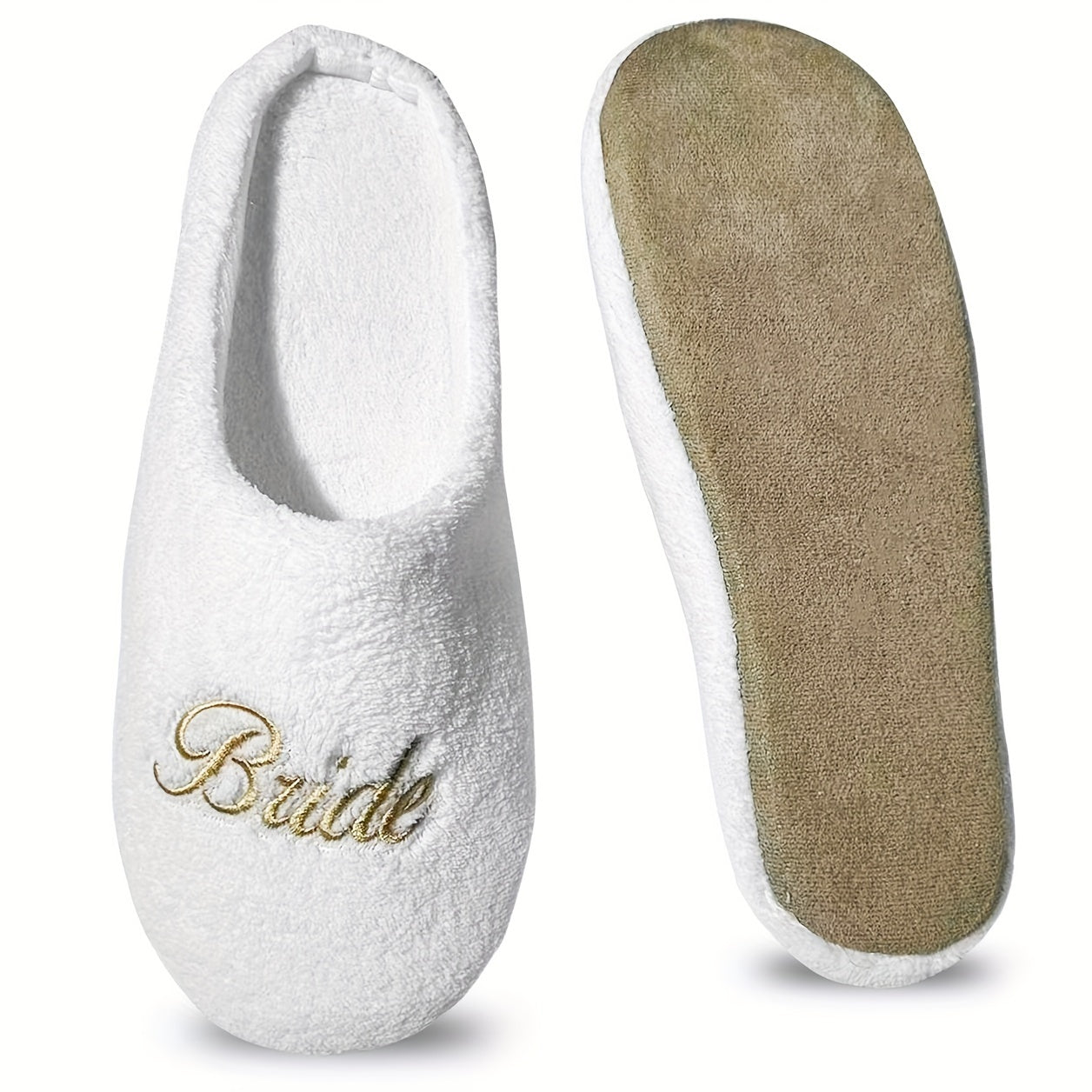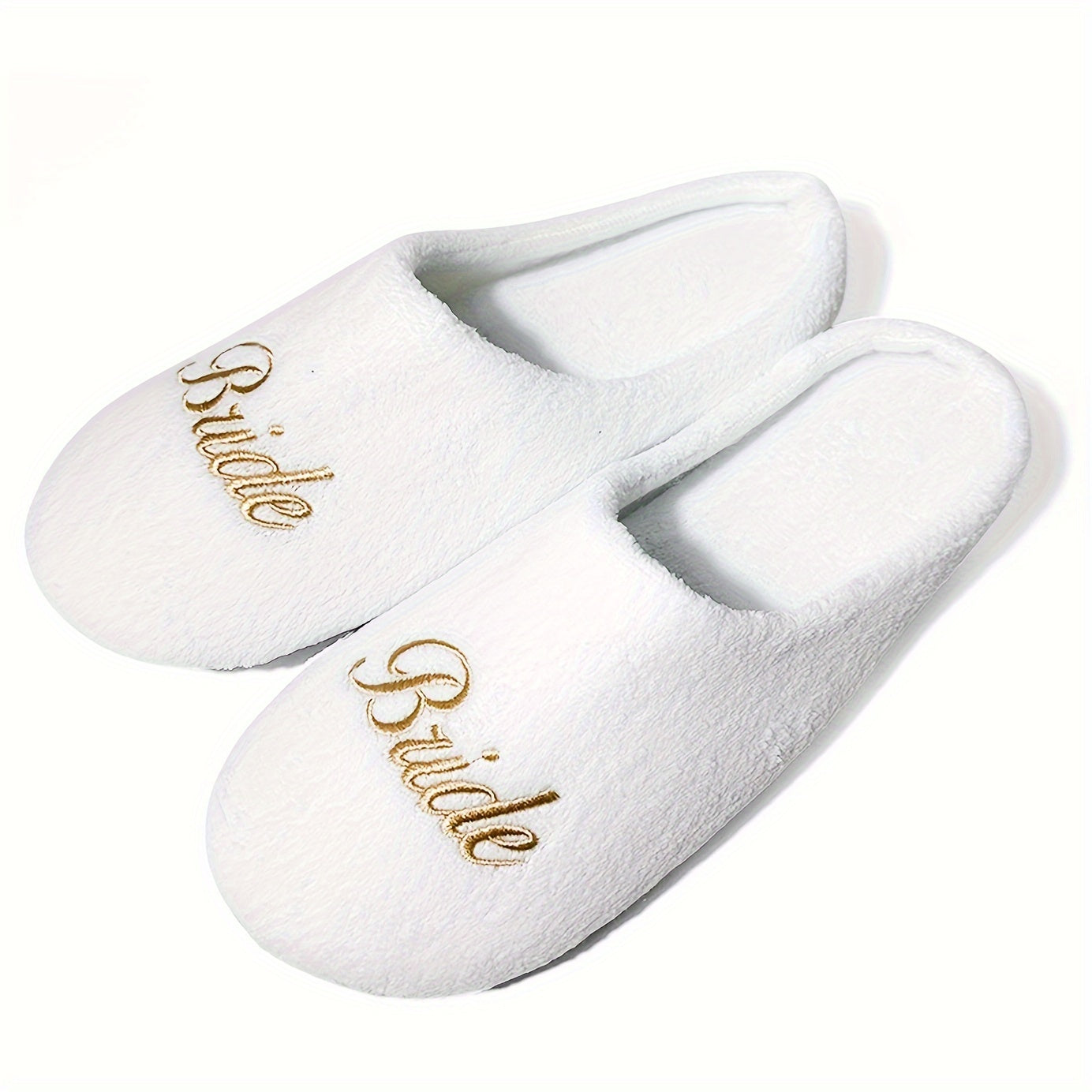 Ayollar uchun oq mo'rt va shilimshiqlik bilan bezatilgan to'yli va oltin harflar bilan yozilgan uy poyabzali