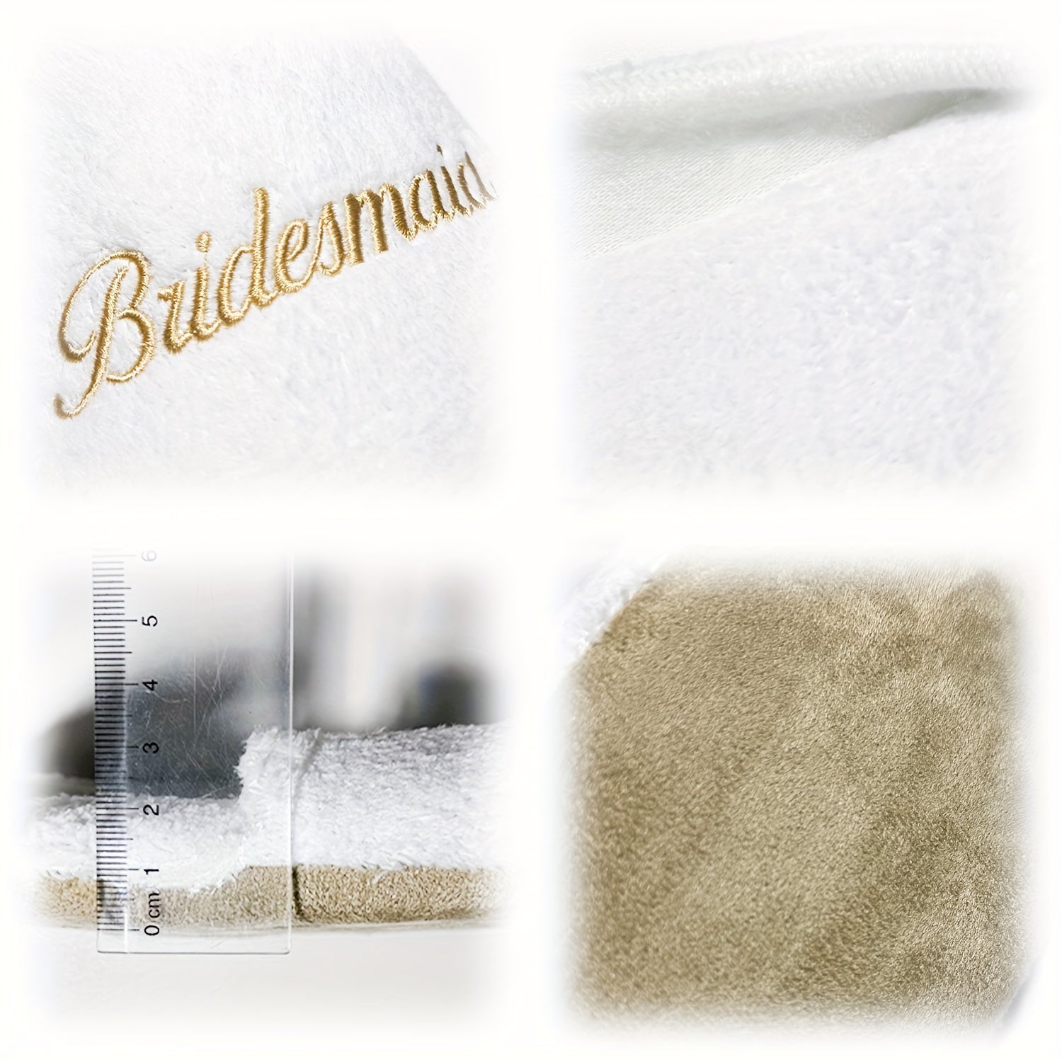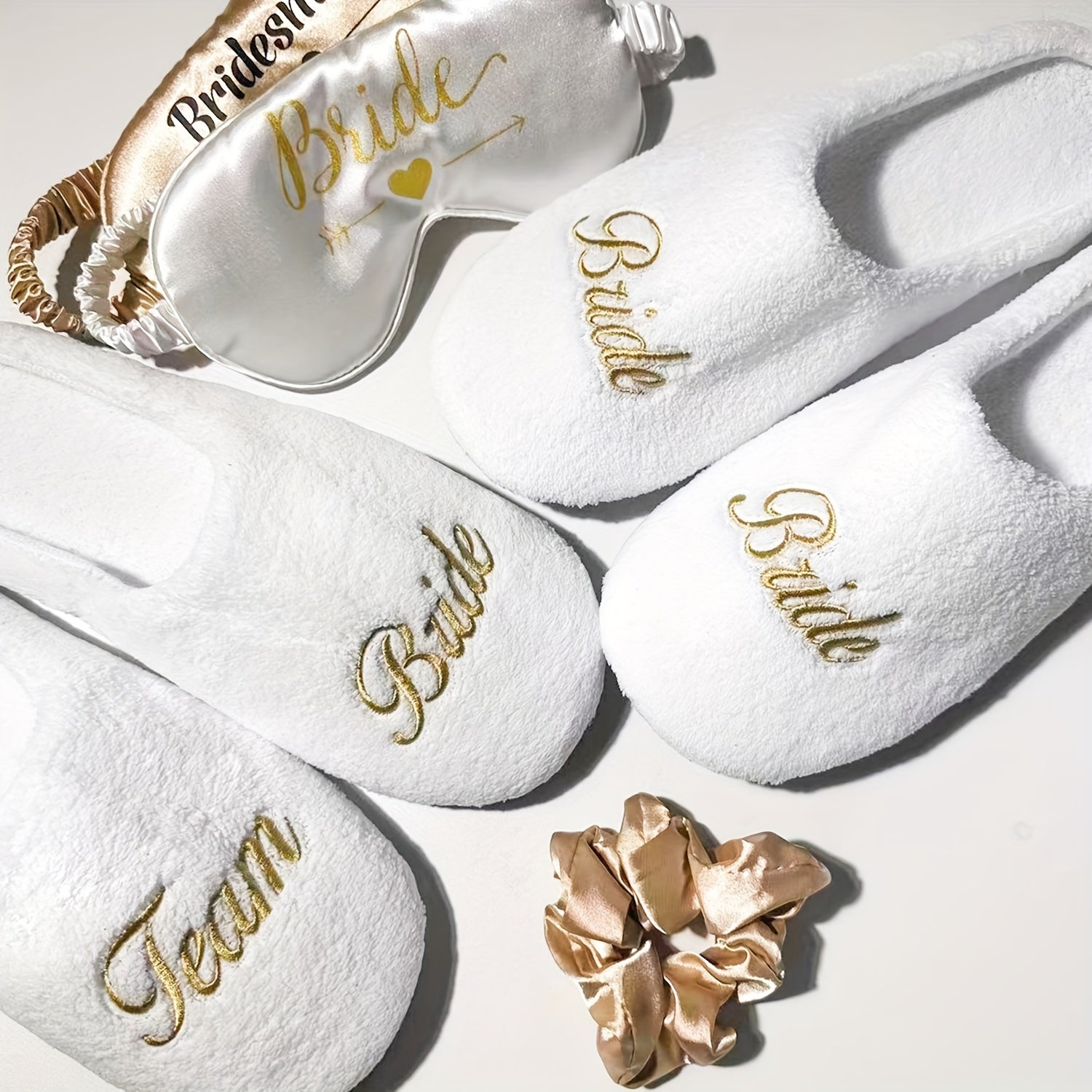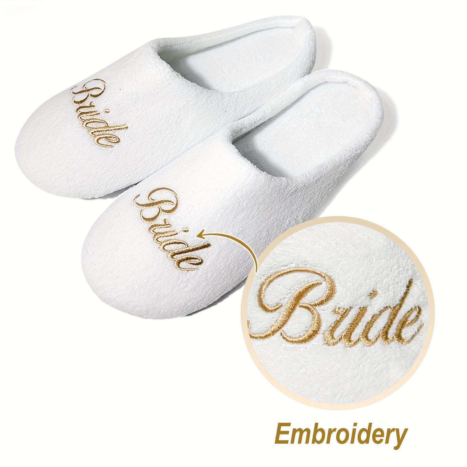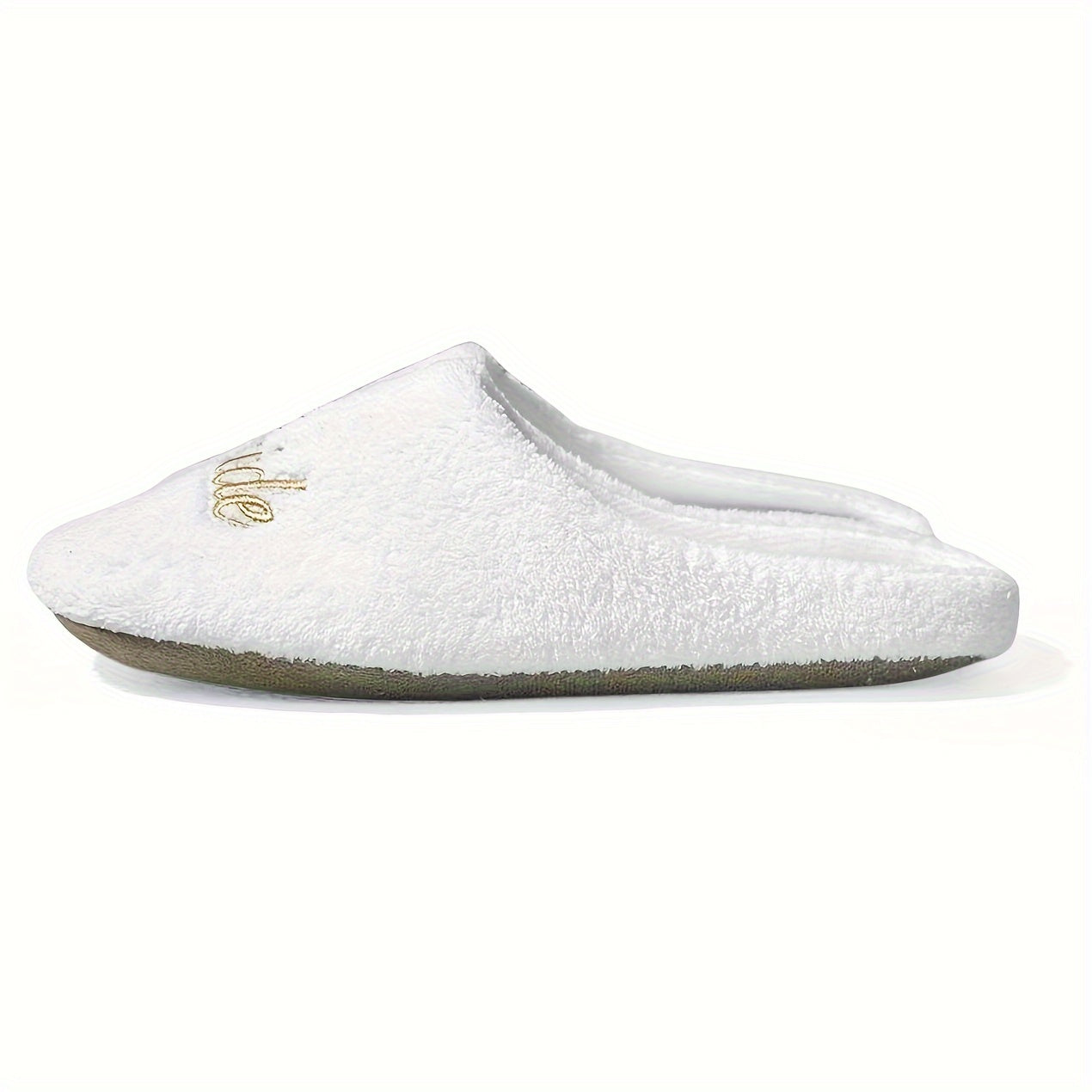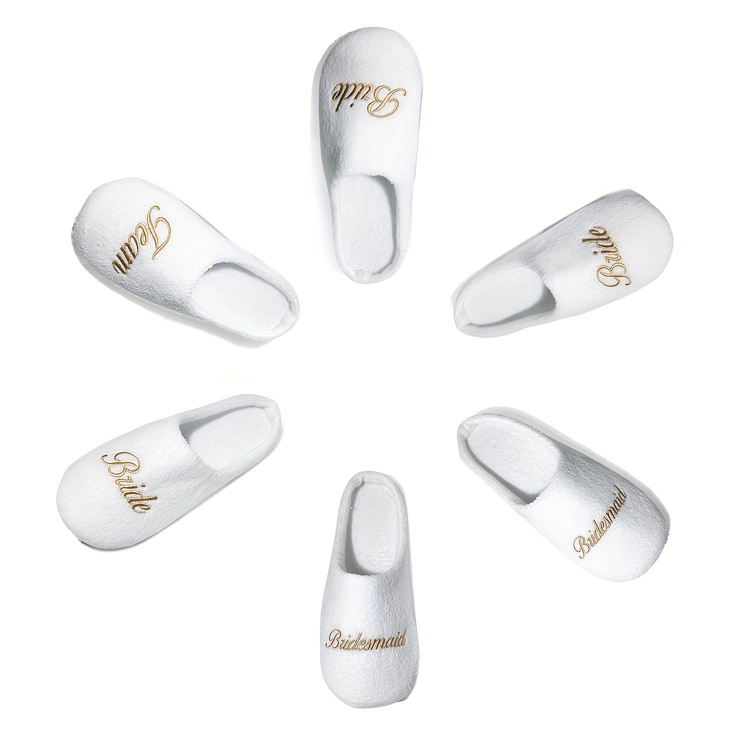 Ayollar uchun oq mo'rt va shilimshiqlik bilan bezatilgan to'yli va oltin harflar bilan yozilgan uy poyabzali