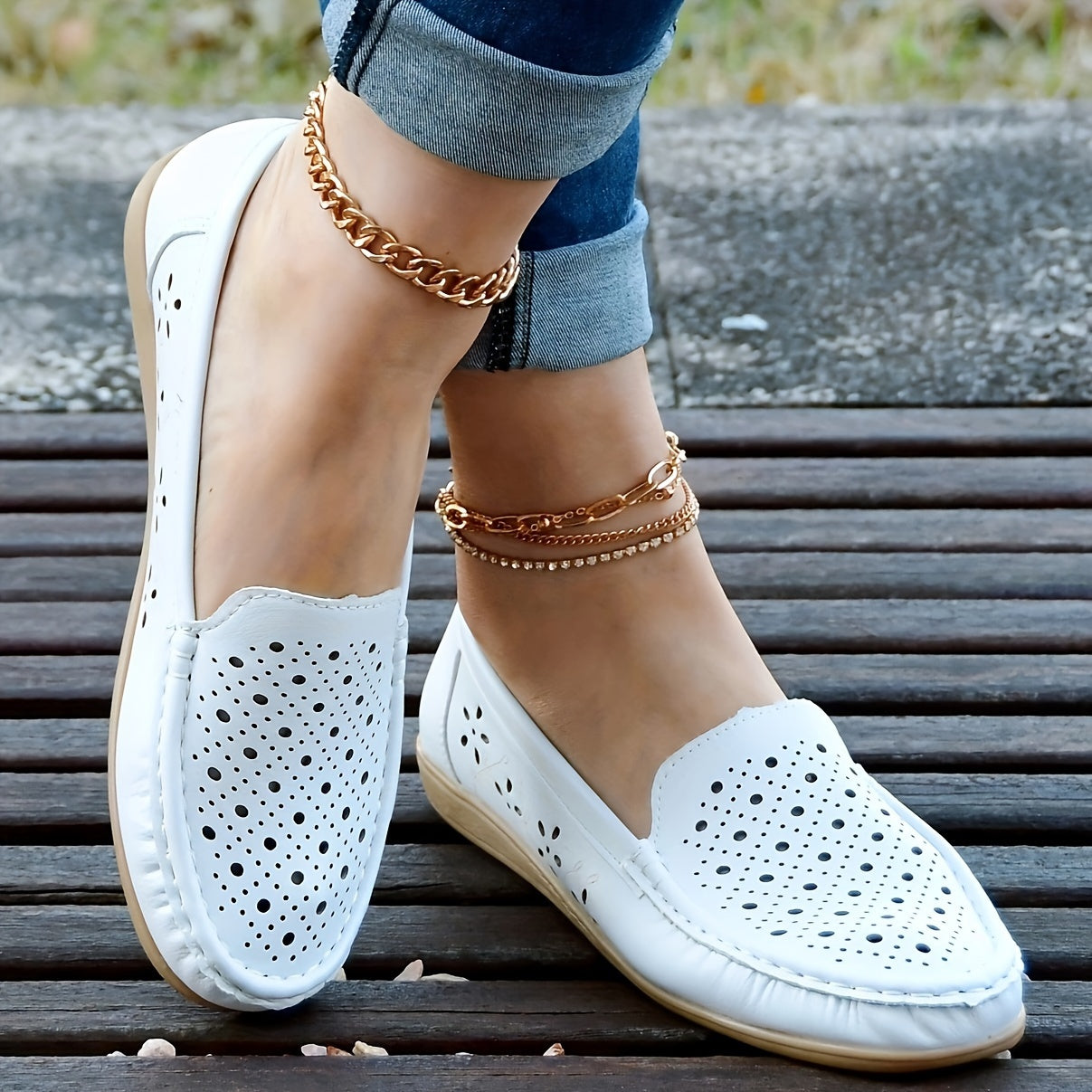 Ayollar uchun oq slip-on loafers, nafas olish uchun perforatsiyalangan dizayn, sirpanmaydigan taglik, dumaloq barmoq va har mavsumda kiyish uchun ko'p funksiyali tasodifiy uslub.