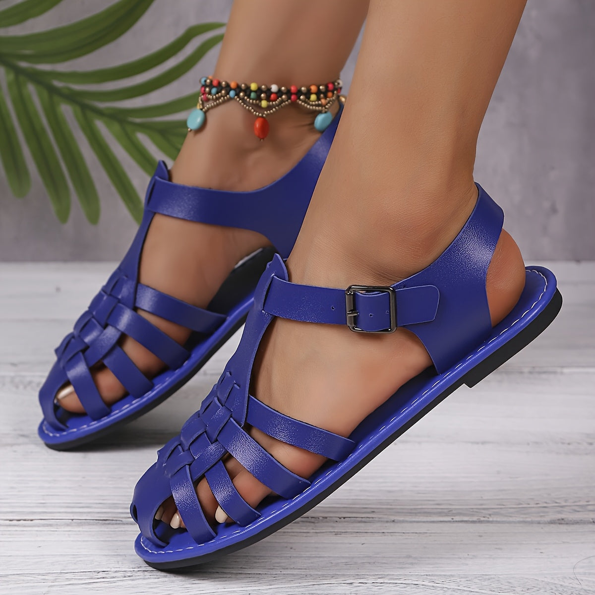 Women's Woven Closed-Toe Roman Sandals Adjustable Buckle Flat Summer Shoes