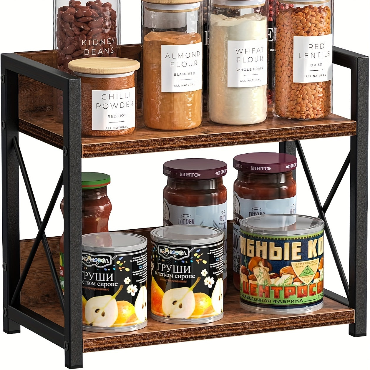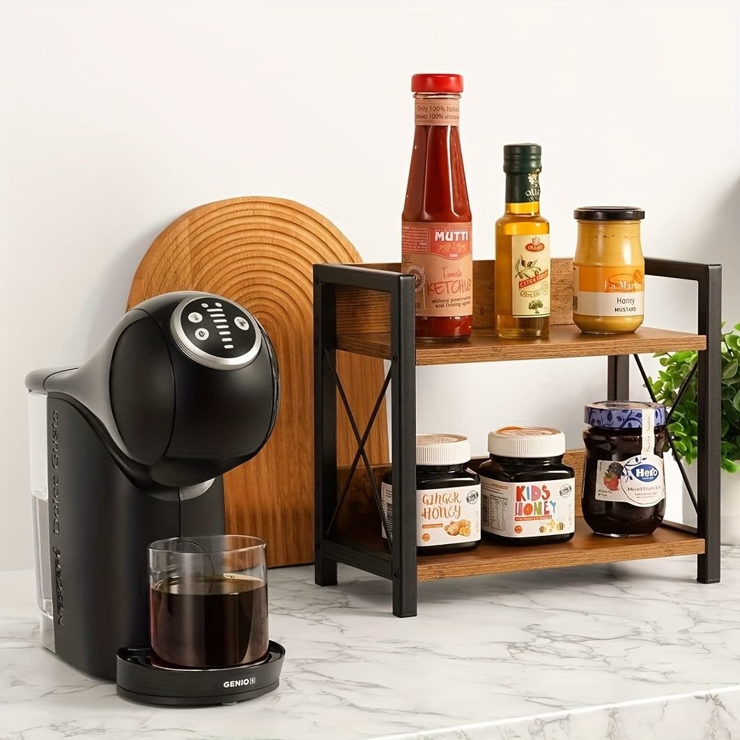 Ochiq dizayndagi yog'och va metall ziravorlar javoni, Rustik jigarrang 2-qavatli stolda tashkilotchisi, qahva stansiyasi saqlash javoni uchun mukammal.