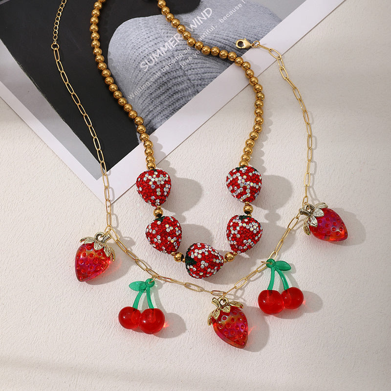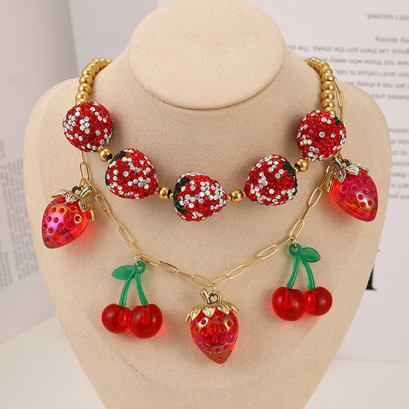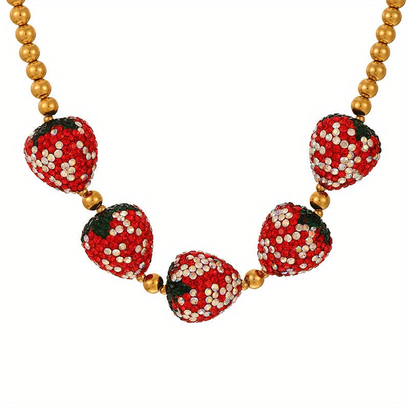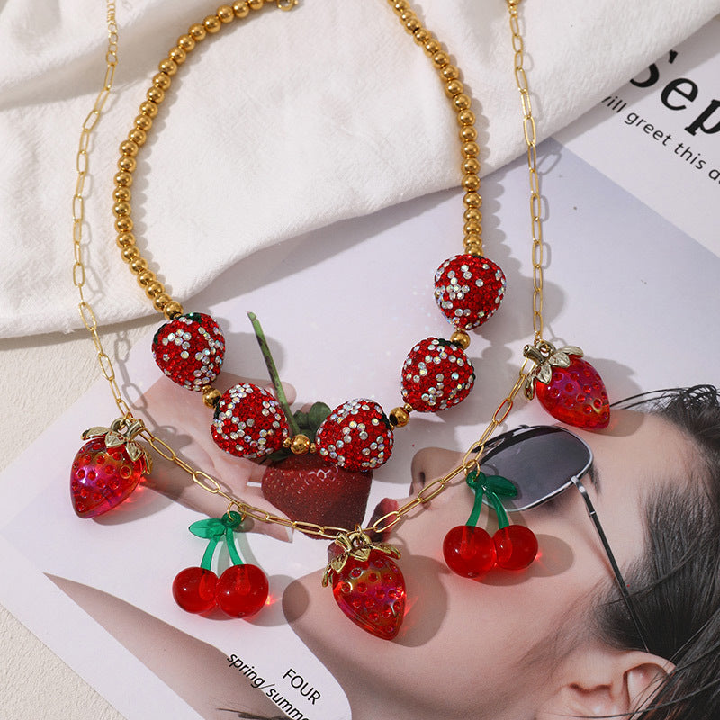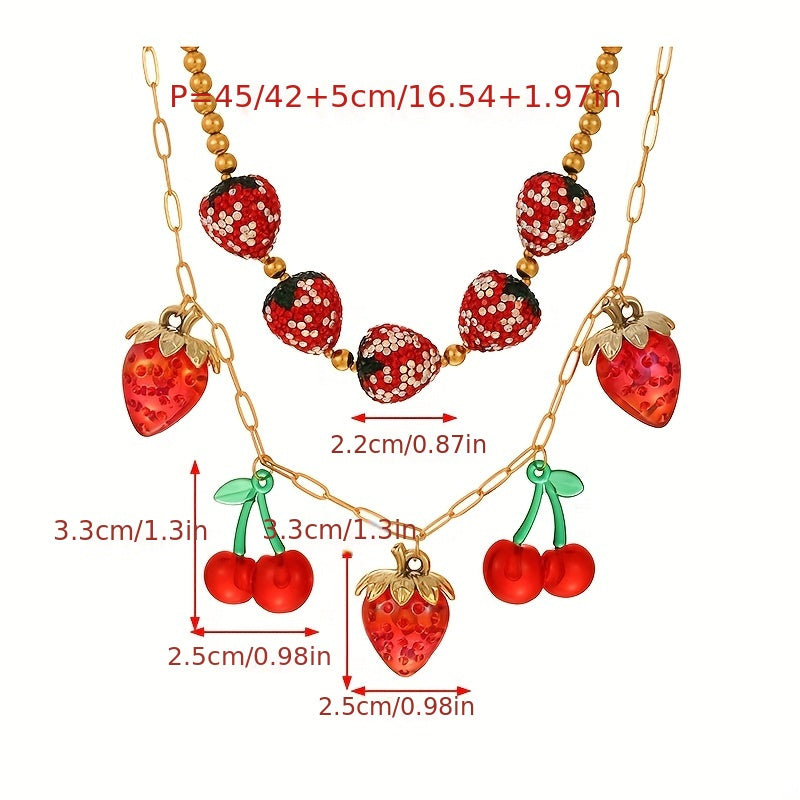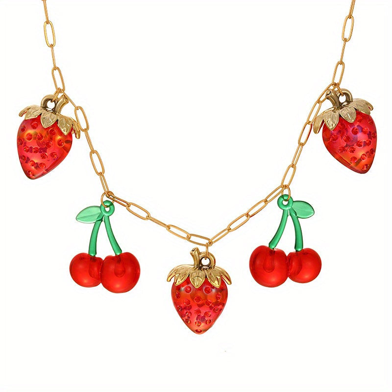 Y2K ilhomlangan nafis qatron qulupnay va gilos pendant marjon, yorqin qizil va oltin aksentlar bilan - ayollar va singillar uchun ajoyib, partiyalar va bayram tadbirlari uchun mukammal