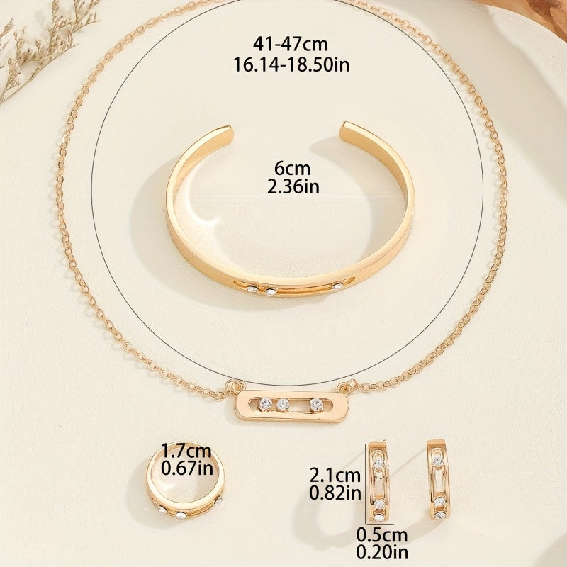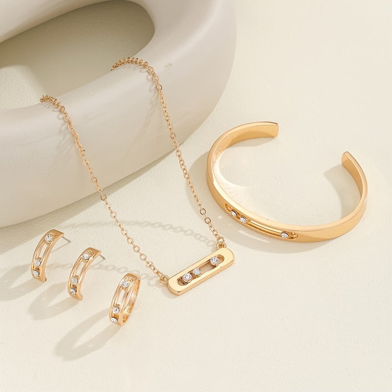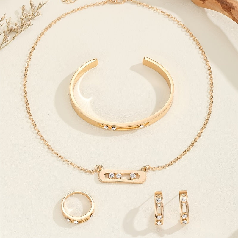 5 ta qismdan iborat rux alloy zargarlik to'plami, rhinestone mozaikasi bilan oddiy shahar modasini taqdim etadi, geometrik ellips dizayni. Kundalik kiyish yoki partiya tadbirlari uchun mukammal. Zanjir, bilaguzuk, marjon va pendantni o'z ichiga oladi.