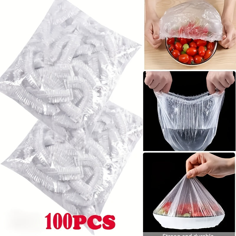 100 штук эластичных крышек для еды - одноразовые пластиковые пакеты, предназначенные для сохранения свежести, идеально подходят для использования на кухнях и в ресторанах.