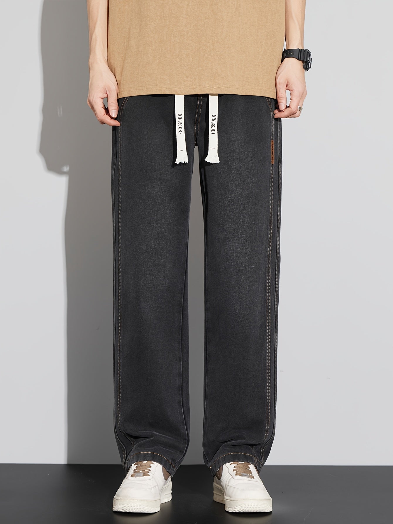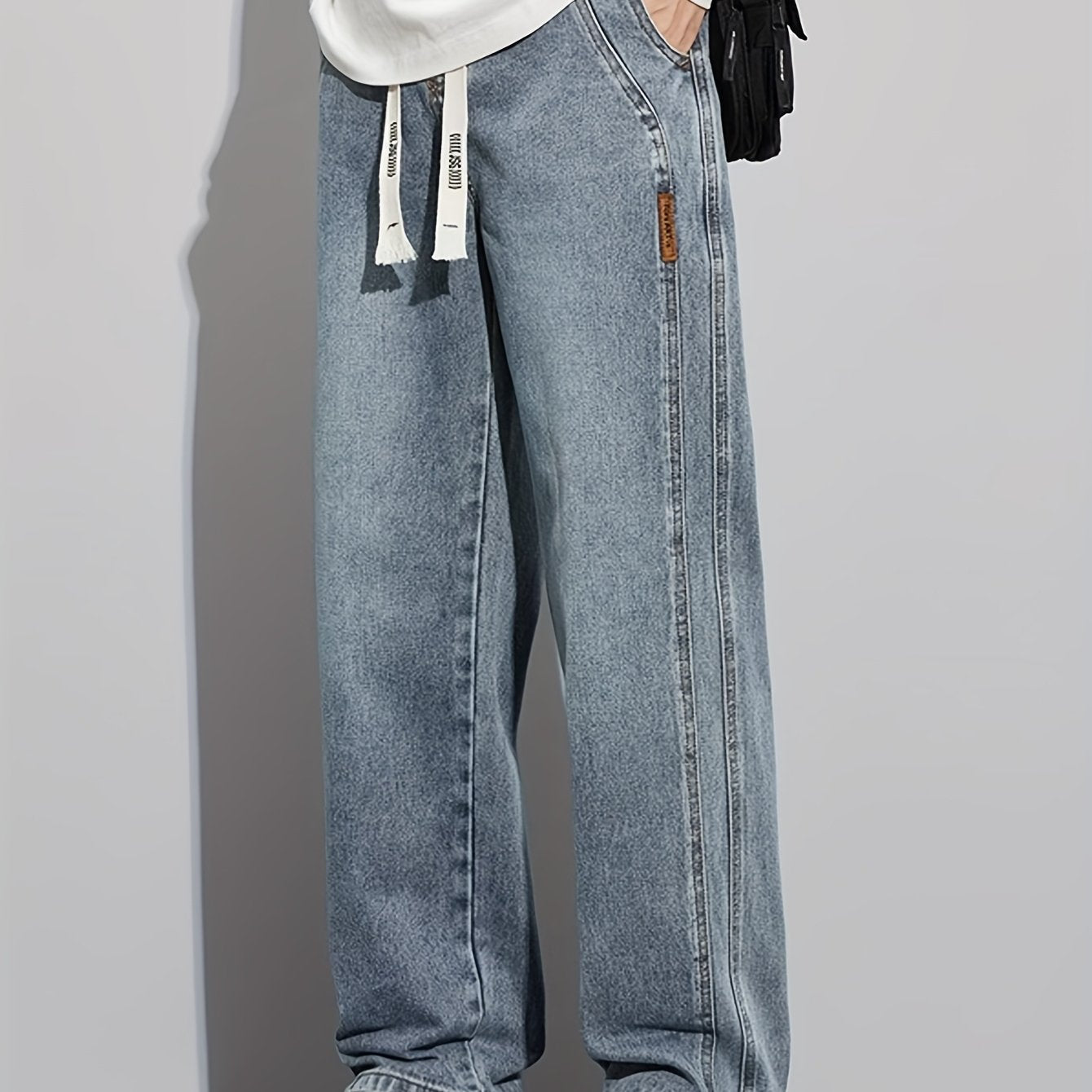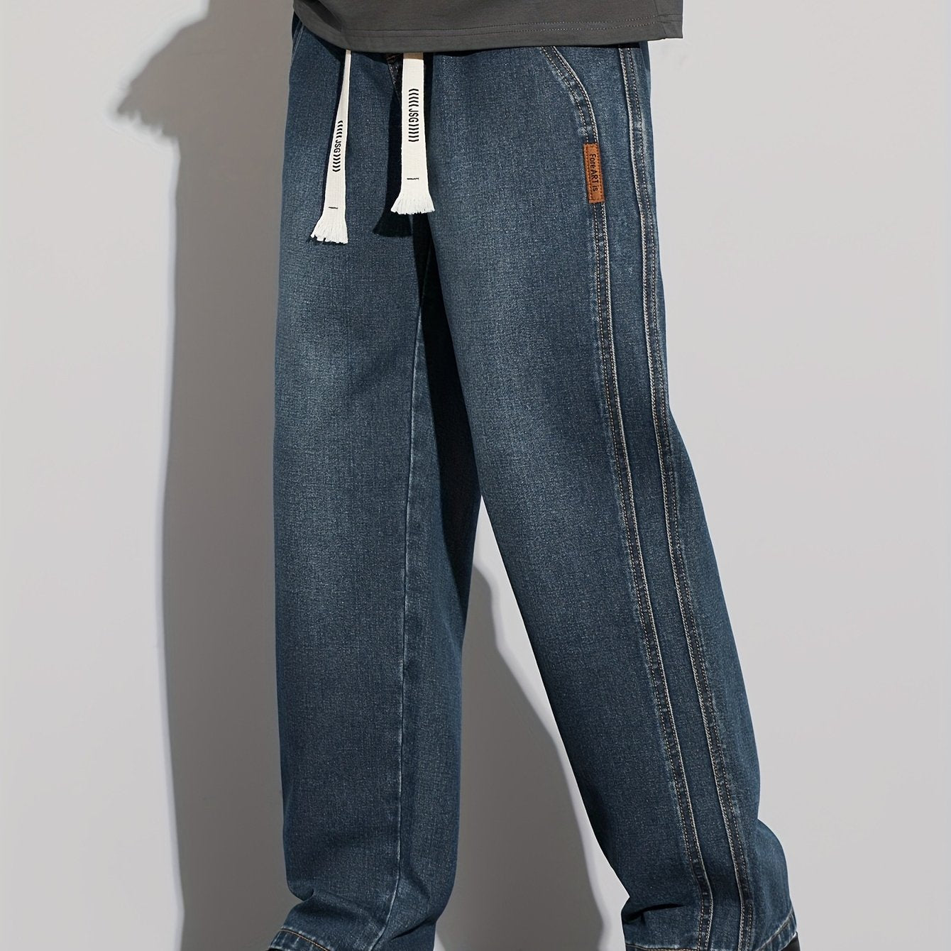 Мужские повседневные джинсы из денима свободного кроя с средней посадкой, на шнурке, для всех сезонов, из хлопково-полиэфирной смеси, однотонные