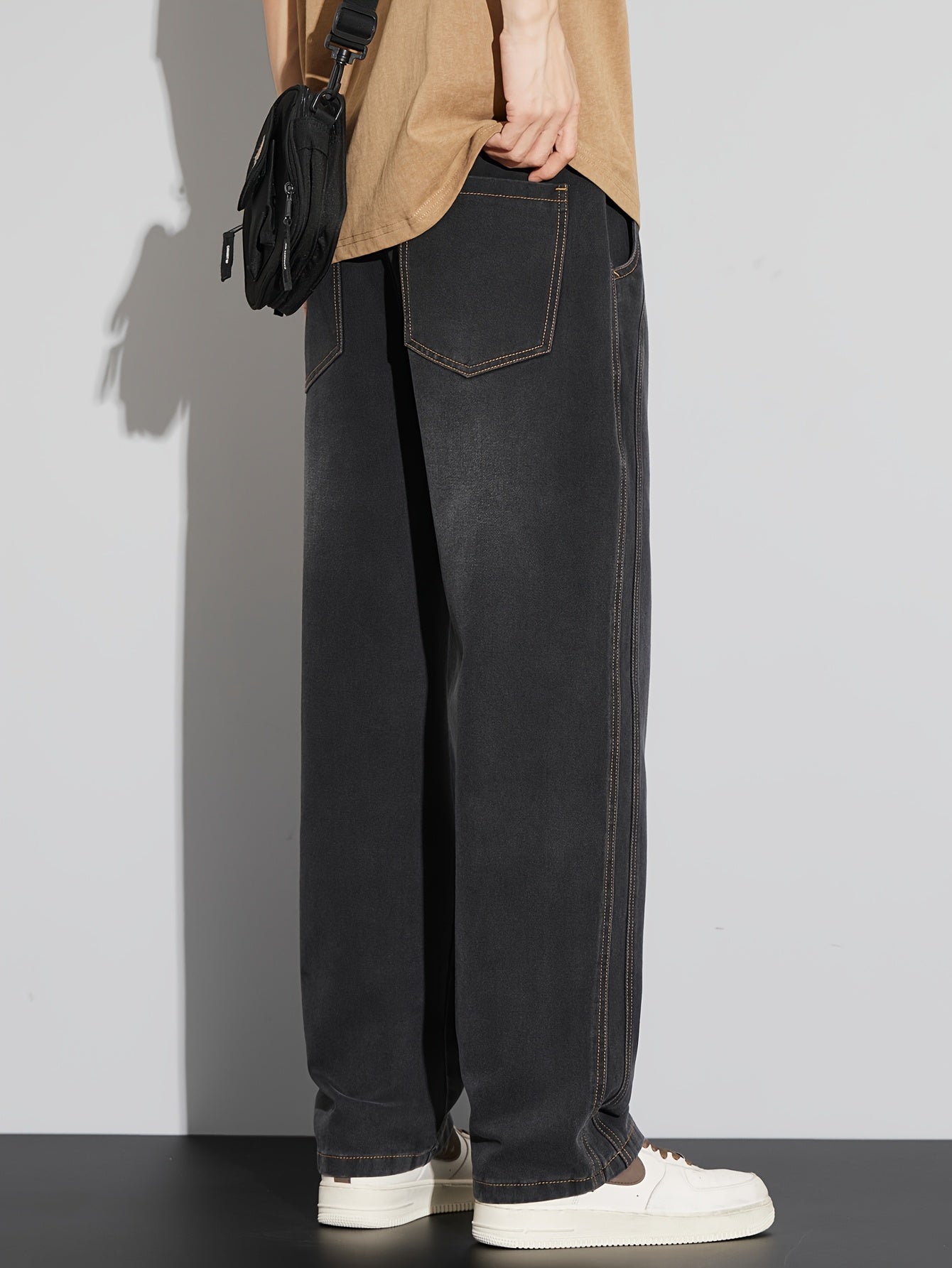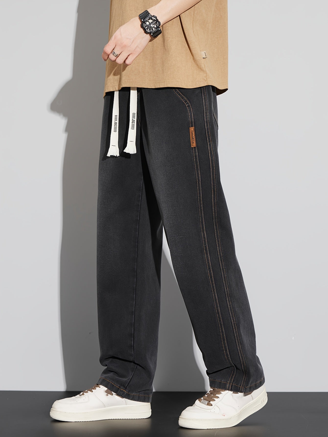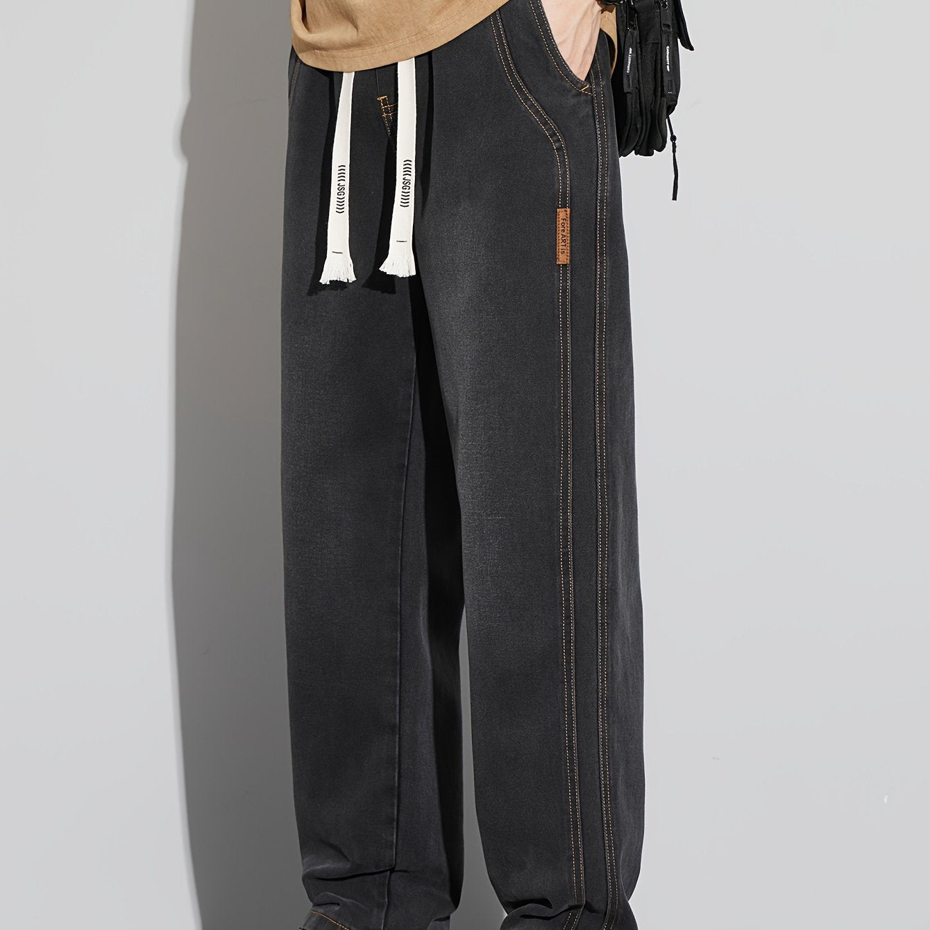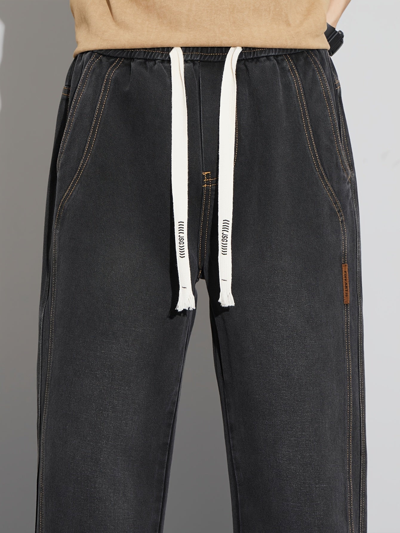 Мужские повседневные джинсы из денима свободного кроя с средней посадкой, на шнурке, для всех сезонов, из хлопково-полиэфирной смеси, однотонные