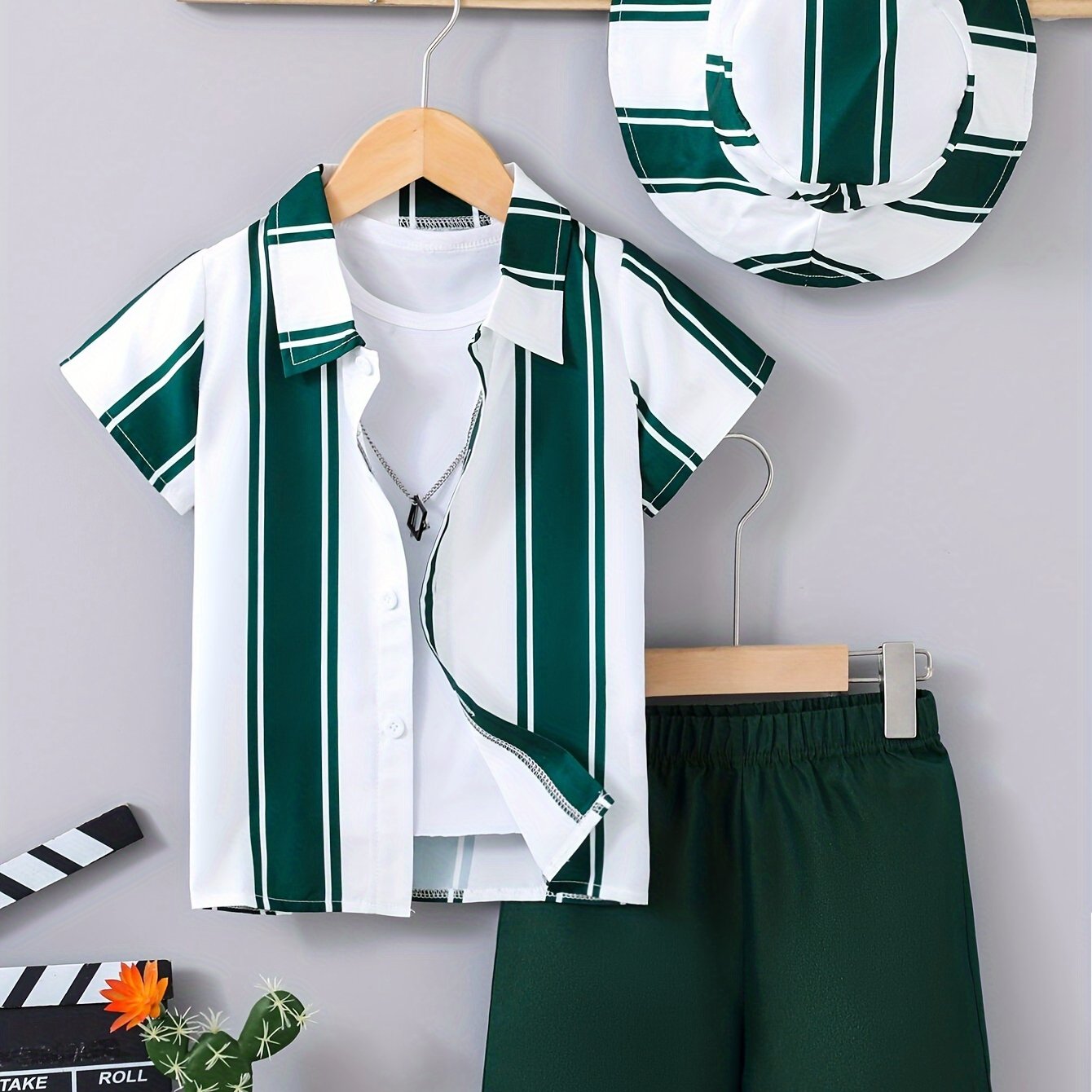 Детский летний костюм для мальчиков, 3 предмета: полосатая рубашка, шорты, шляпа, полиэстер, повседневный